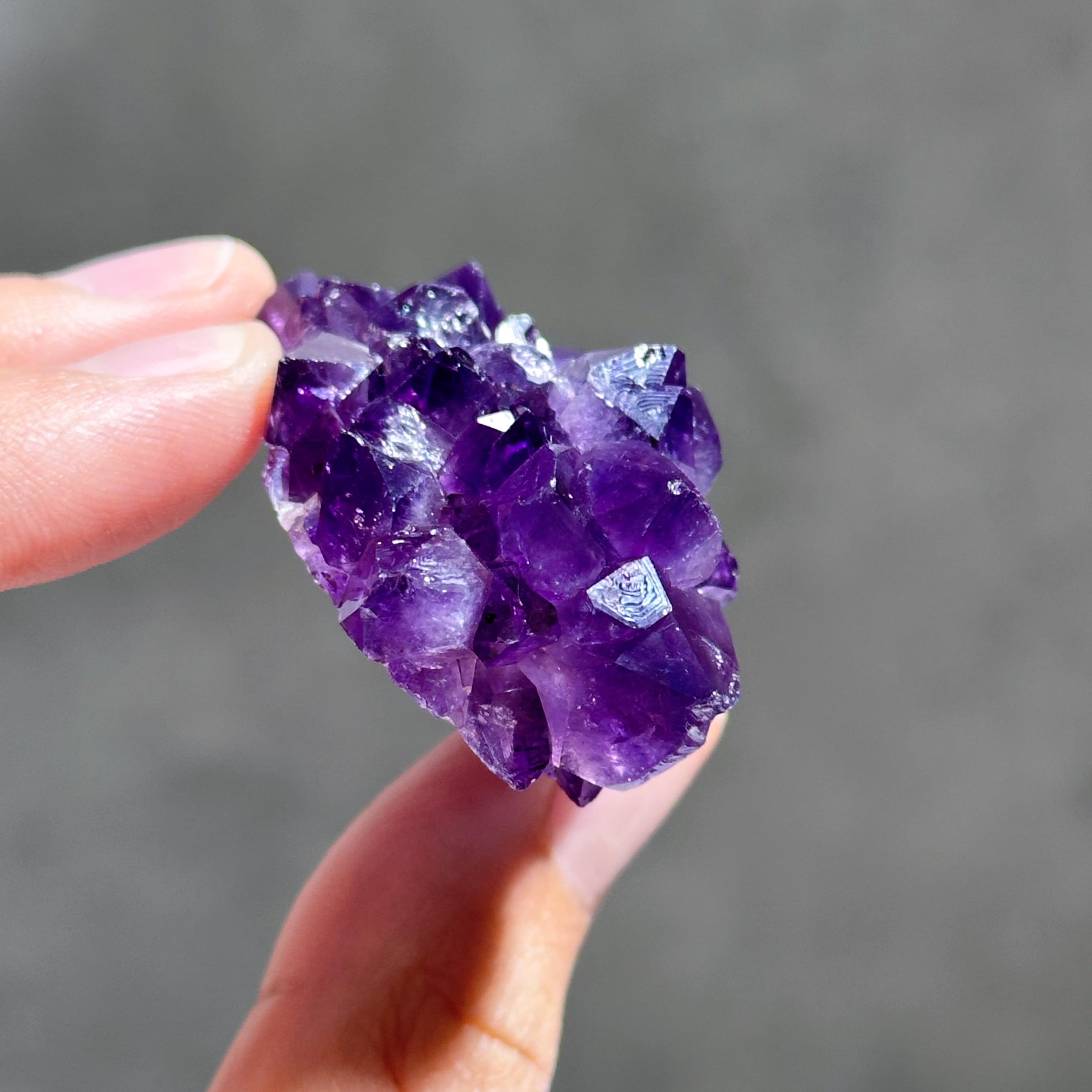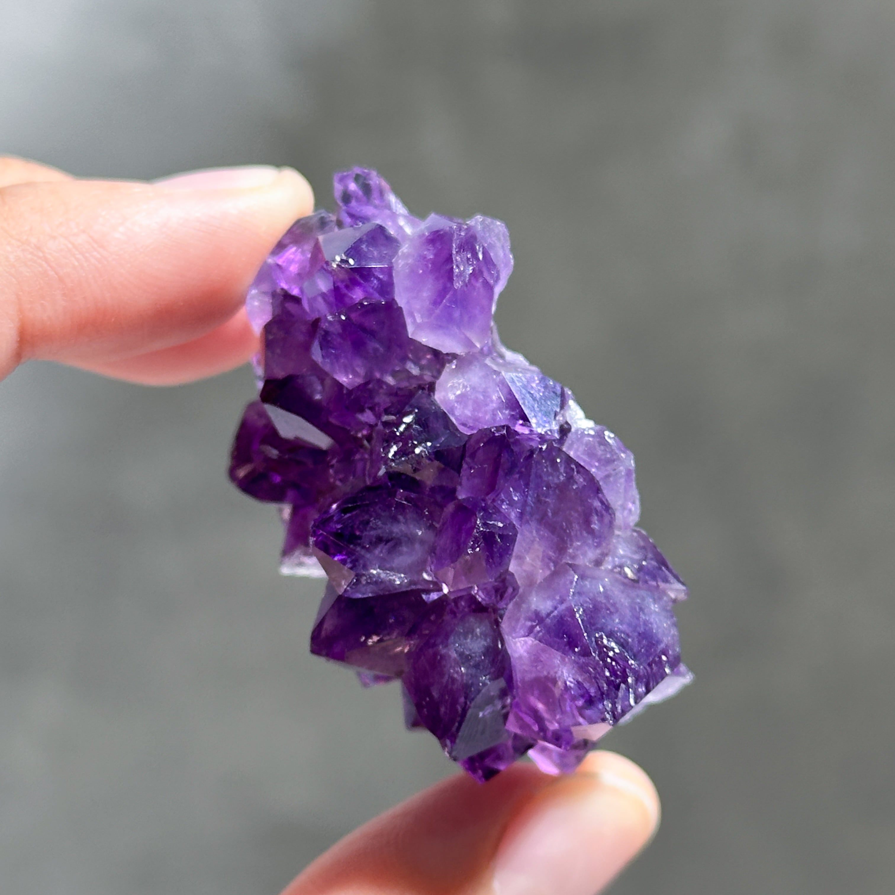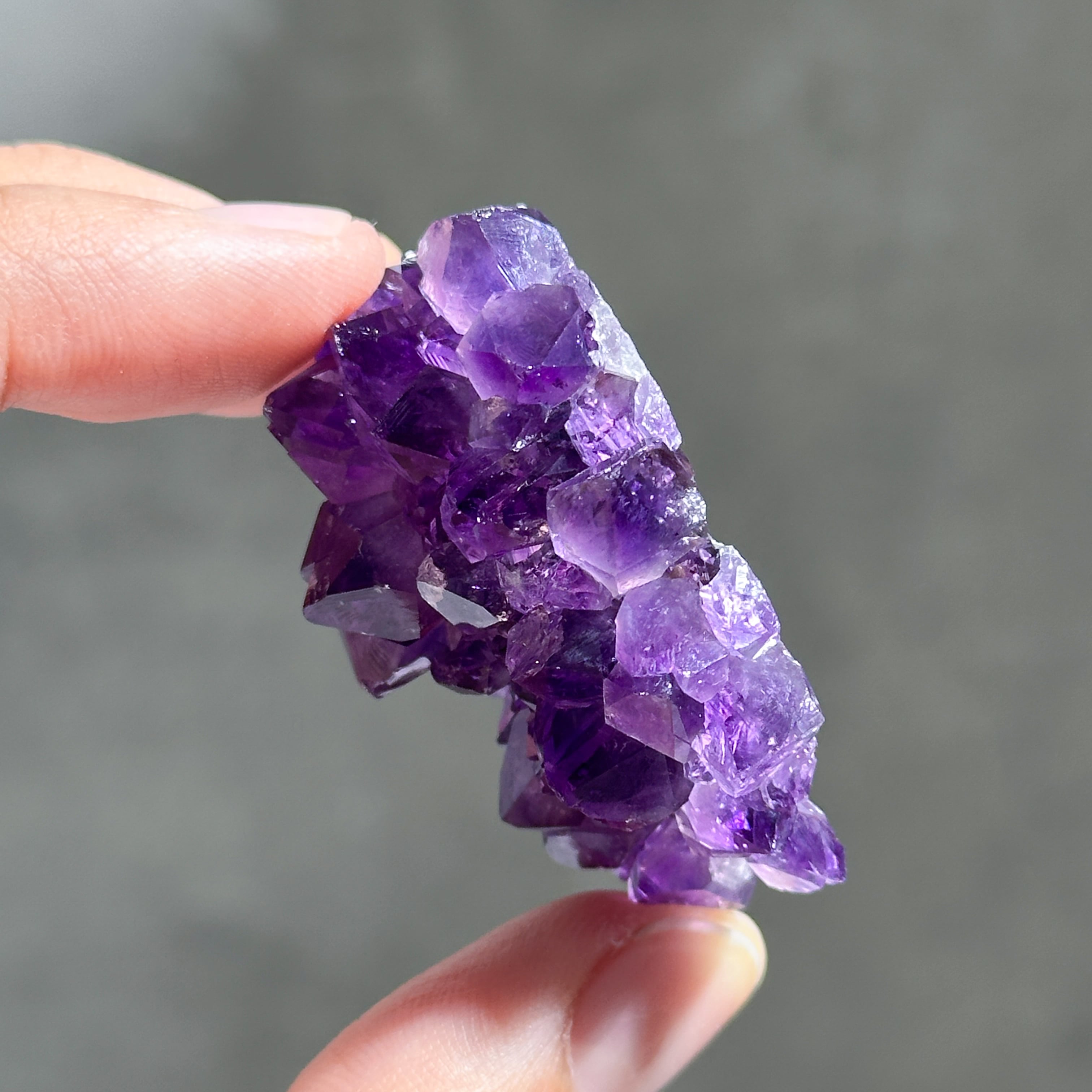 水晶の色変種であるアメジストは、結晶内に取り込まれた鉄分の量によって淡いピンク色〜濃い紫色となります。