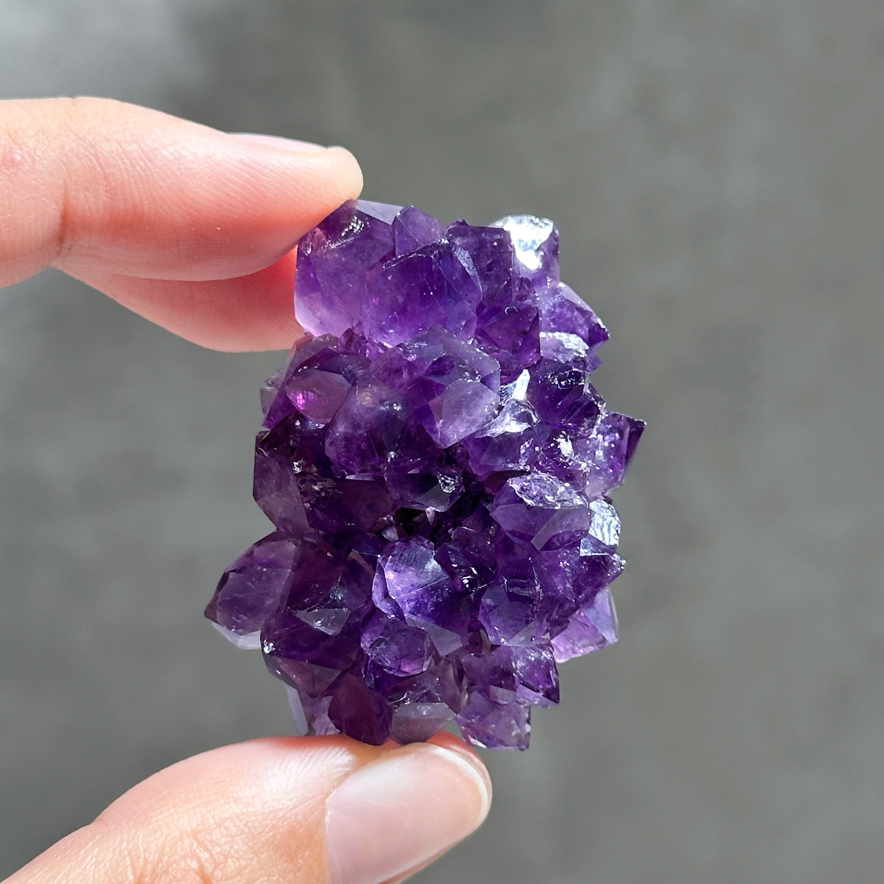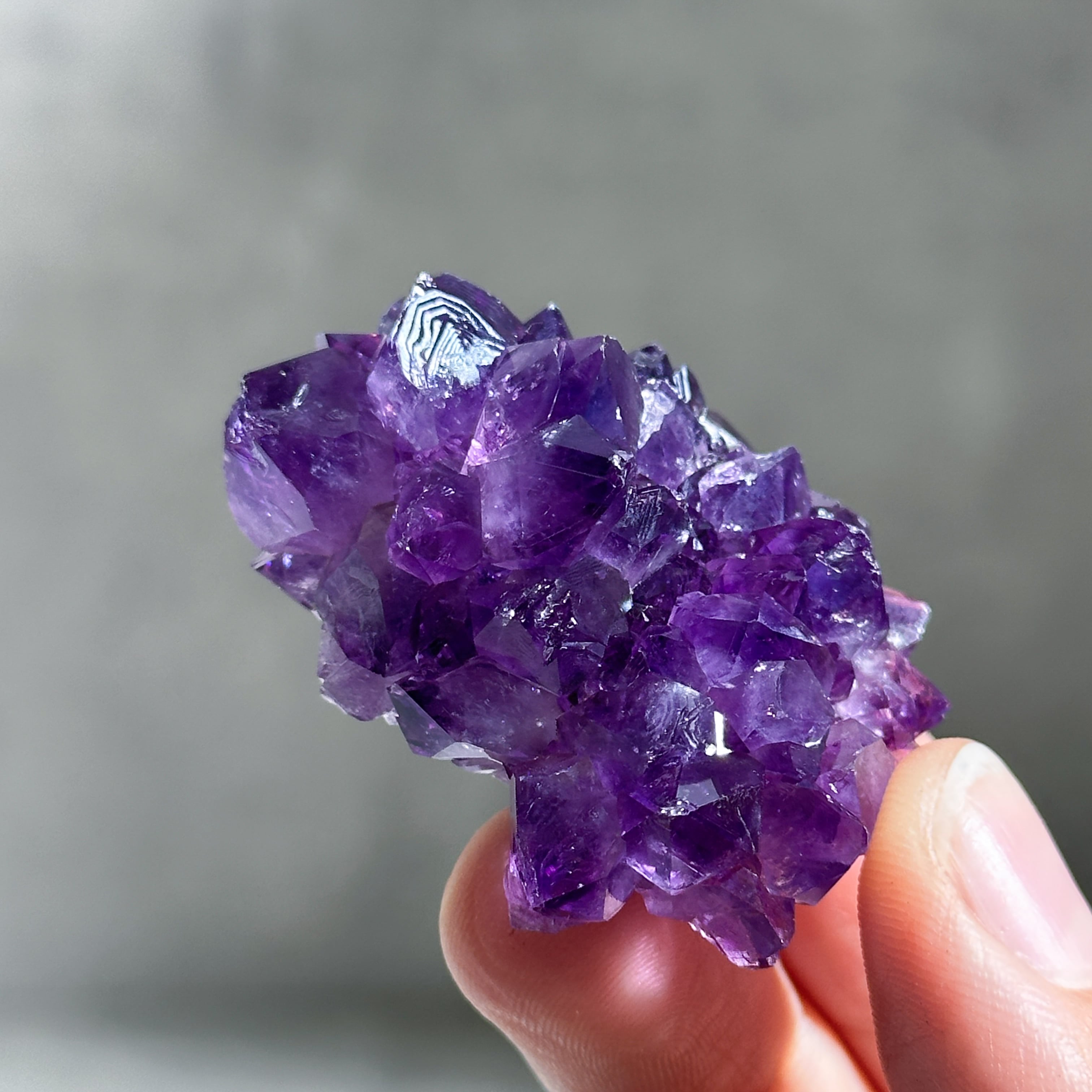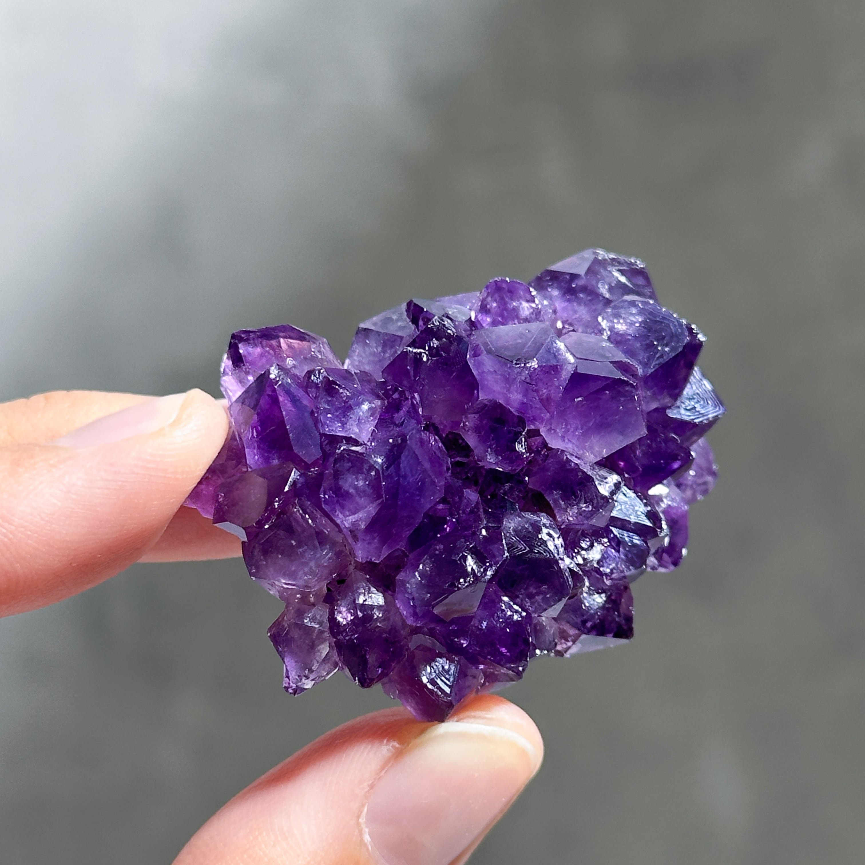 水晶の色変種であるアメジストは、結晶内に取り込まれた鉄分の量によって淡いピンク色〜濃い紫色となります。