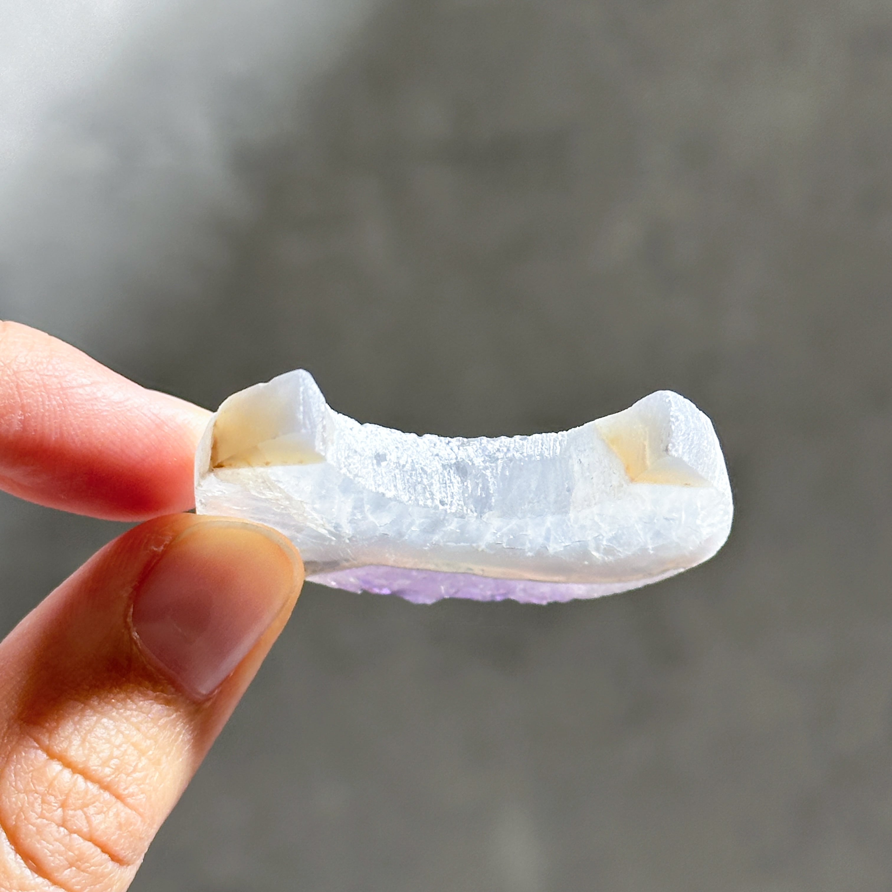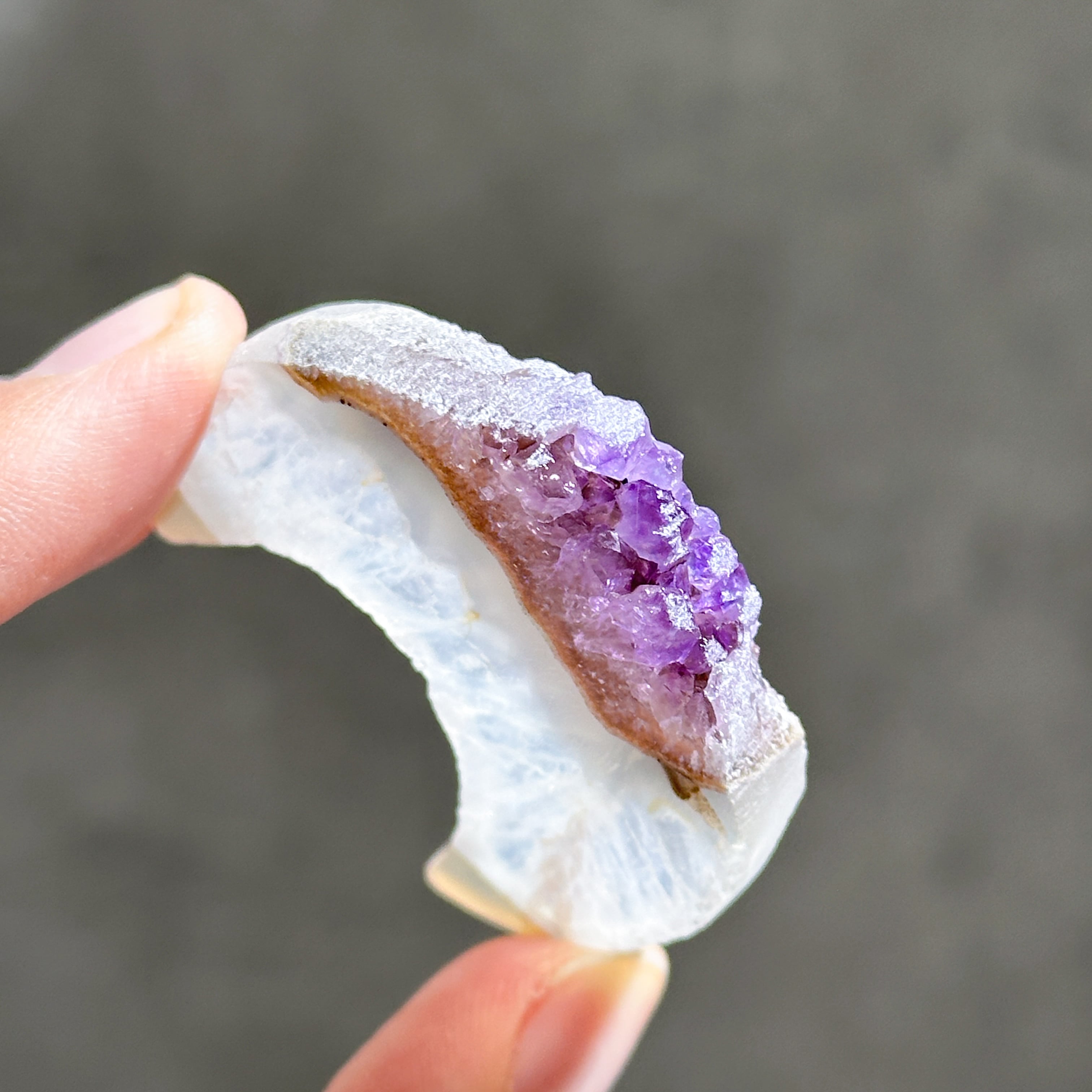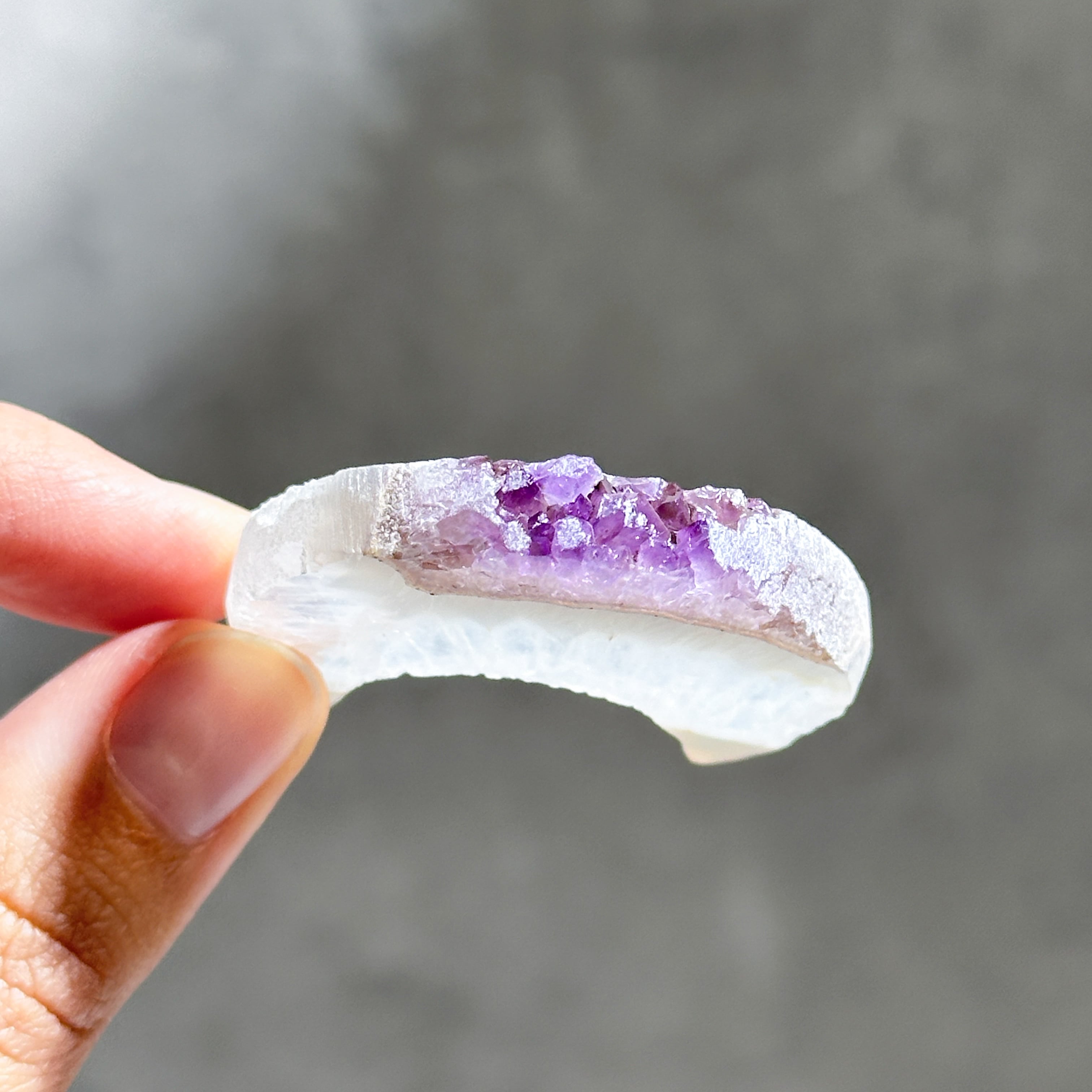 アゲート(瑪瑙)上にアメジストが結晶化した原石をスライスし、