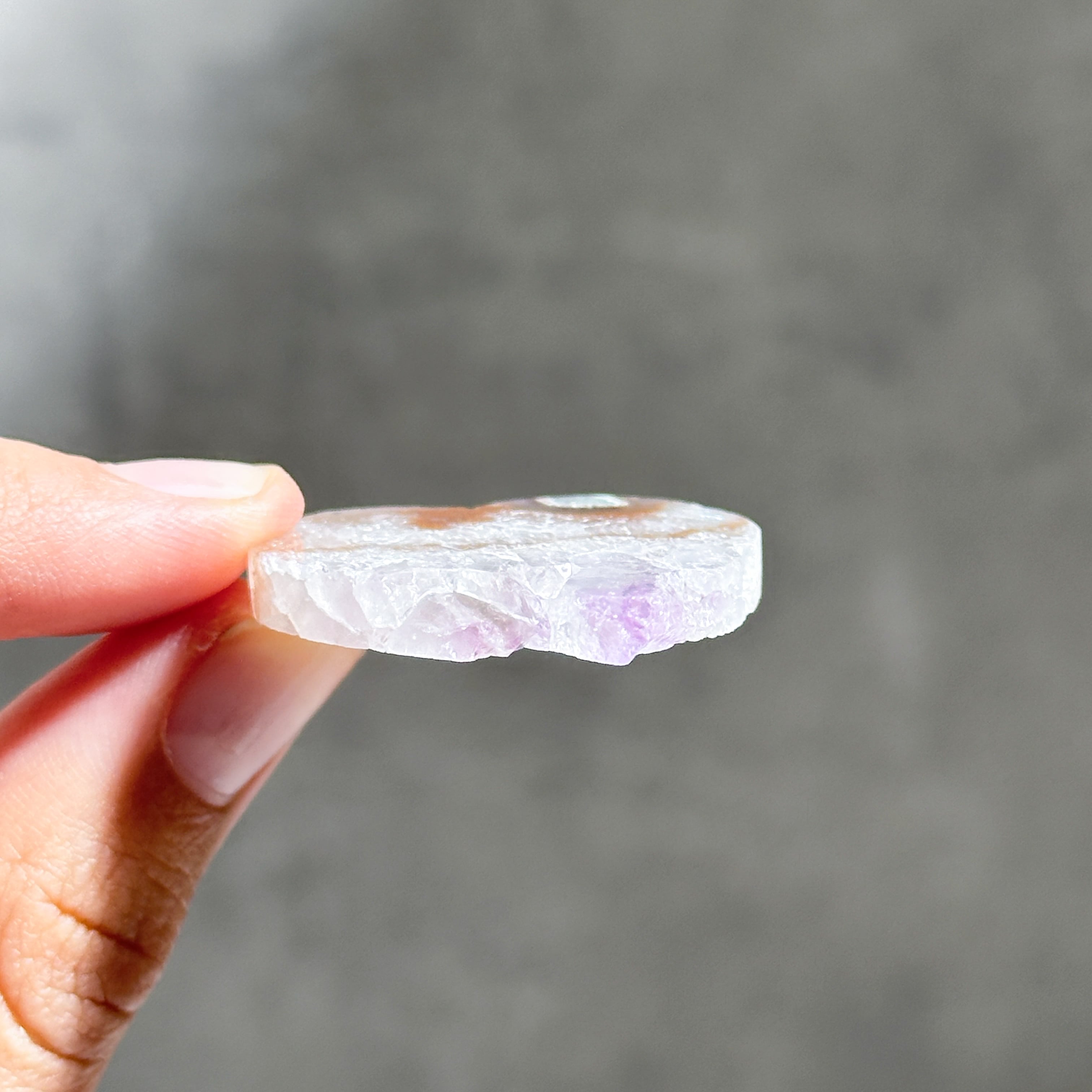 アゲート(瑪瑙)上にアメジストが結晶化した原石をスライスし、