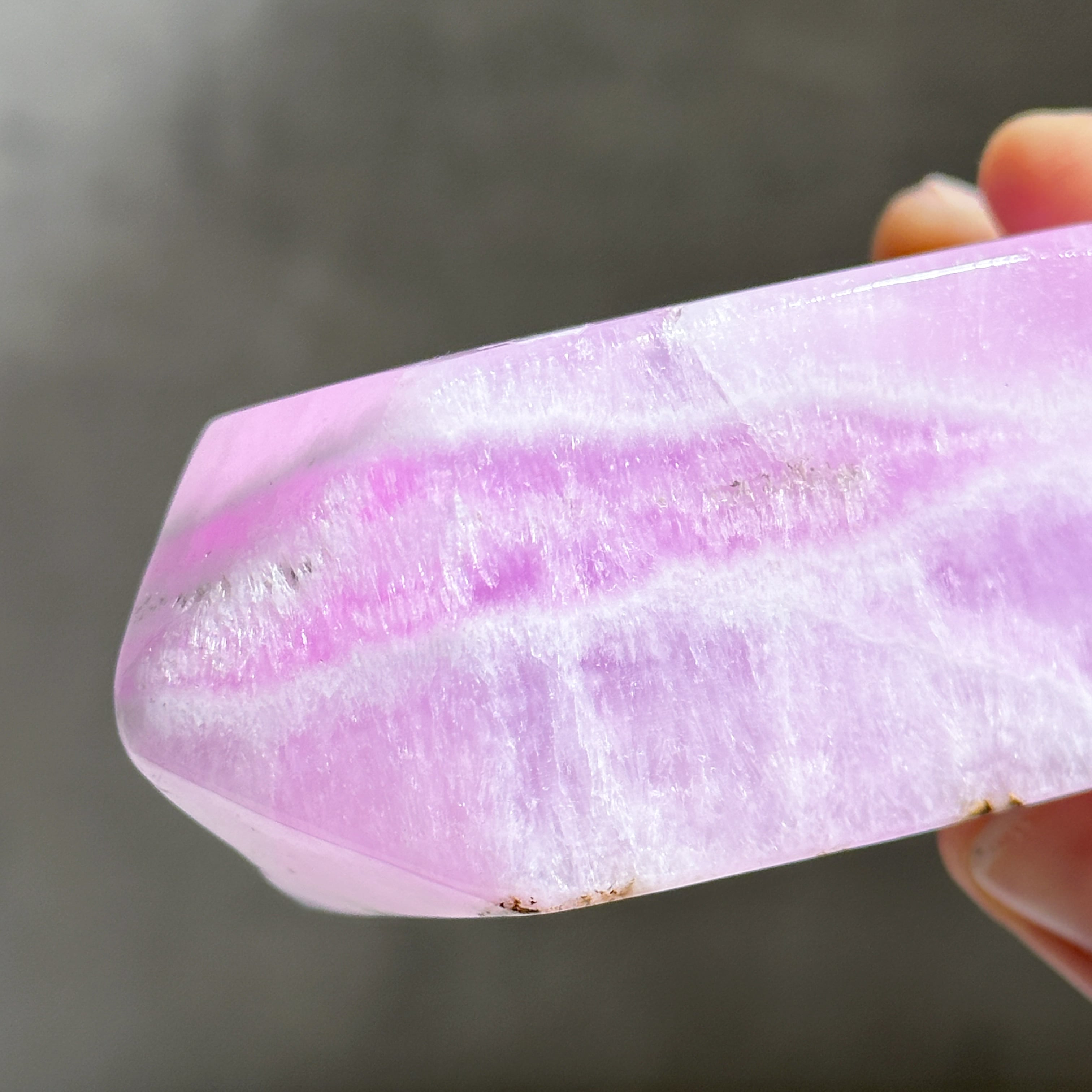 白色の部分も同じアラゴナイトです。アラゴナイト自体は世界中で産出する石ですが、このように、白とピンクが混じったものは、最近パキスタンで採掘されるようになったようで、他に類を見ない非常に珍しいものです✧