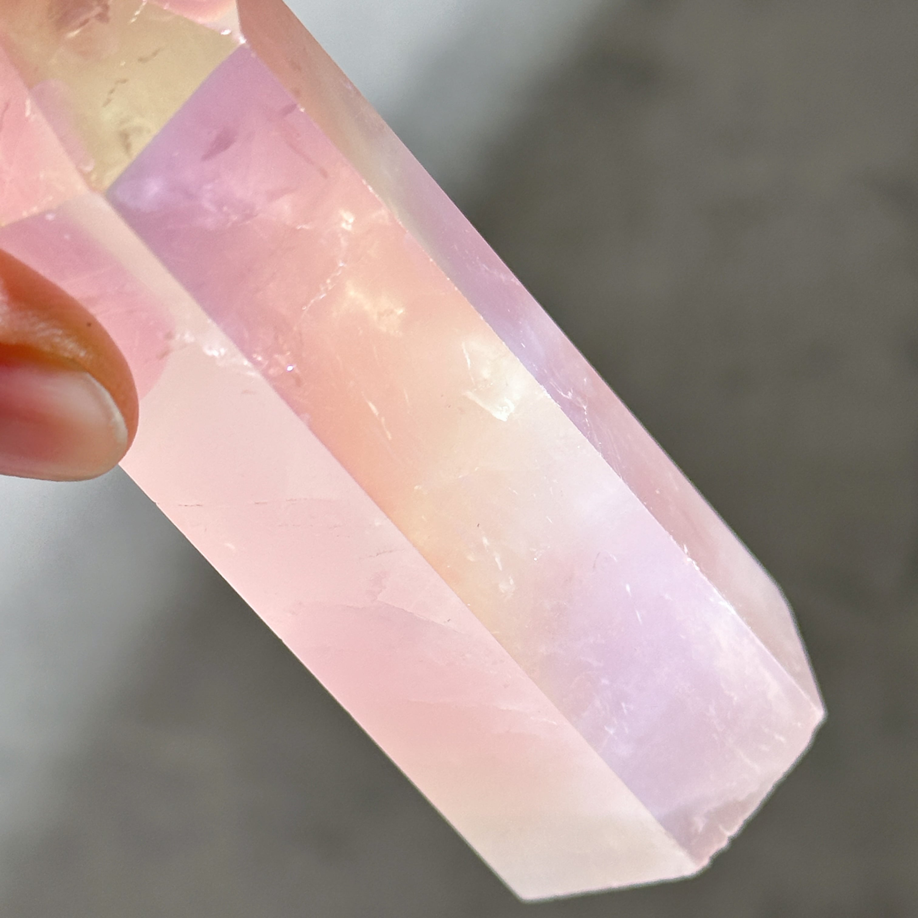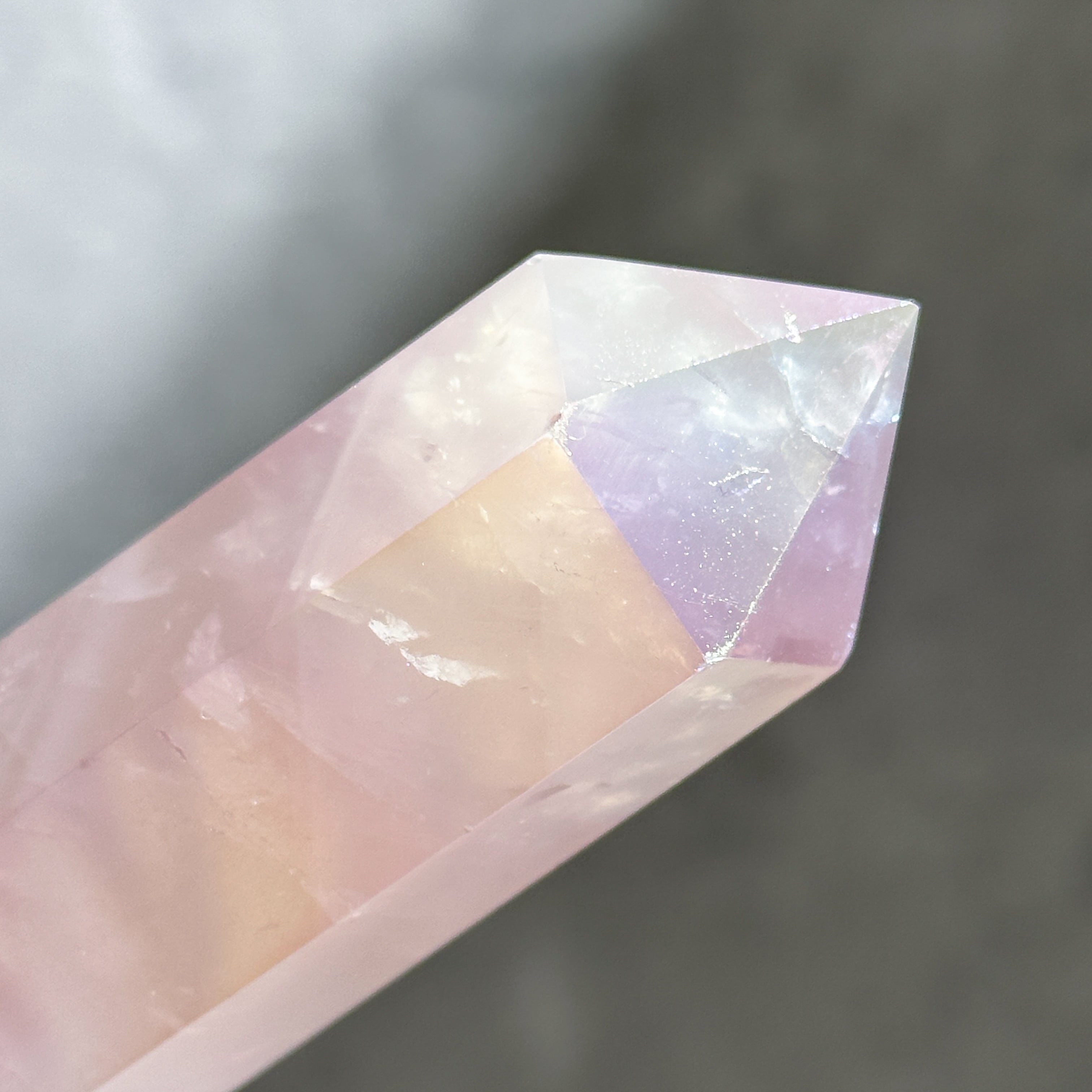 オーラクォーツとは天然の水晶に真空状態で金属を癒着コーティングさせた、新時代のクリスタルです。本品はローズクォーツのタワーに、エンジェルオーラ加工を施したもの◎