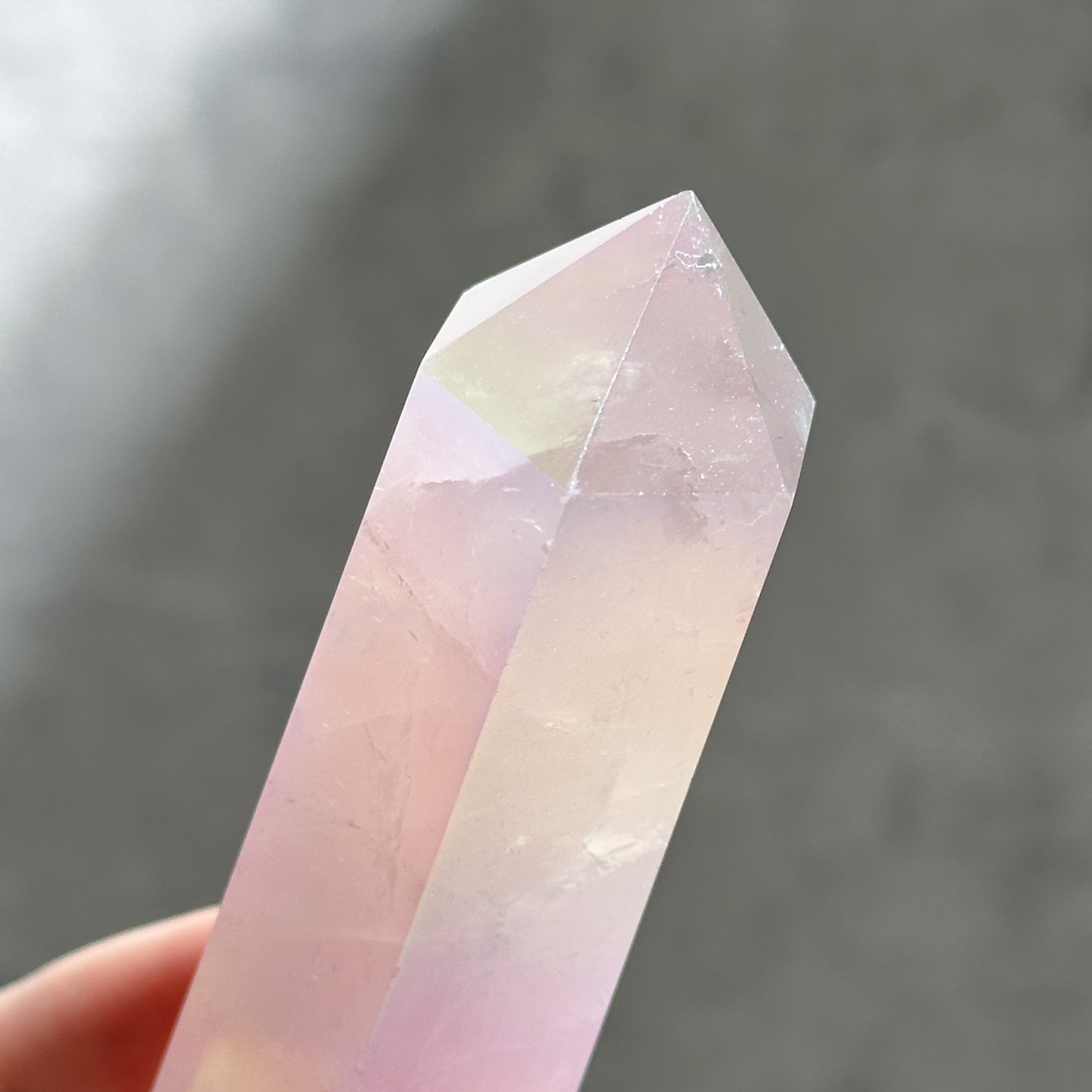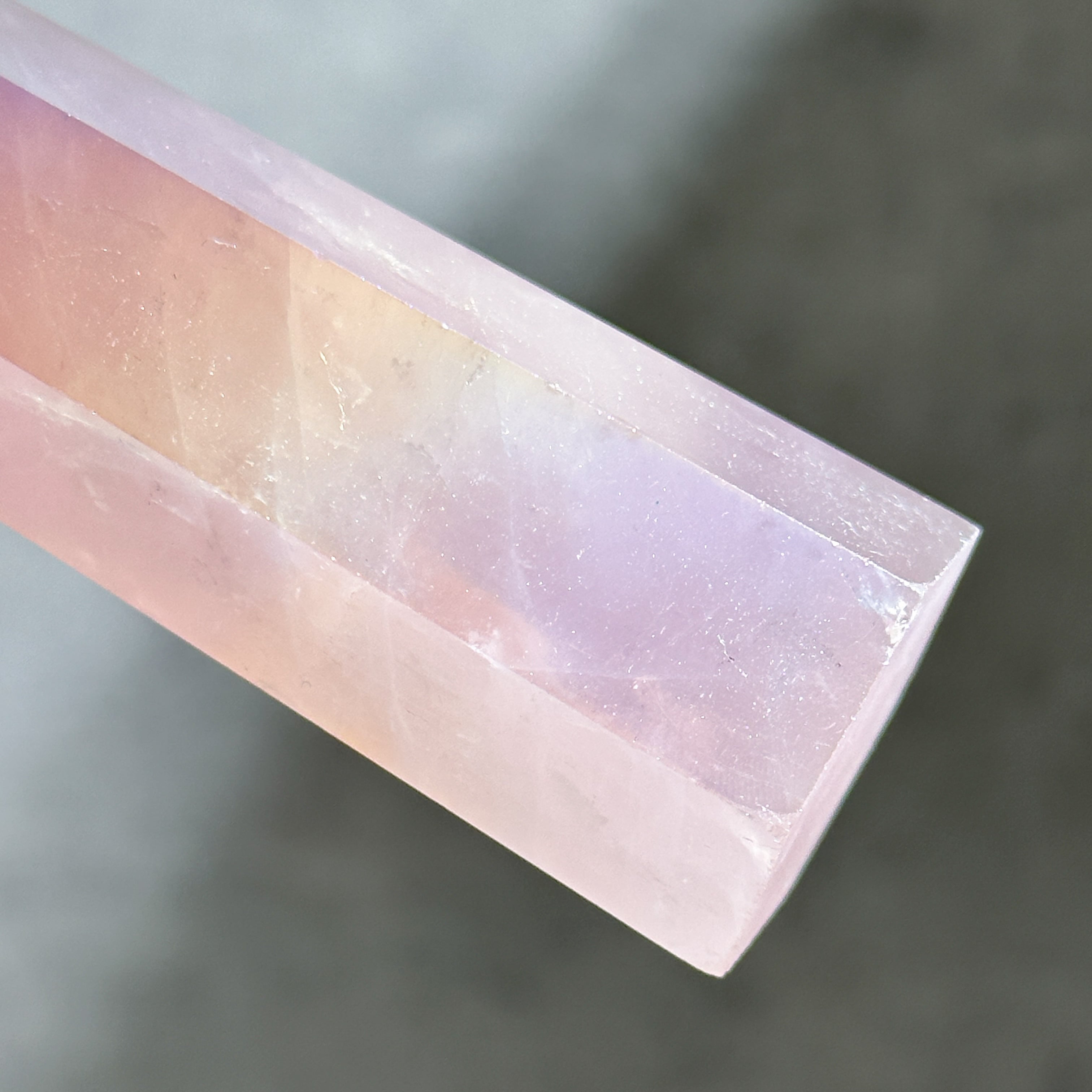 オーラクォーツとは天然の水晶に真空状態で金属を癒着コーティングさせた、新時代のクリスタルです。本品はローズクォーツのタワーに、エンジェルオーラ加工を施したもの◎