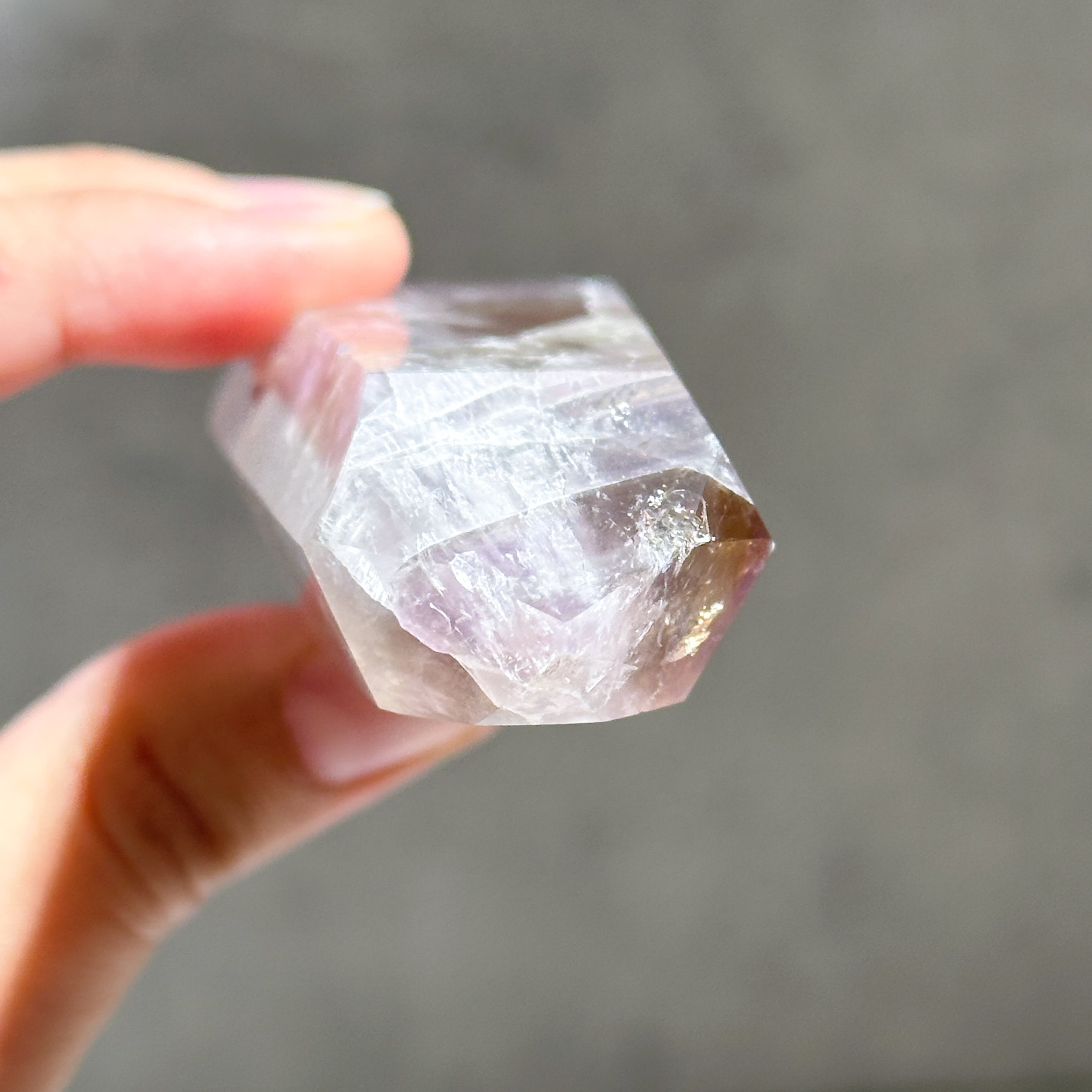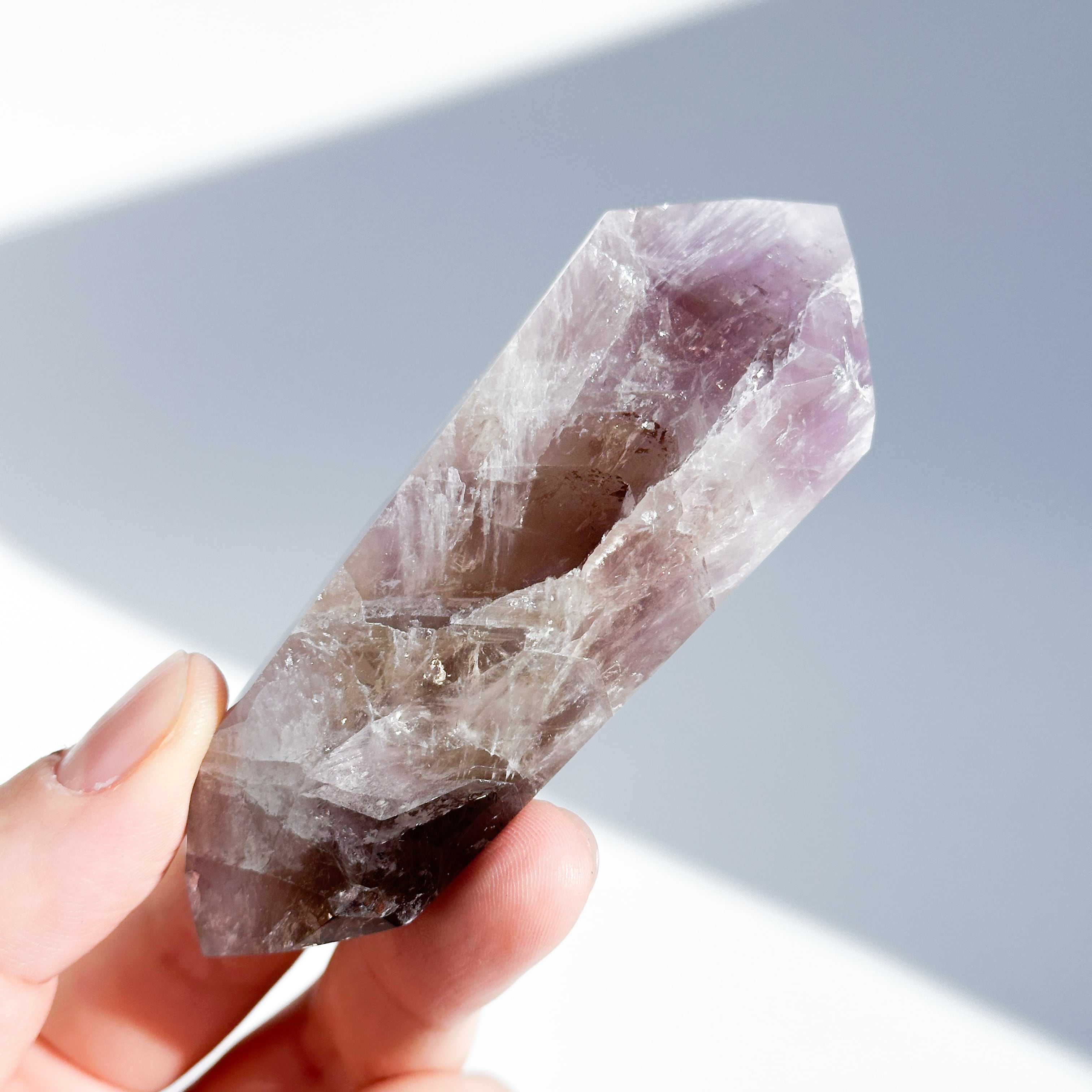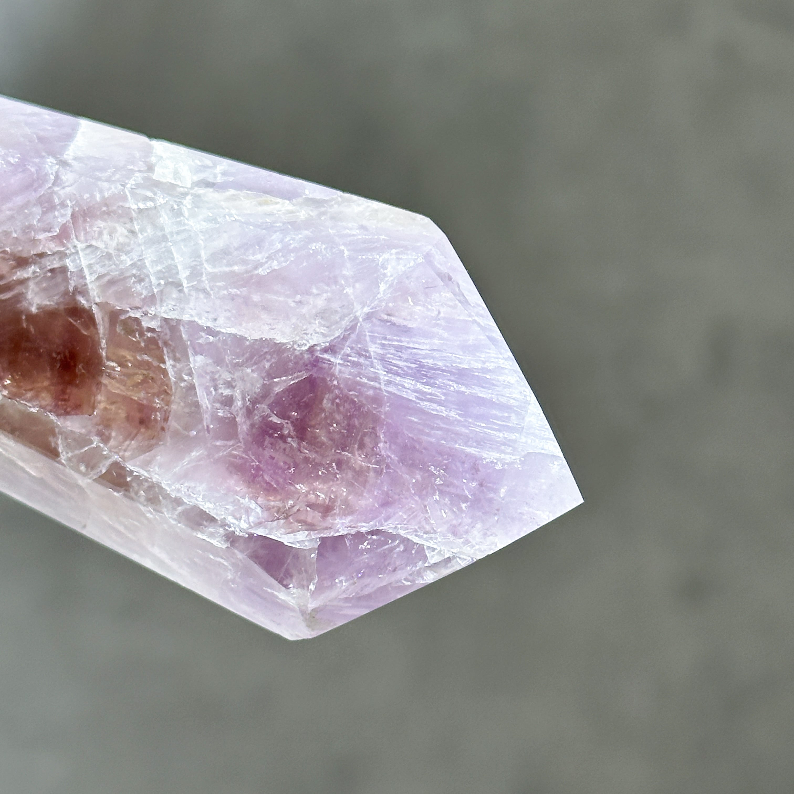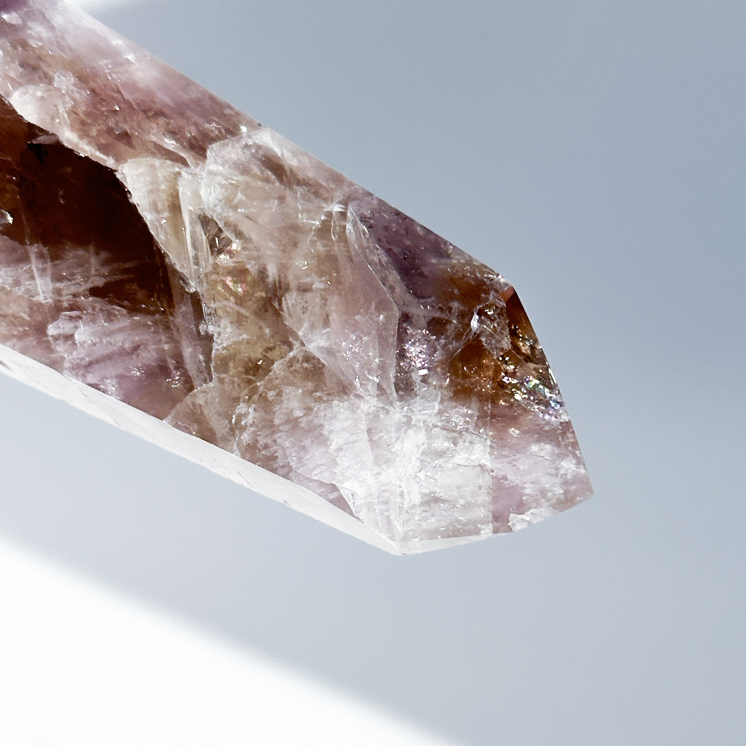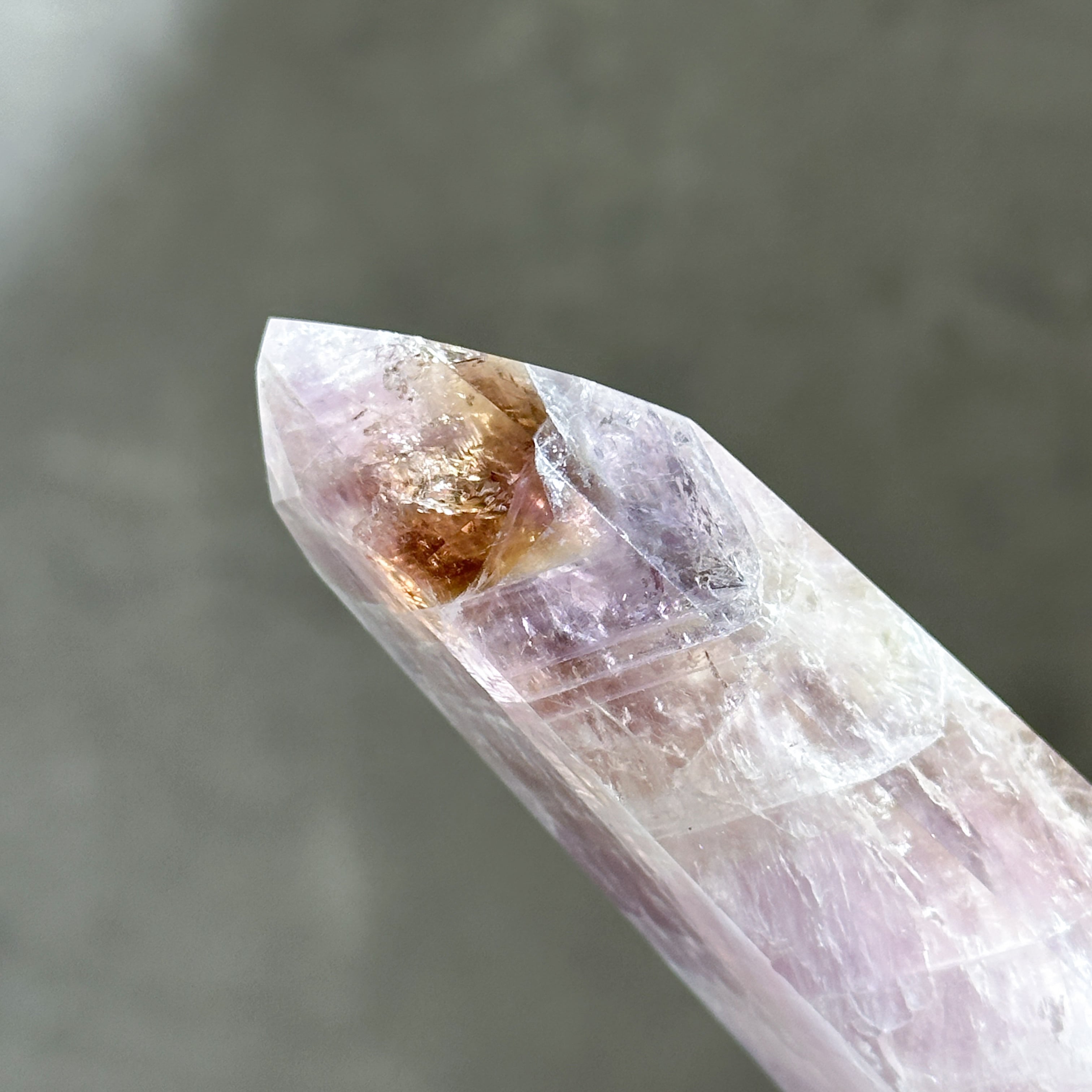 目視ではアメジスト、クリアクォーツ、スモーキークォーツが確認でき、それぞれが一つの石の中で混ざり合ったり、線状に切り替わったりし、非常に個性的な造形を作り上げています。