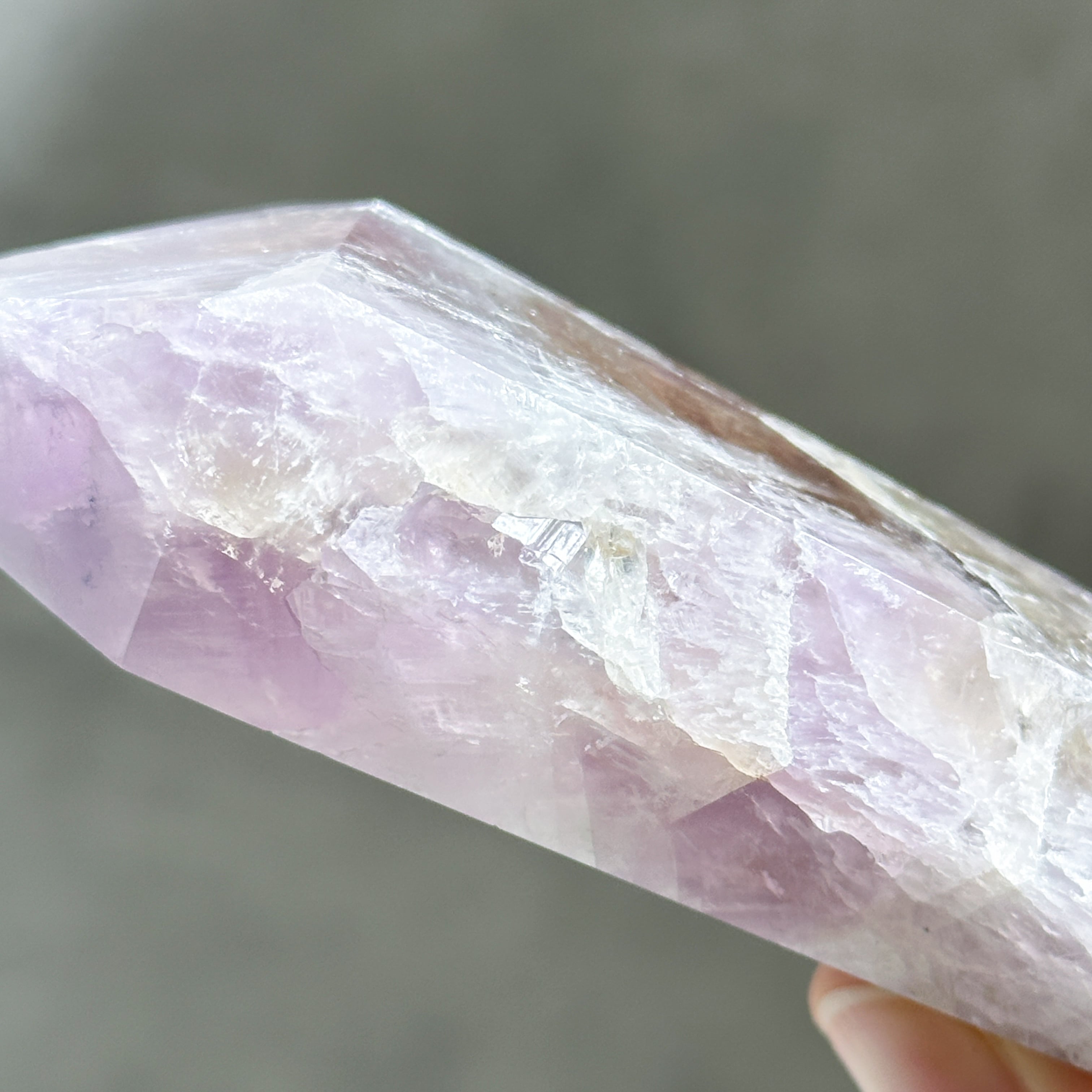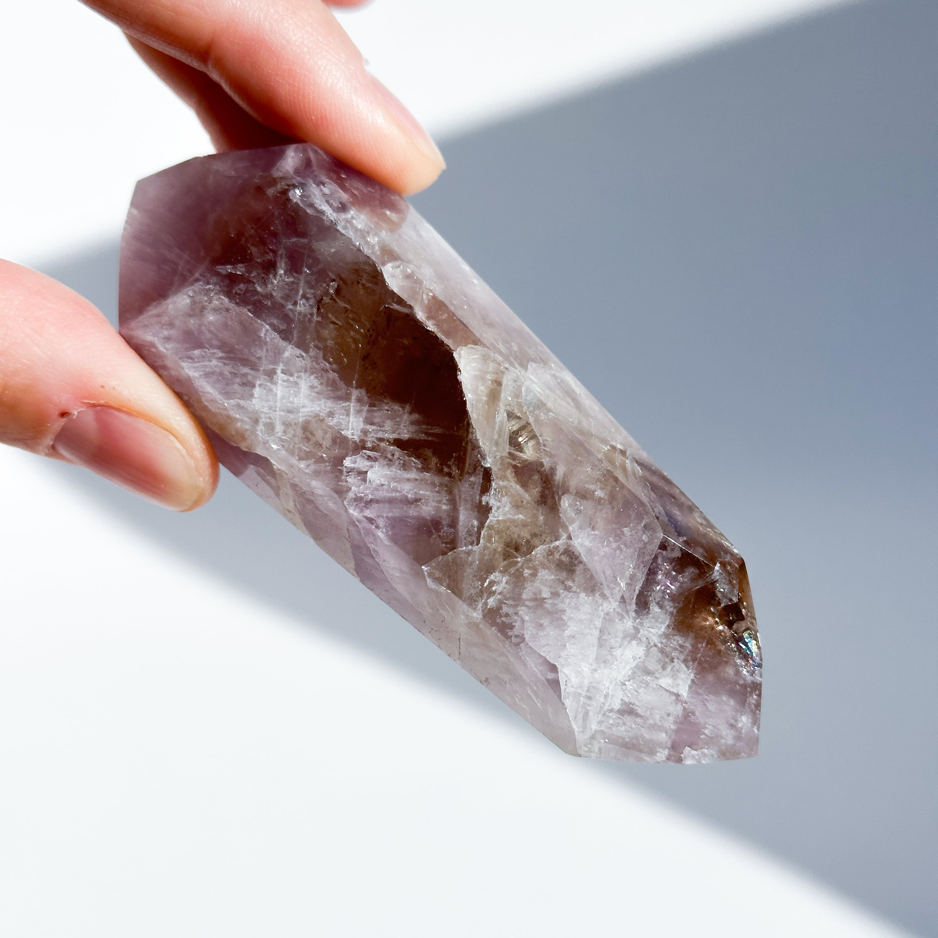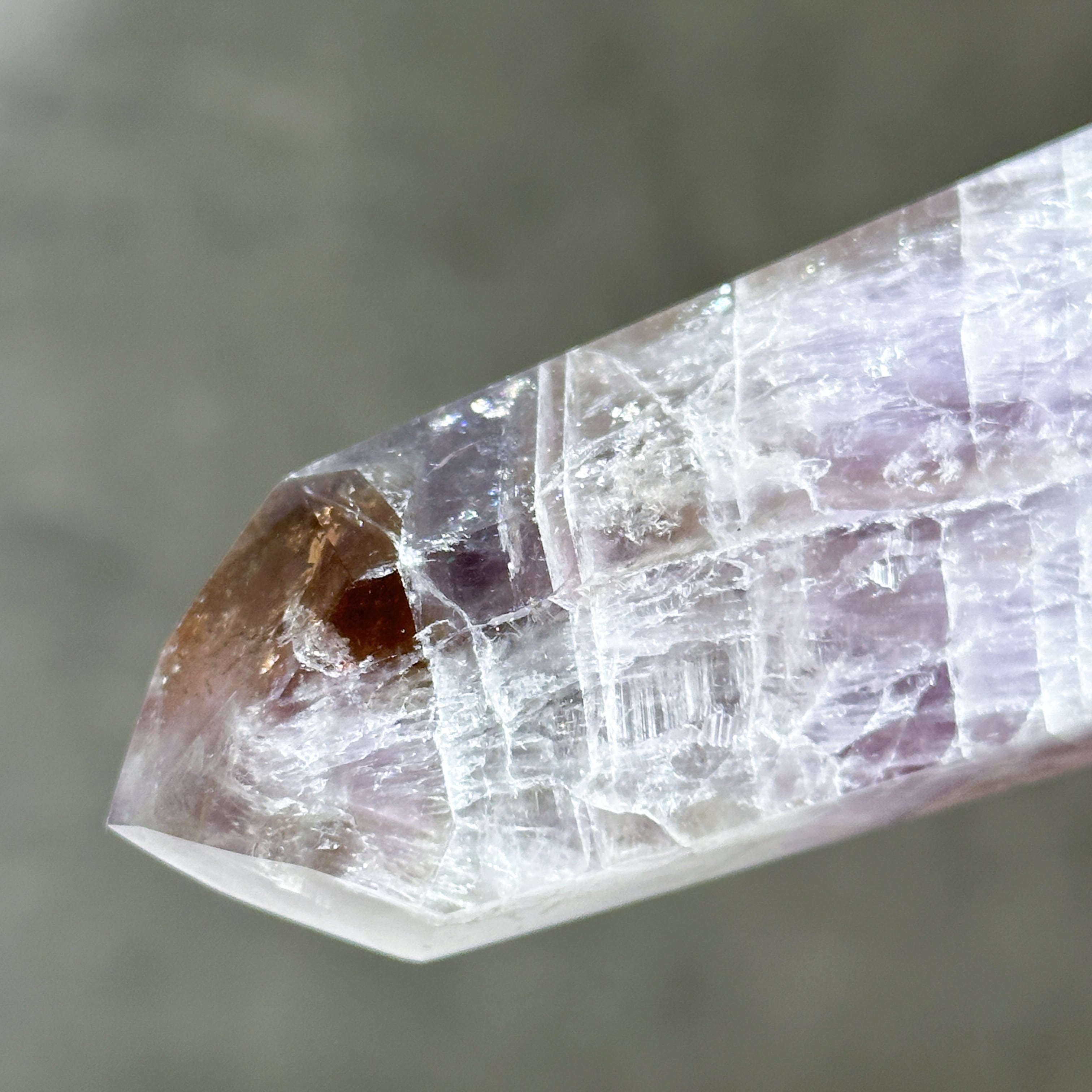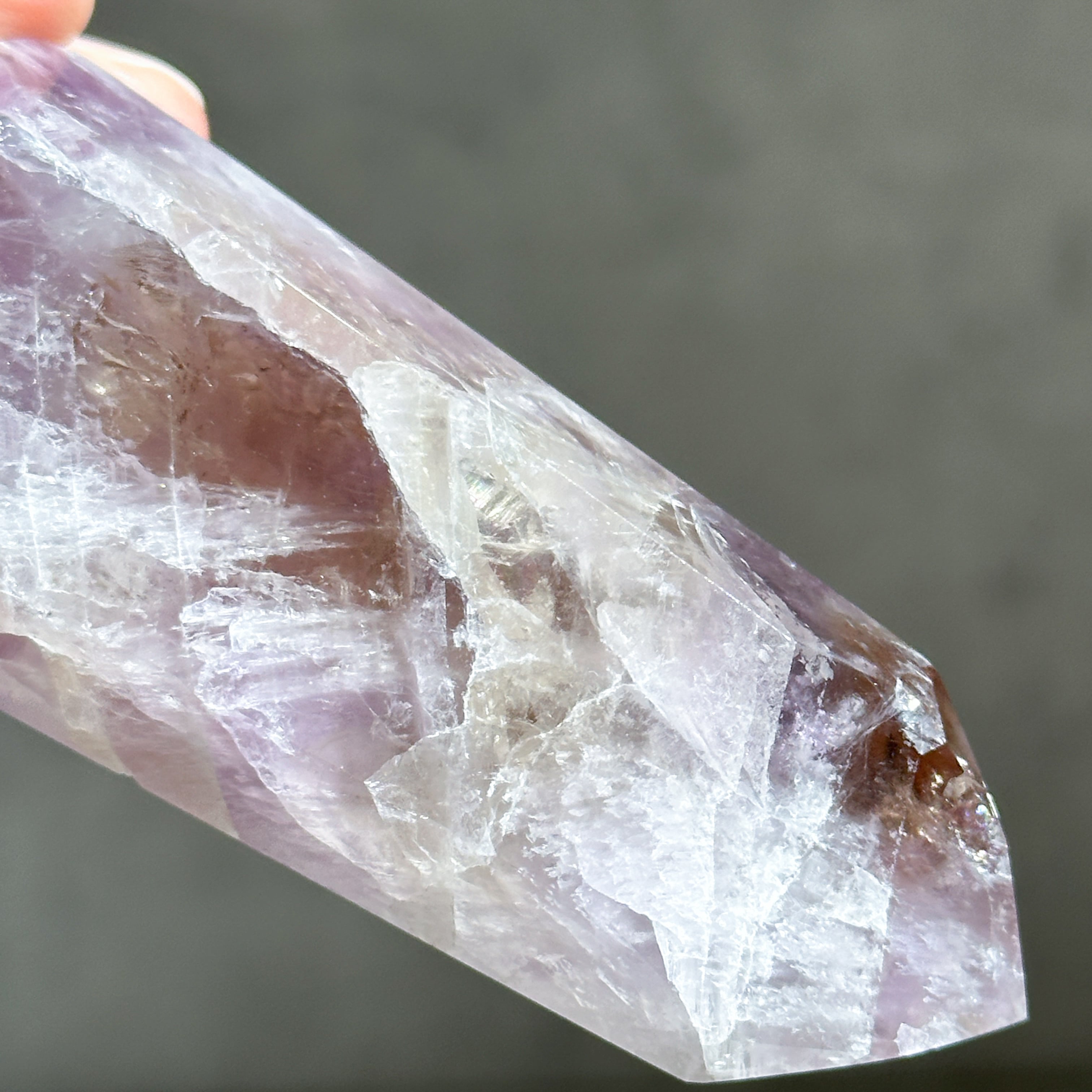 目視ではアメジスト、クリアクォーツ、スモーキークォーツが確認でき、それぞれが一つの石の中で混ざり合ったり、線状に切り替わったりし、非常に個性的な造形を作り上げています。