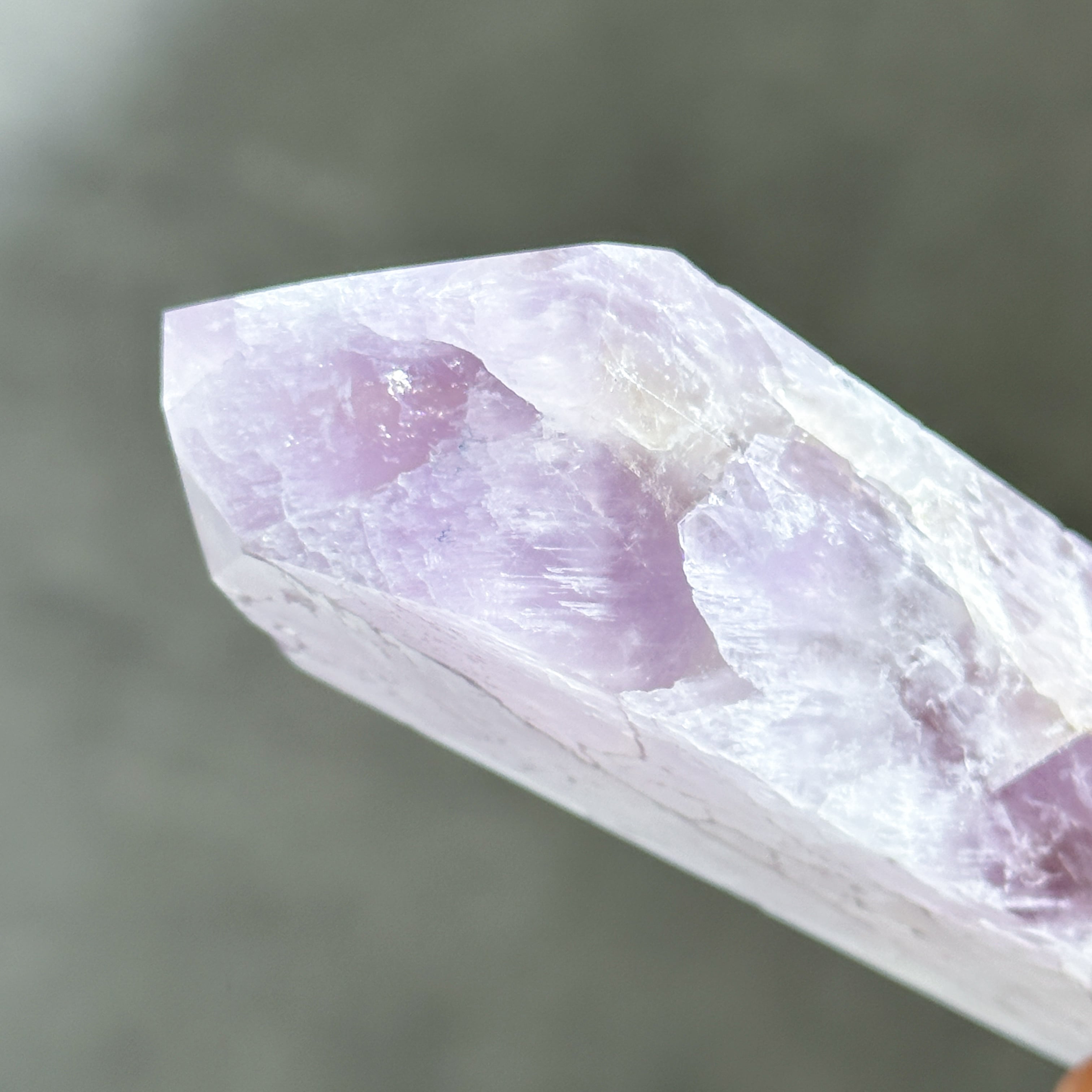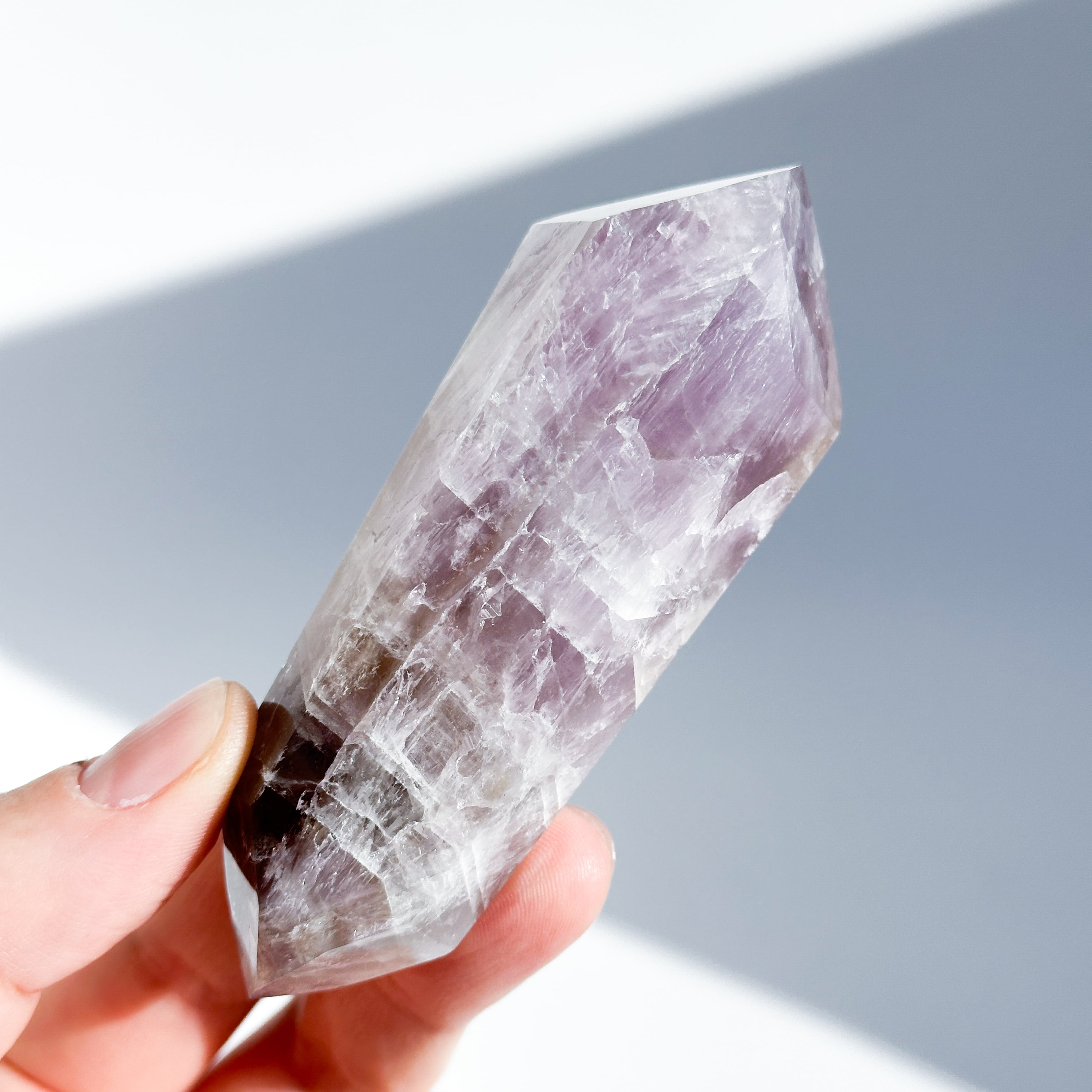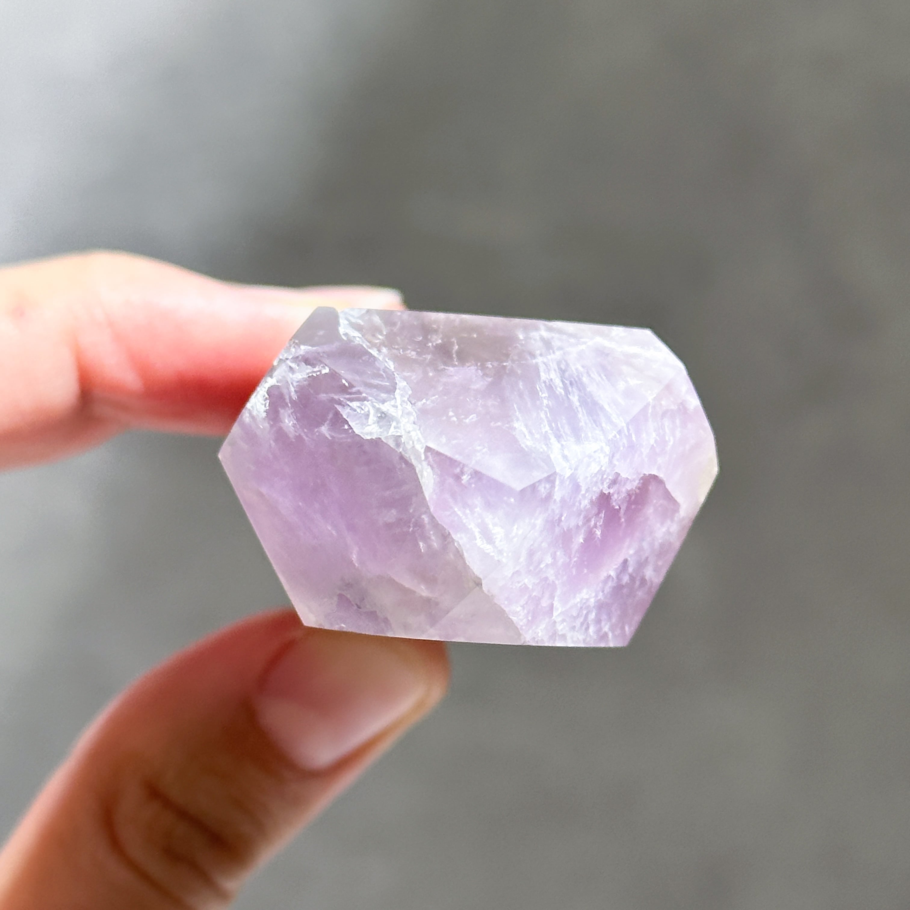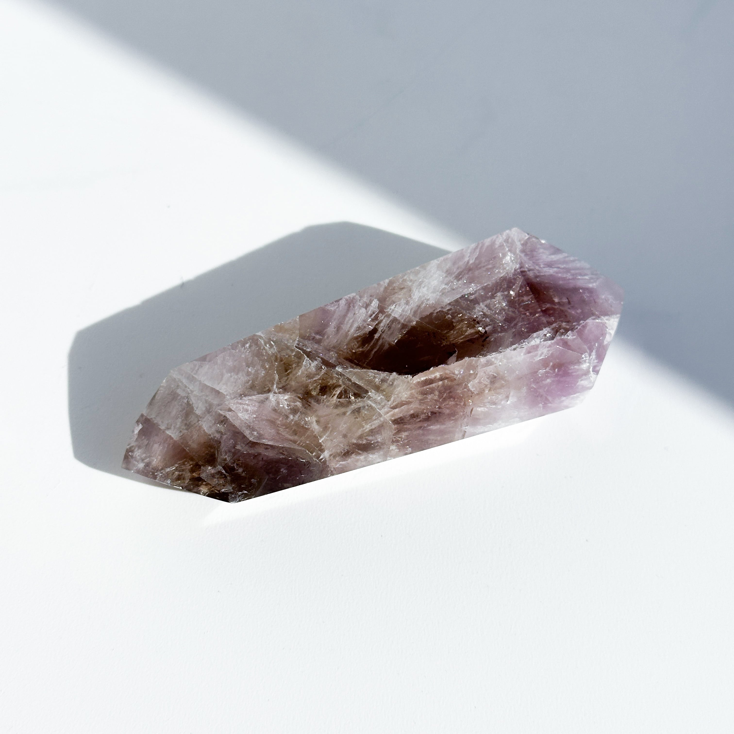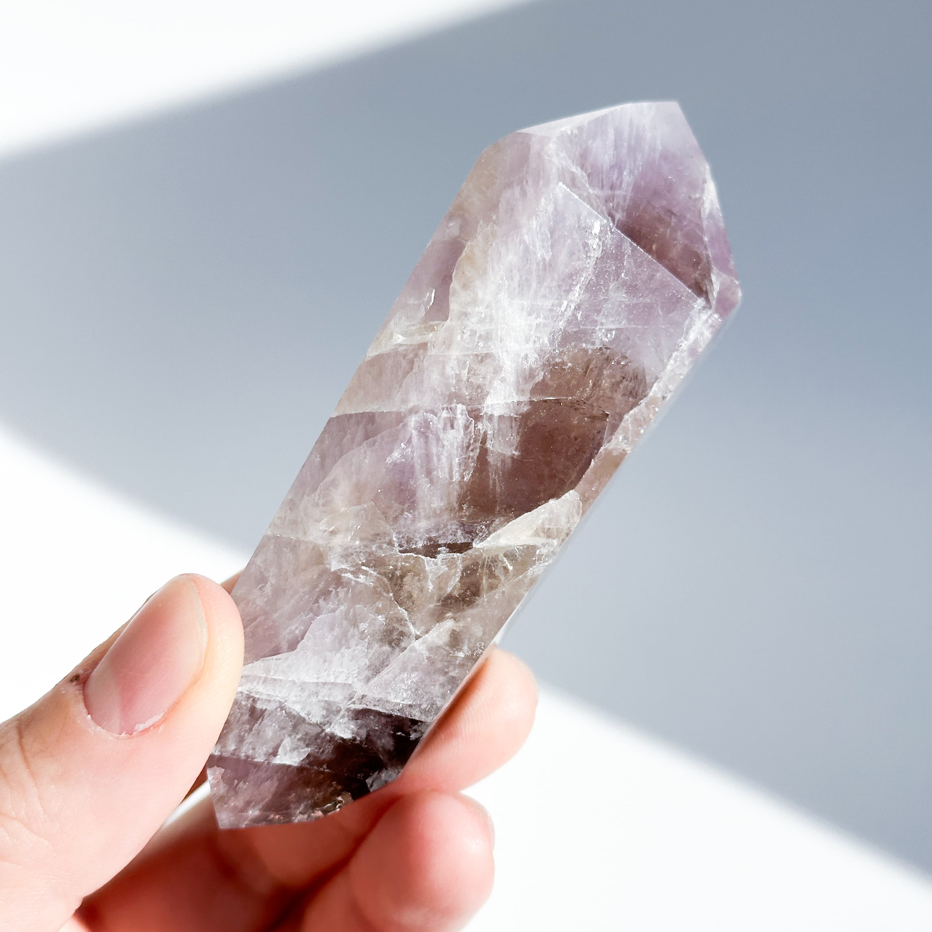 目視ではアメジスト、クリアクォーツ、スモーキークォーツが確認でき、それぞれが一つの石の中で混ざり合ったり、線状に切り替わったりし、非常に個性的な造形を作り上げています。