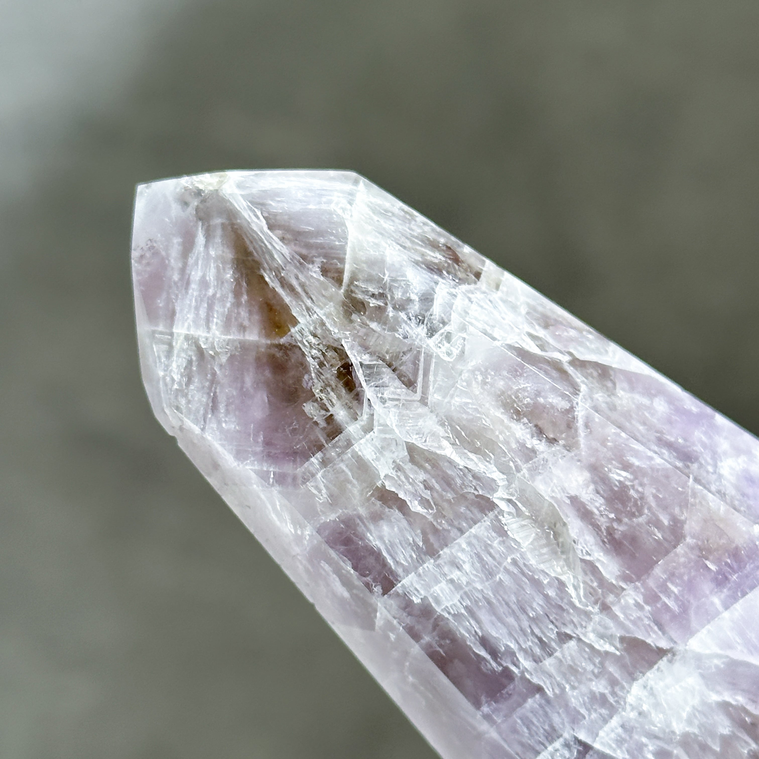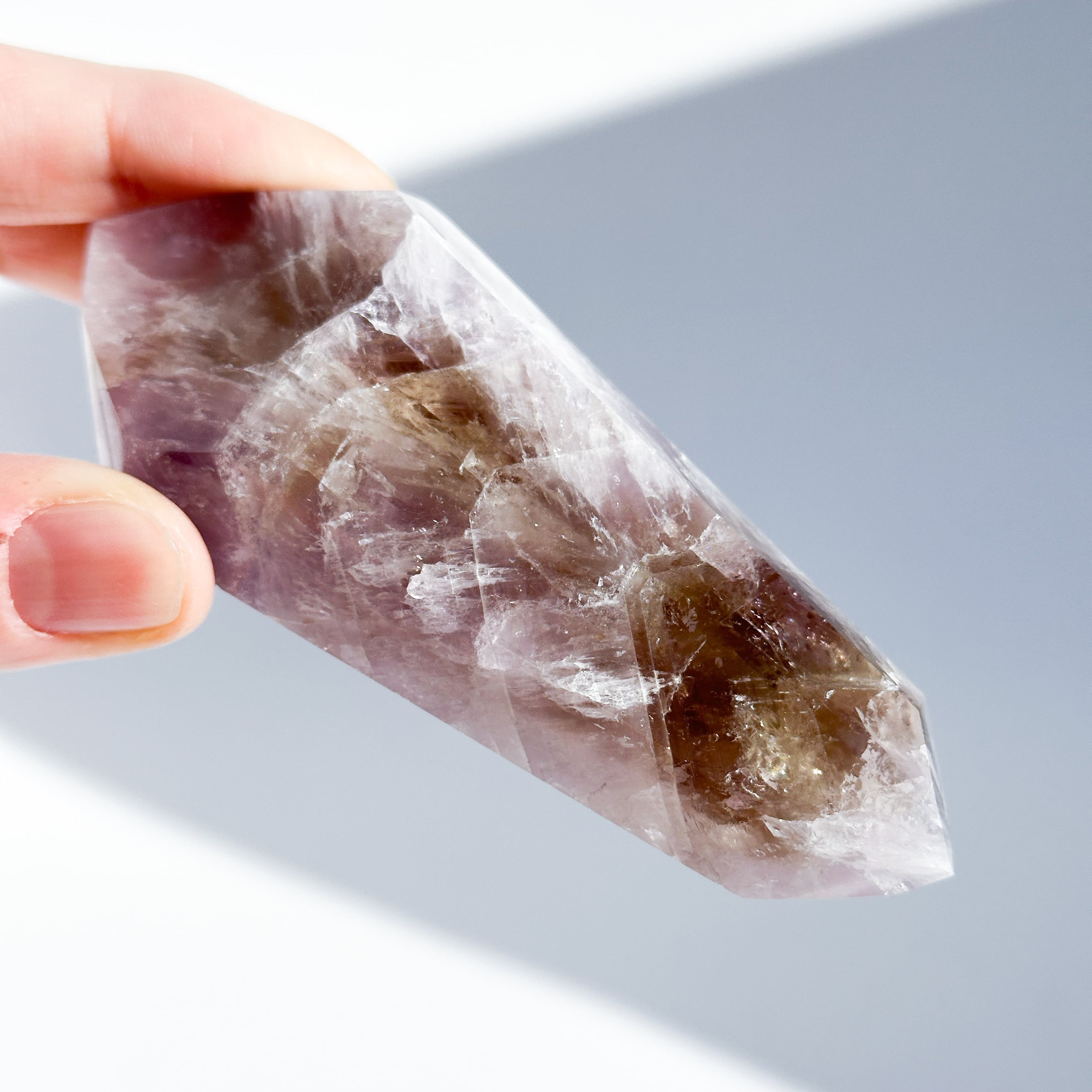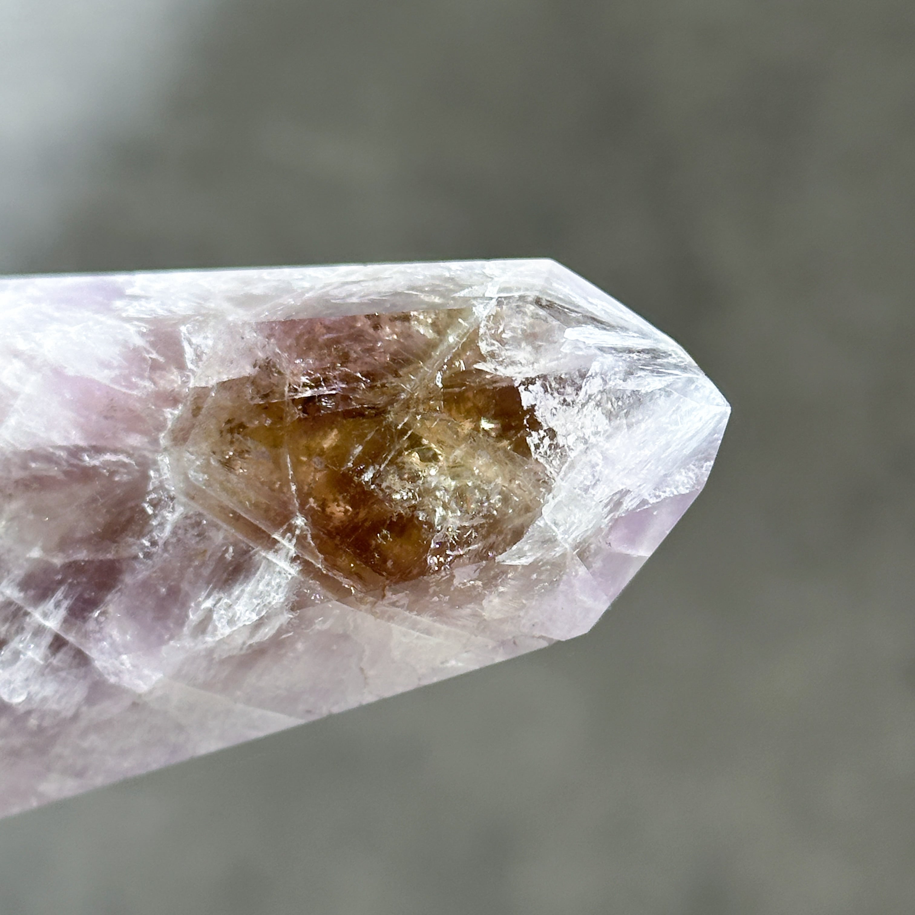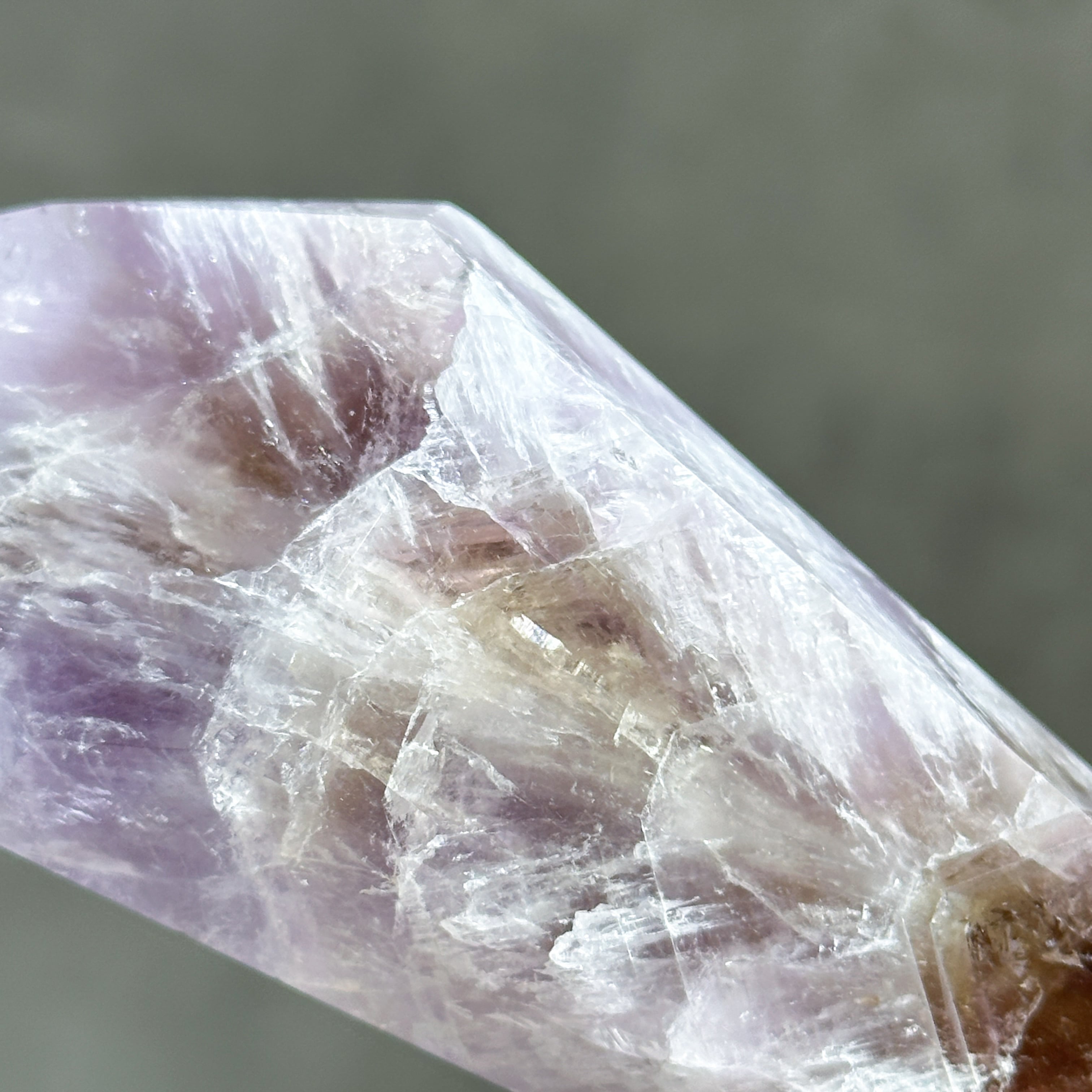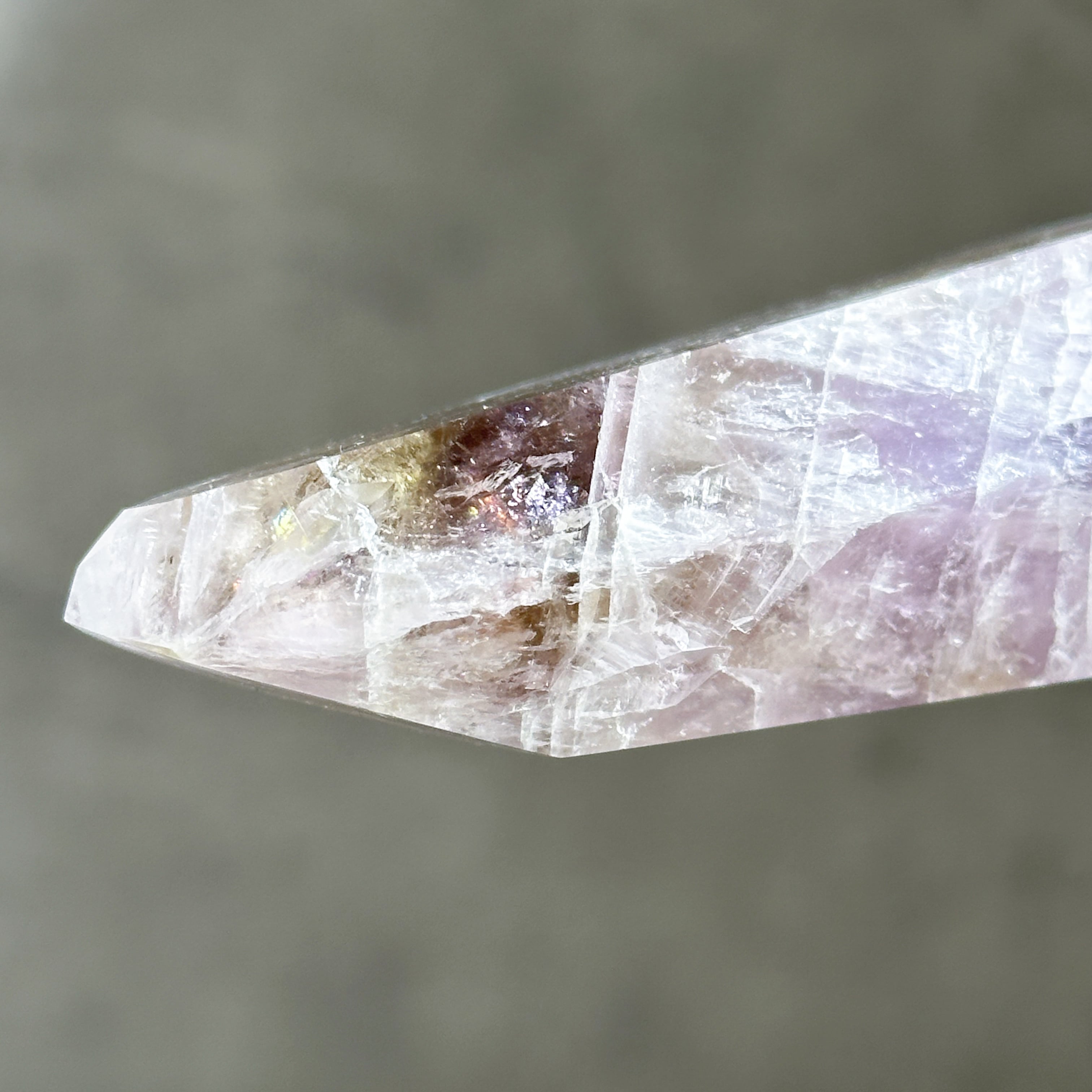 目視ではアメジスト、クリアクォーツ、スモーキークォーツが確認でき、それぞれが一つの石の中で混ざり合ったり、線状に切り替わったりし、非常に個性的な造形を作り上げています。