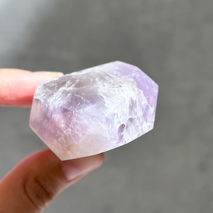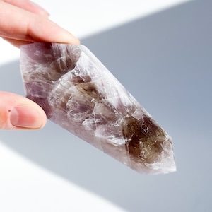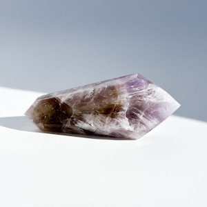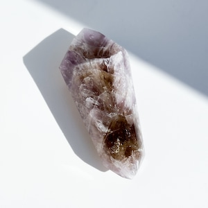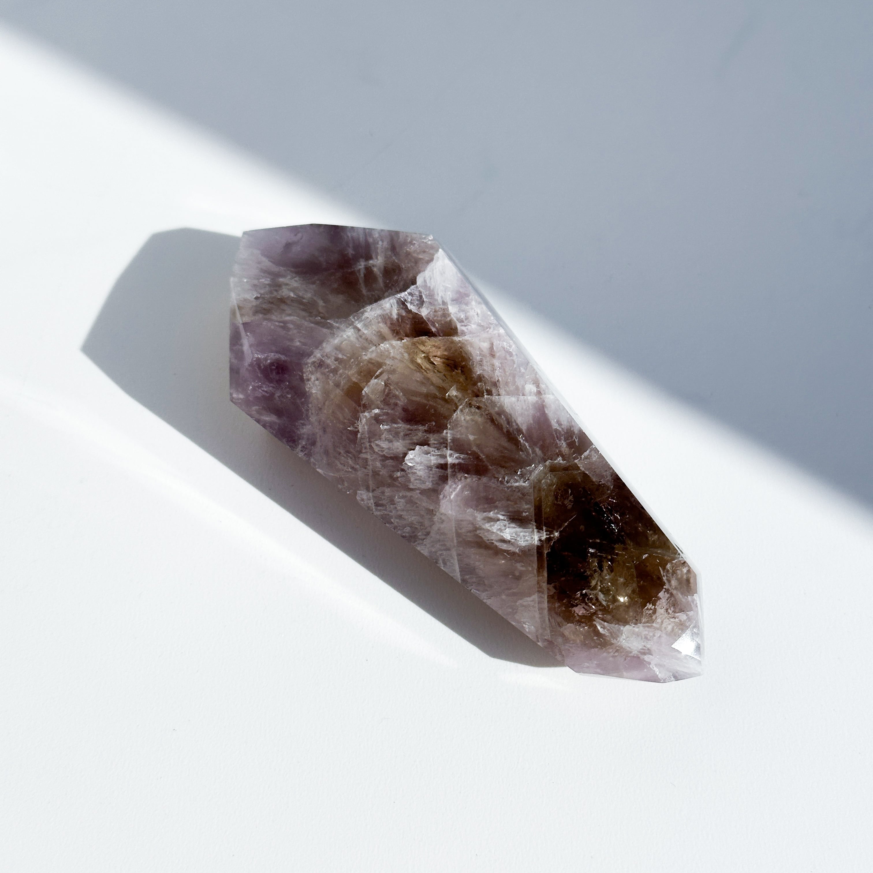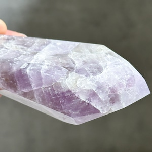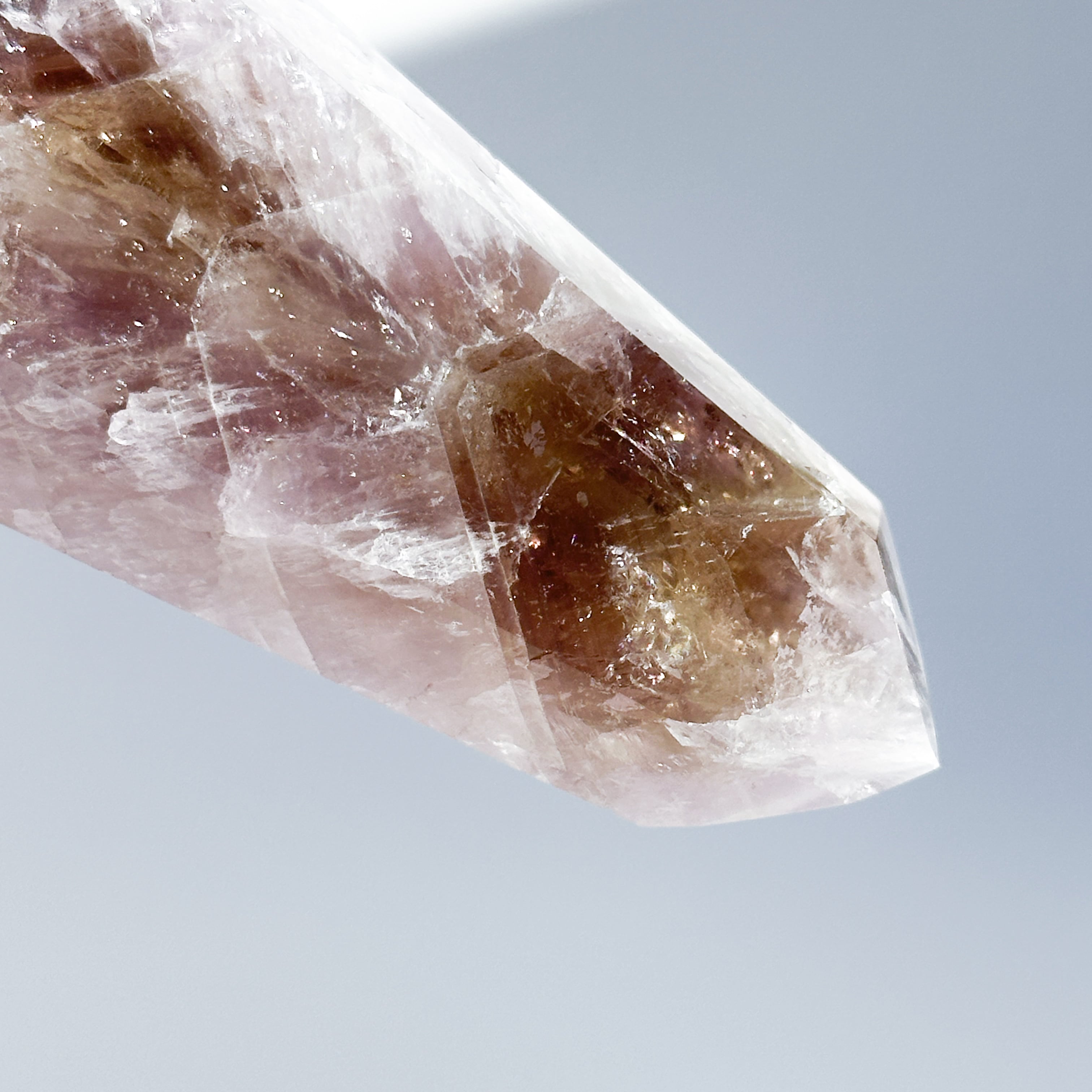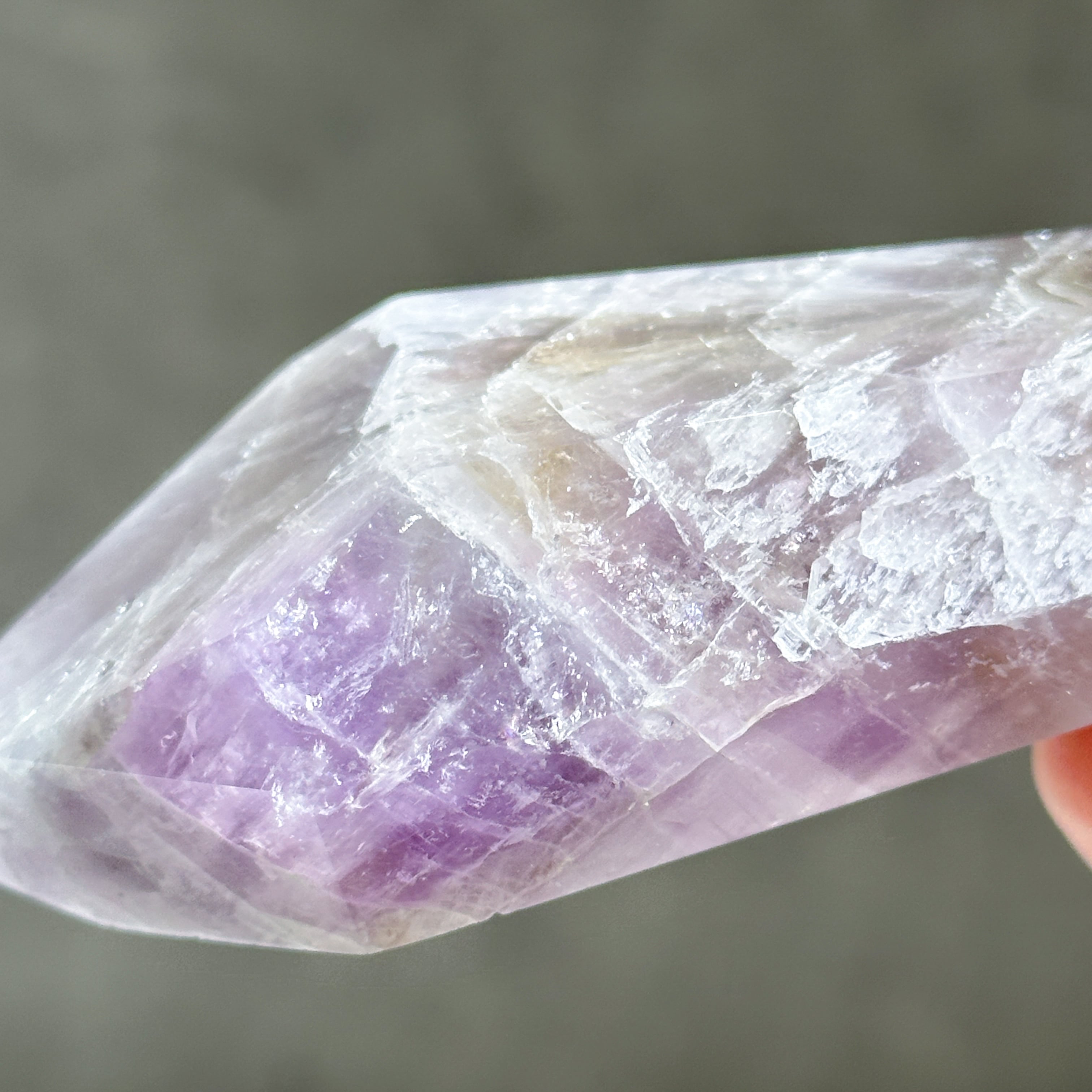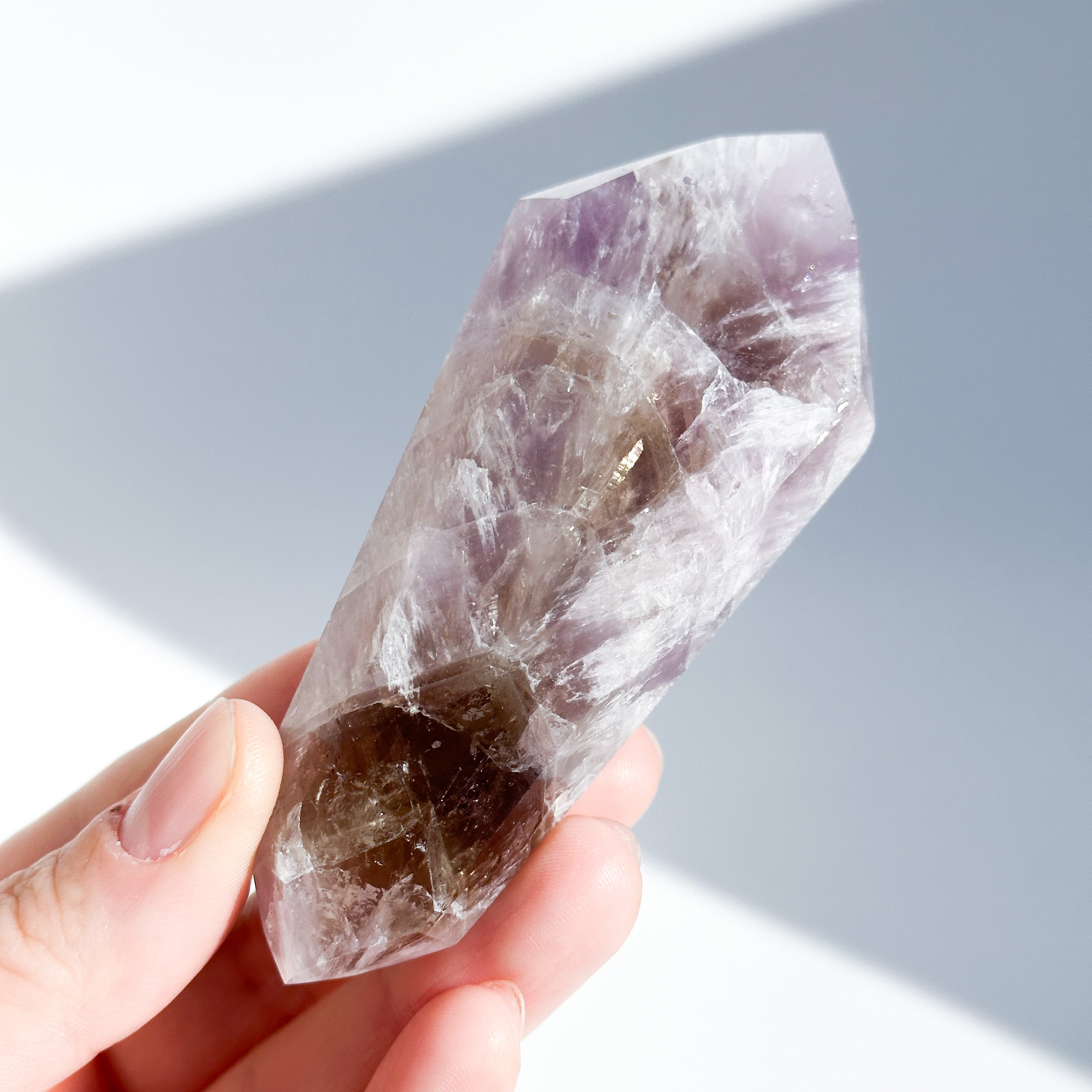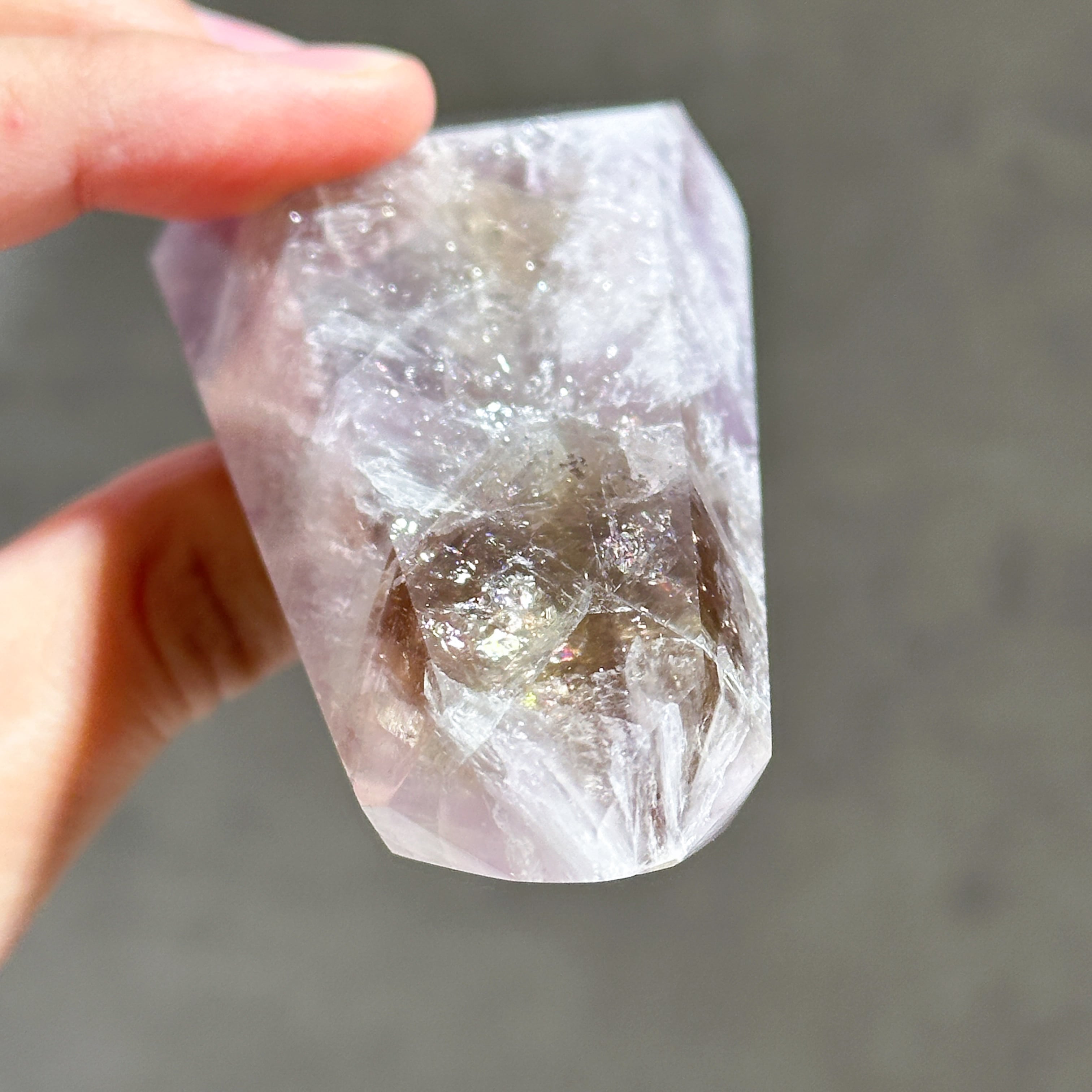 目視ではアメジスト、クリアクォーツ、スモーキークォーツが確認でき、それぞれが一つの石の中で混ざり合ったり、線状に切り替わったりし、非常に個性的な造形を作り上げています。