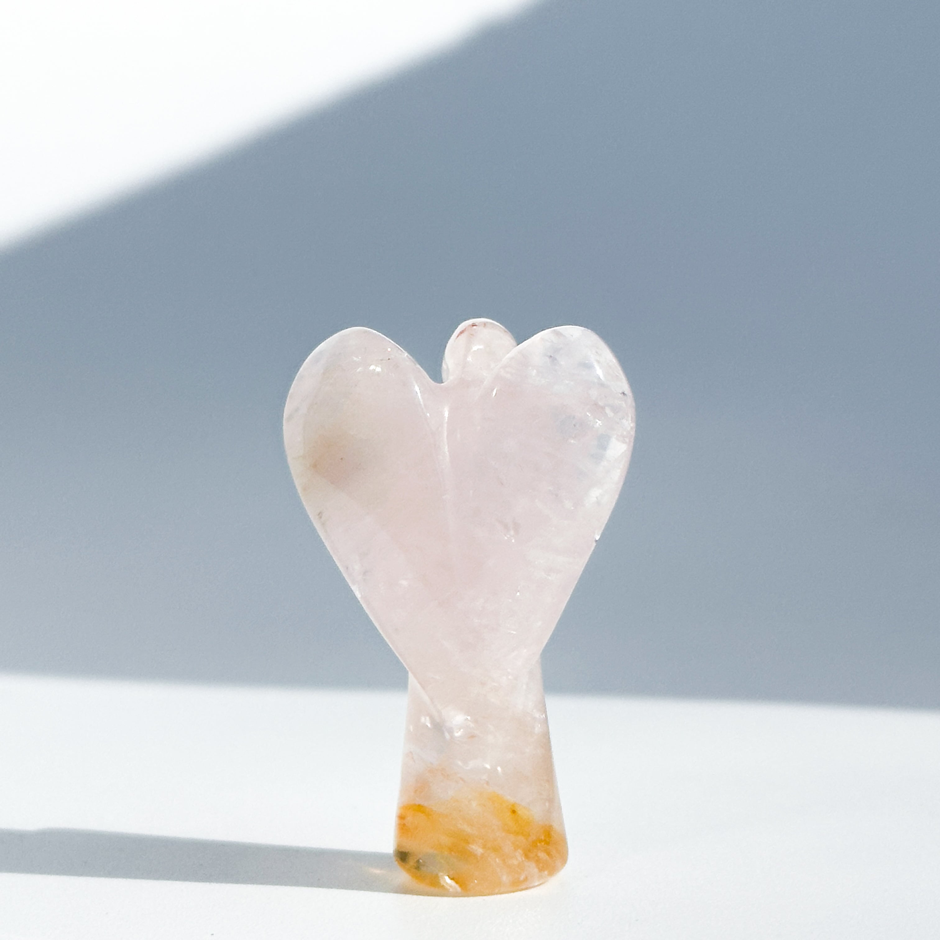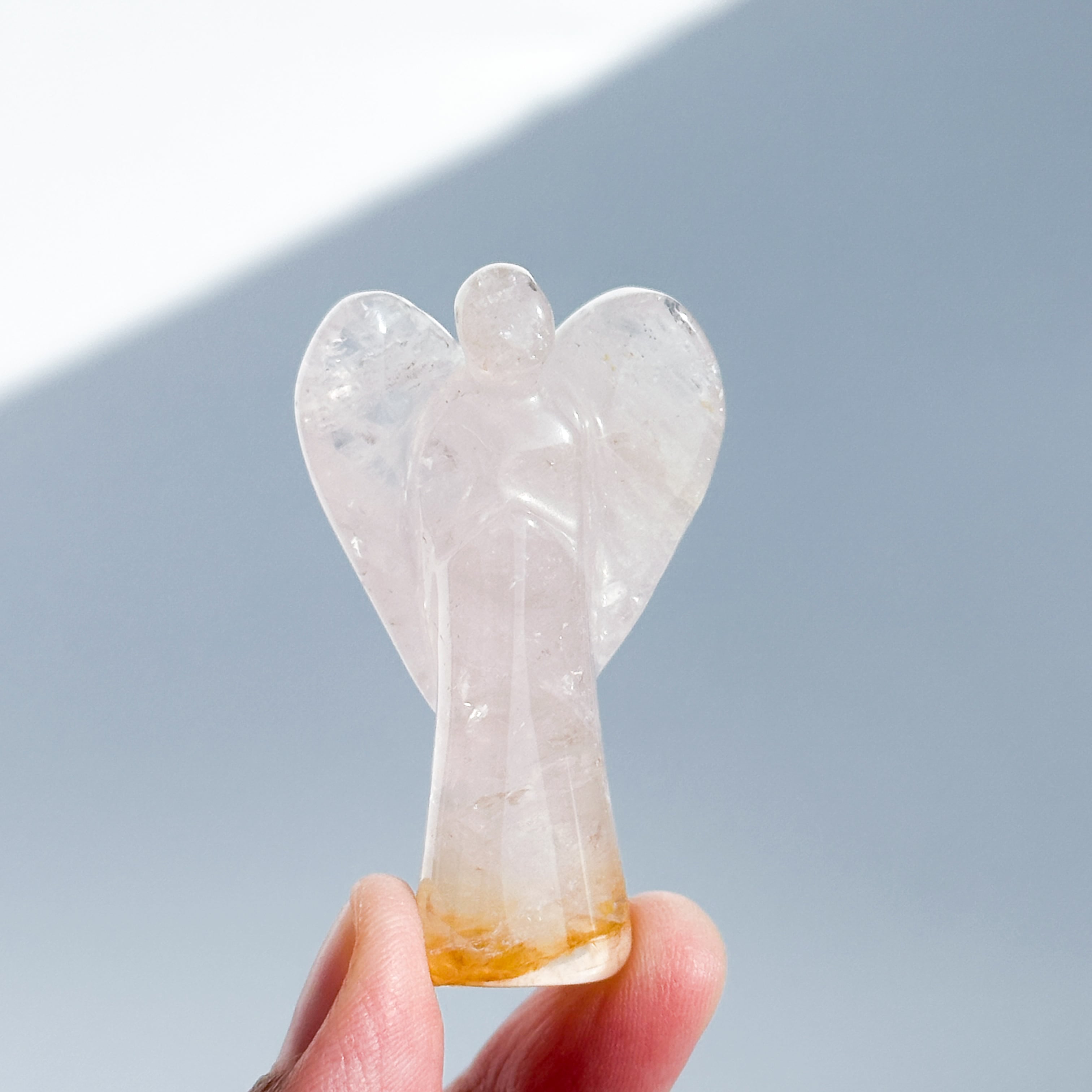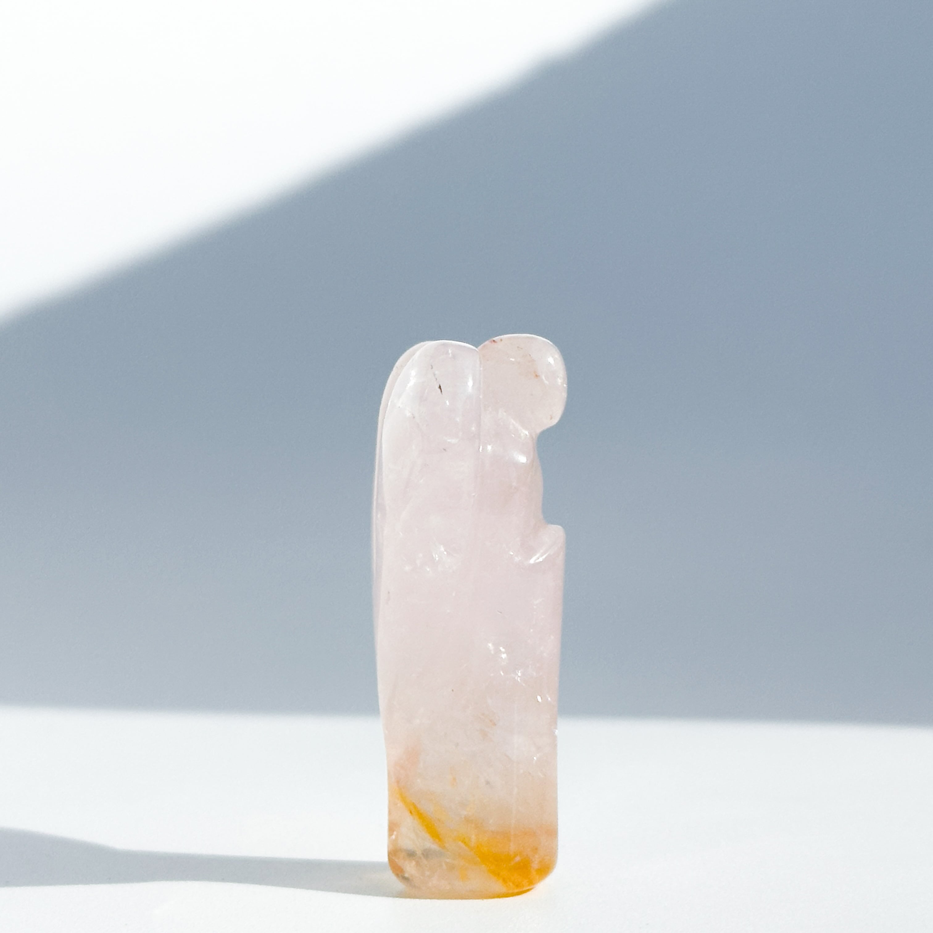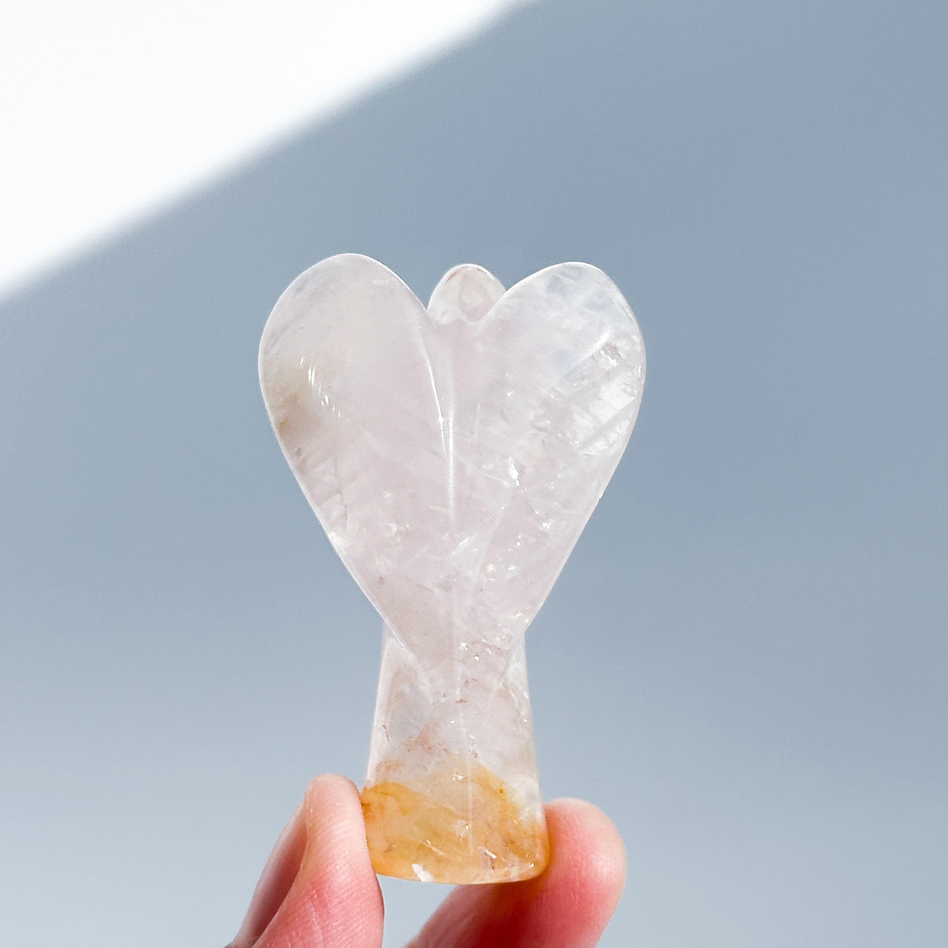 ゴールデンヒーラー×ローズクォーツを、小さなエンジェルの形に彫刻いたしました。