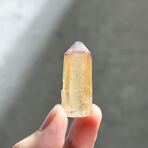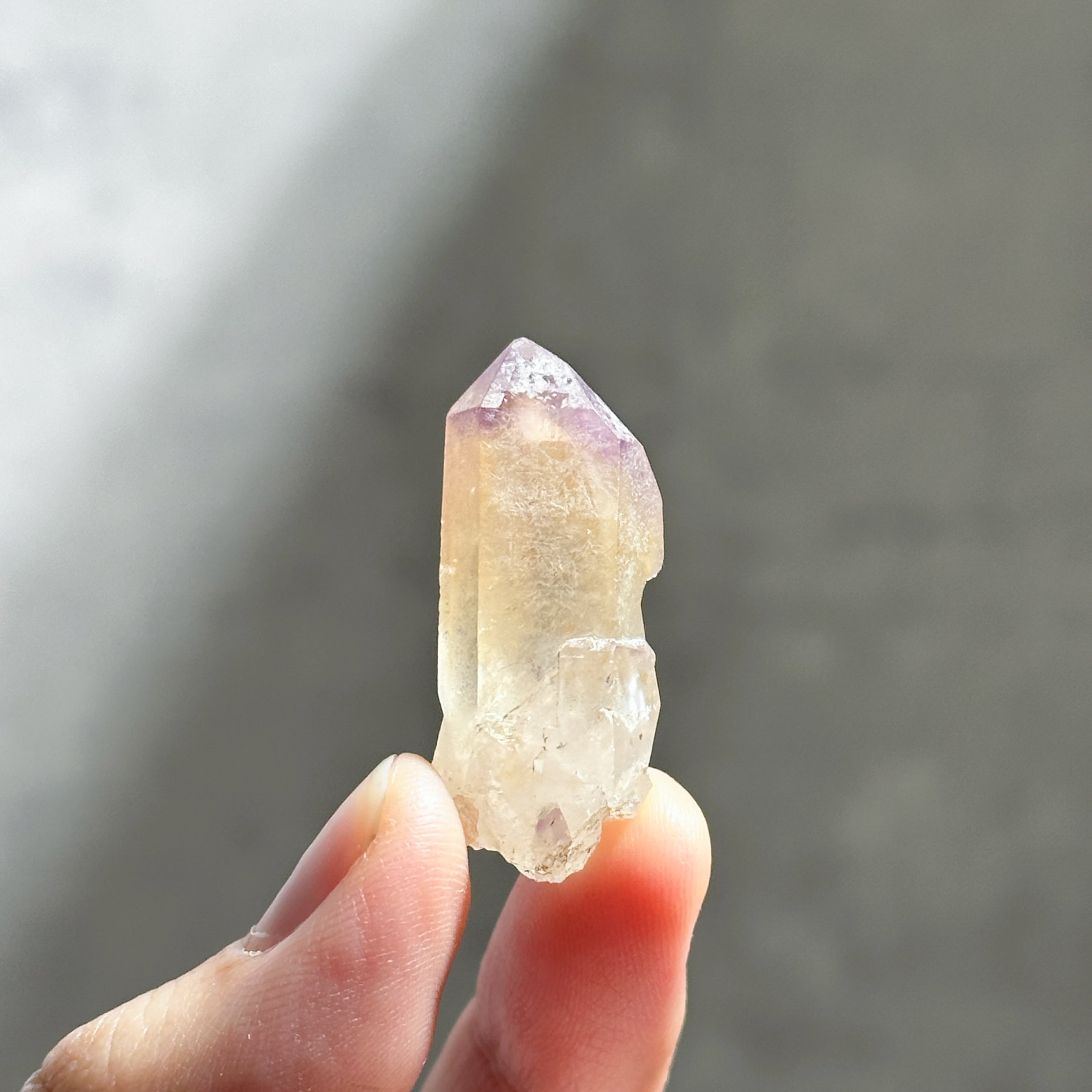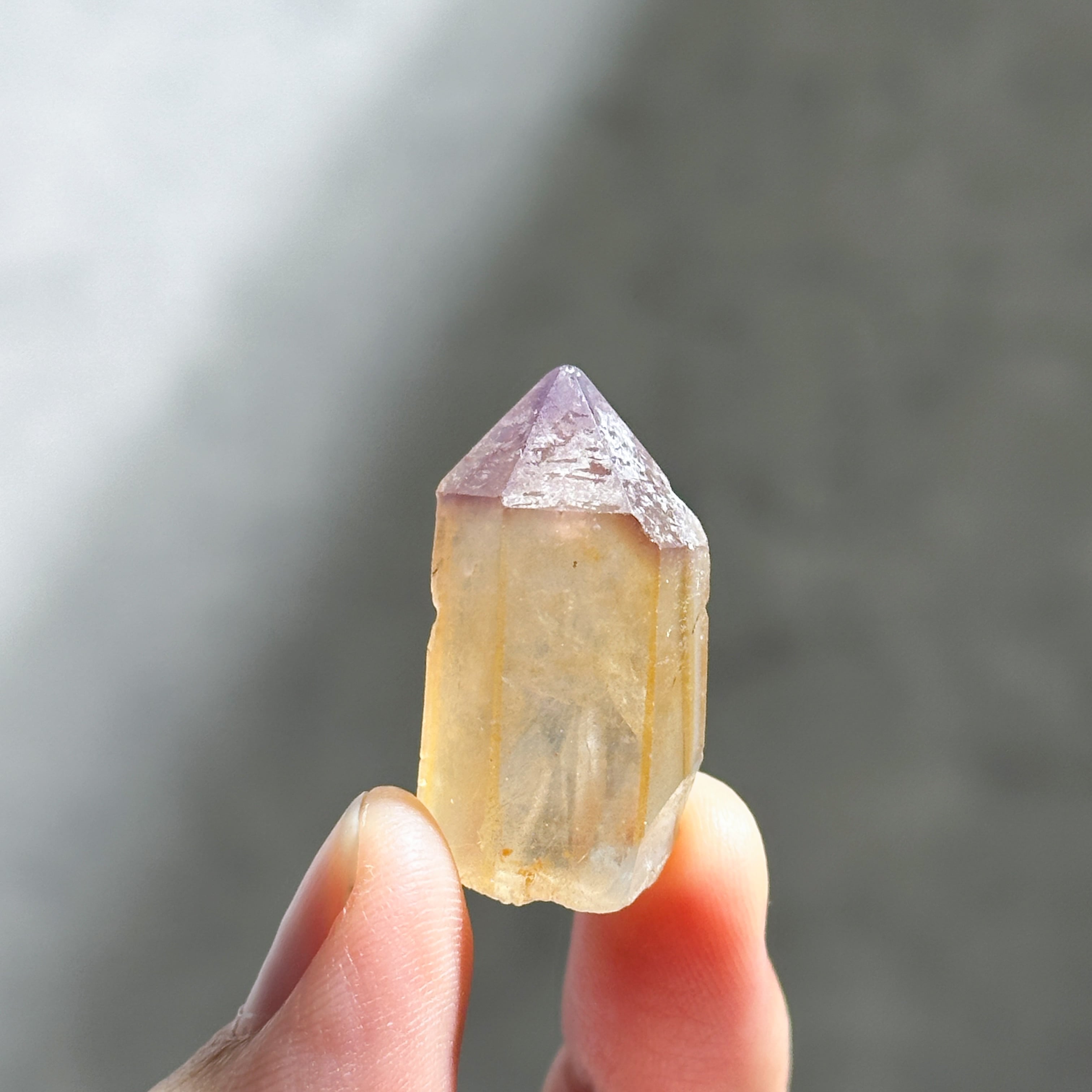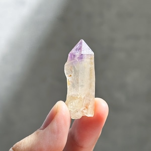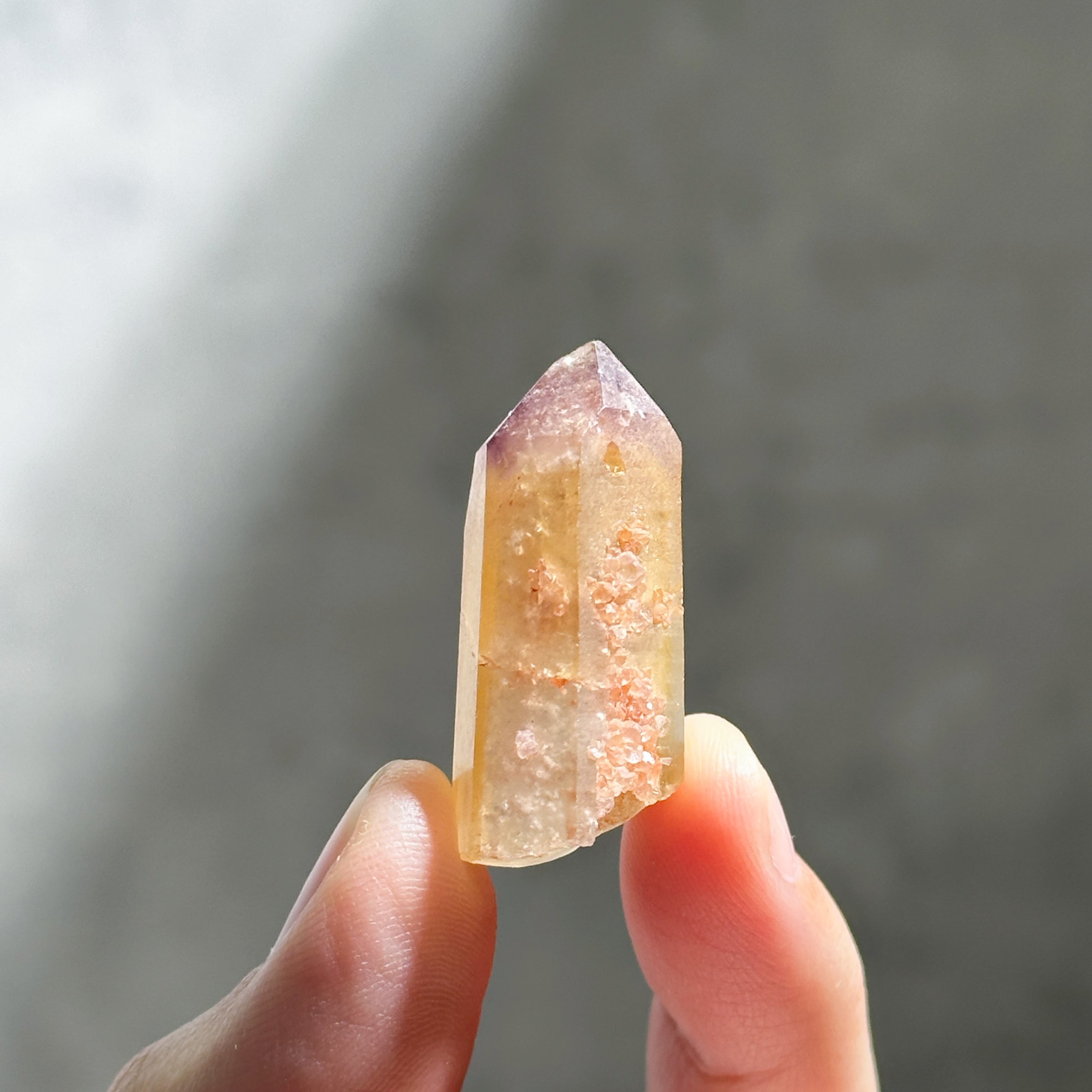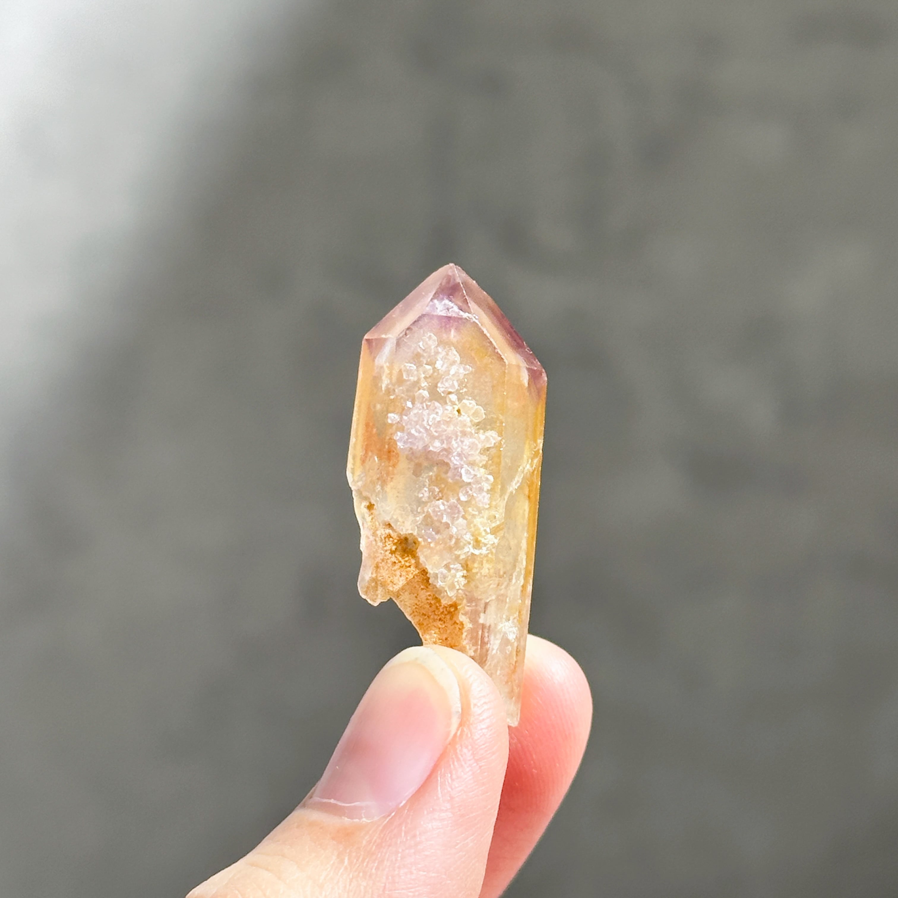 オレンジに色付いた部分は、水晶の表面にヘマタイトなどの鉄分を含んだタンジェリンクォーツと呼ばれるもので、トップにはアメジストが帽子のように色付いています。
