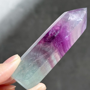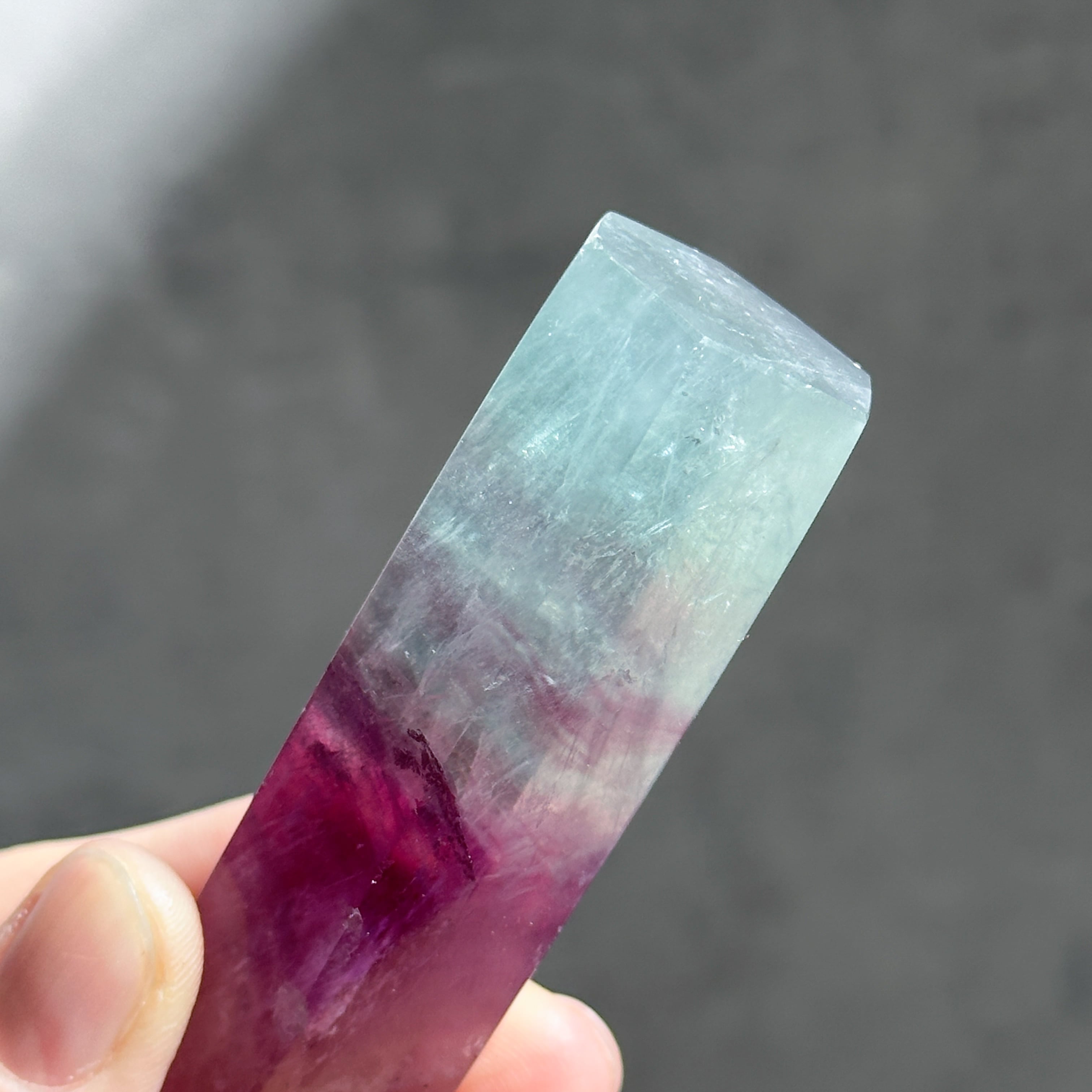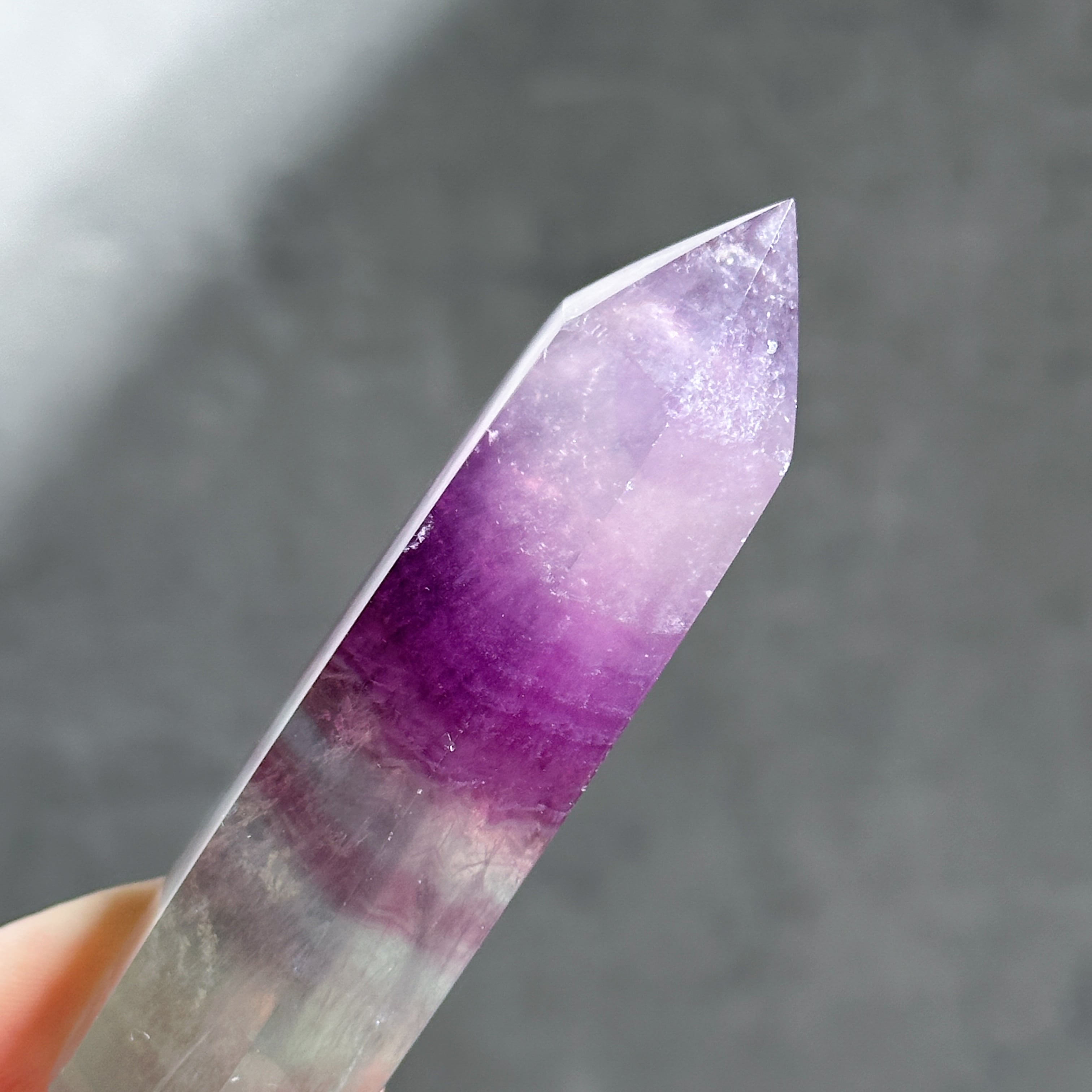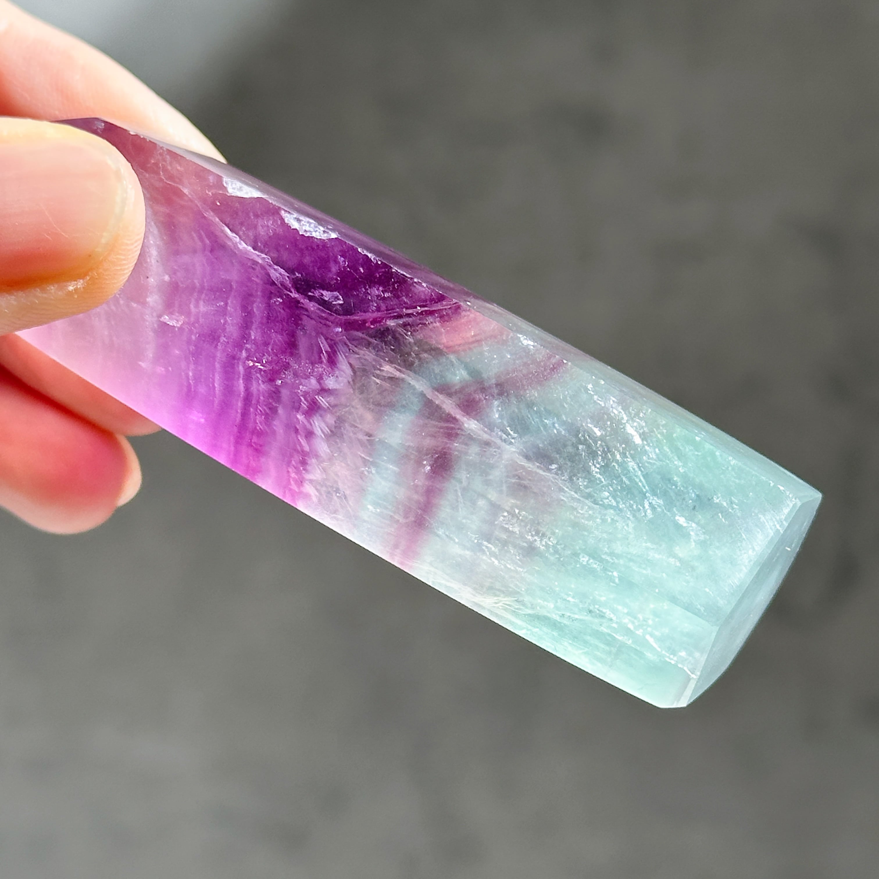 レインボーフローライトは複数のカラー(透明・パープル・ブルー・ピンク・グリーン)が共生し、水面のような曲線の模様を生み出しています。