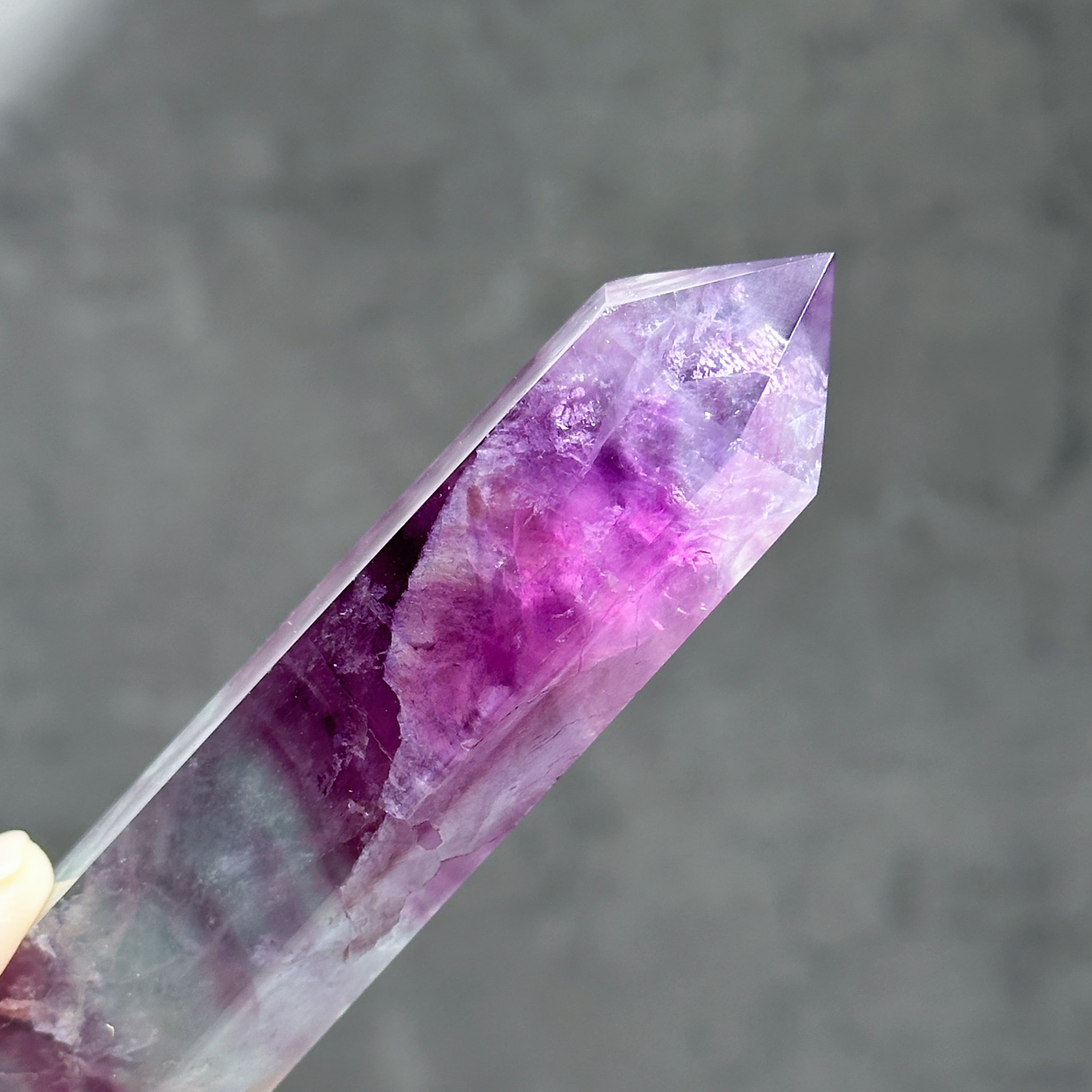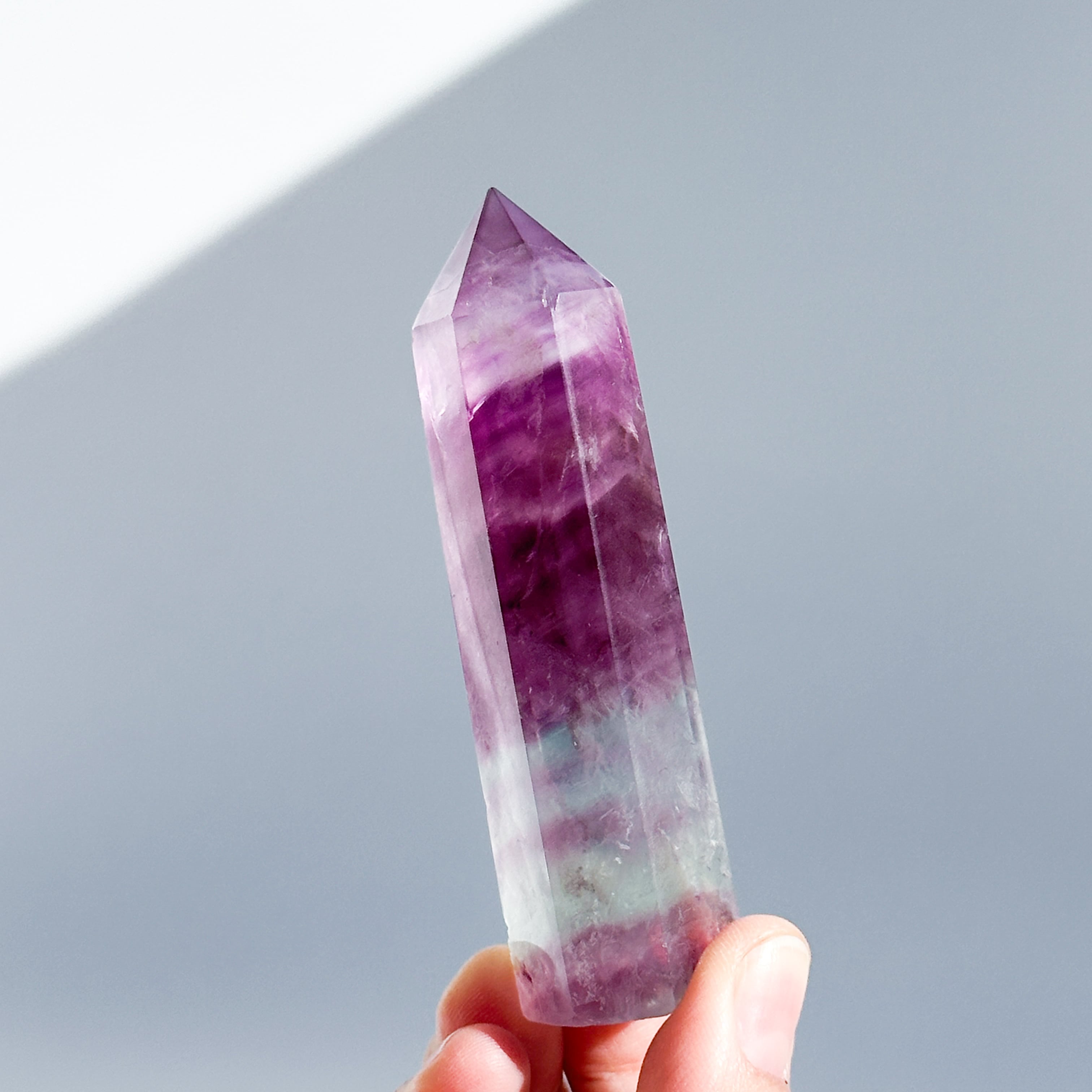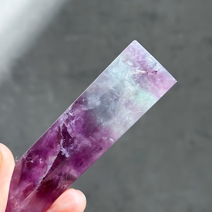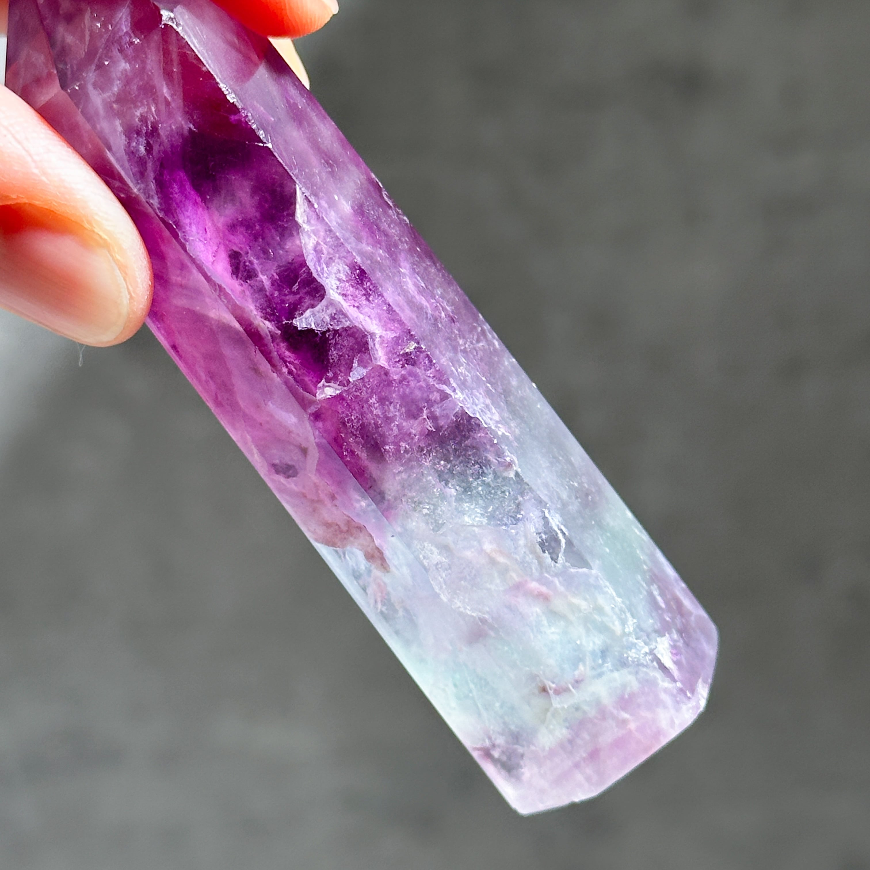 レインボーフローライトは複数のカラー(透明・パープル・ブルー・ピンク・グリーン)が共生し、水面のような曲線の模様を生み出しています。