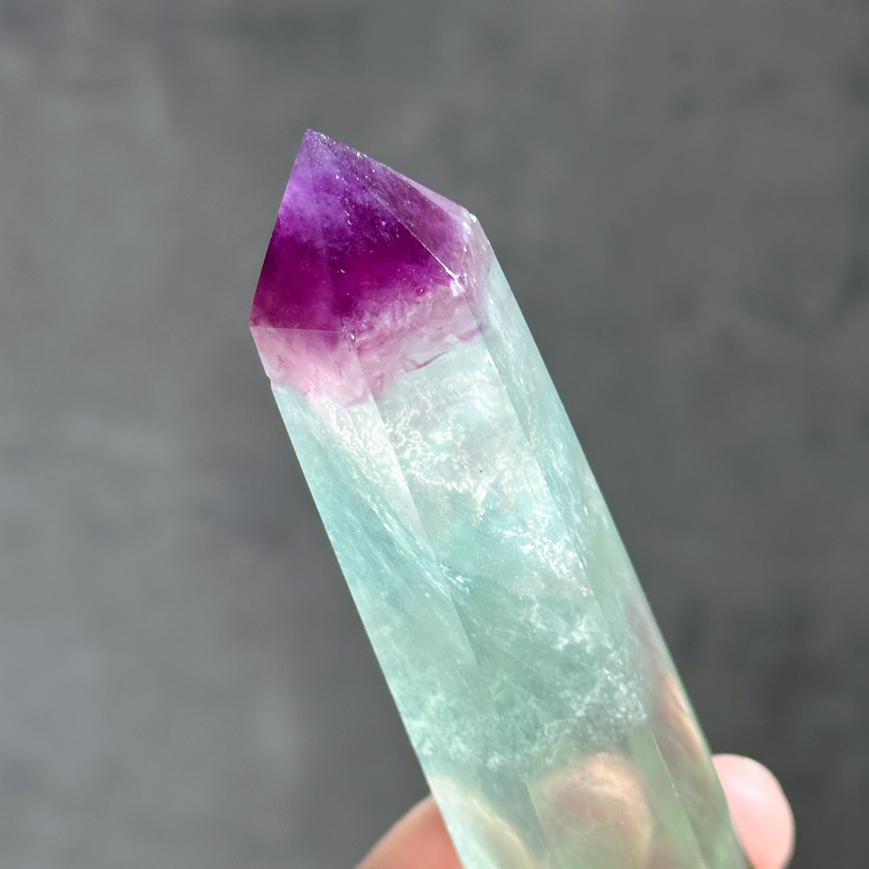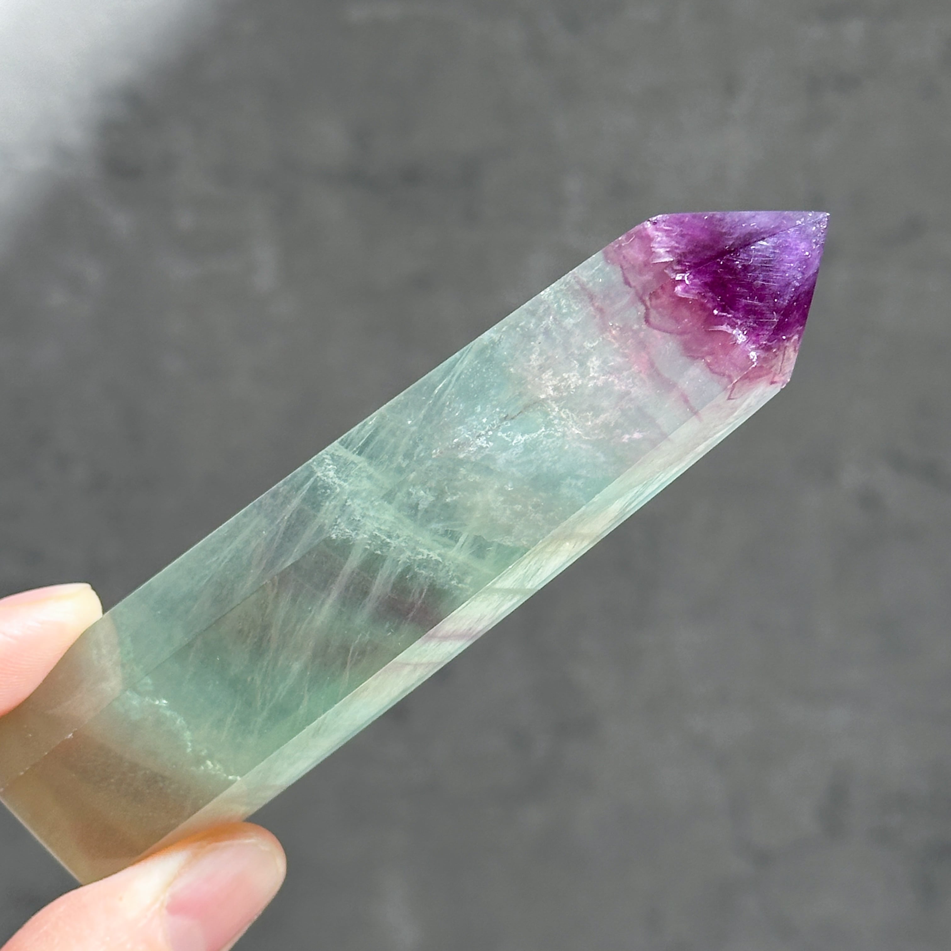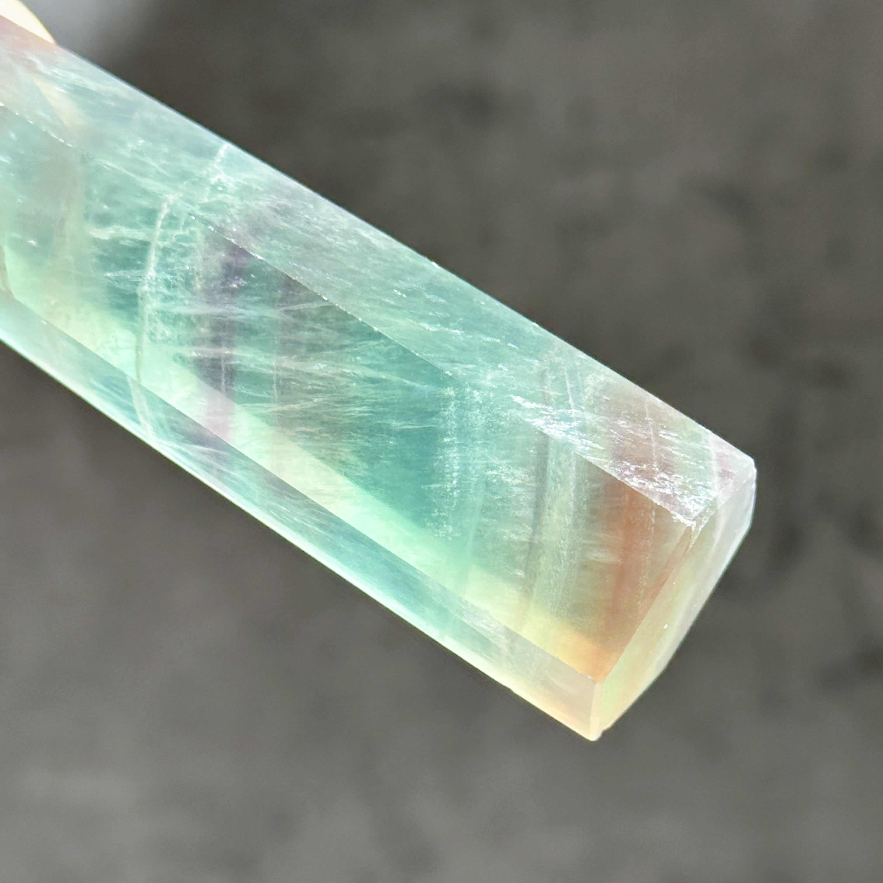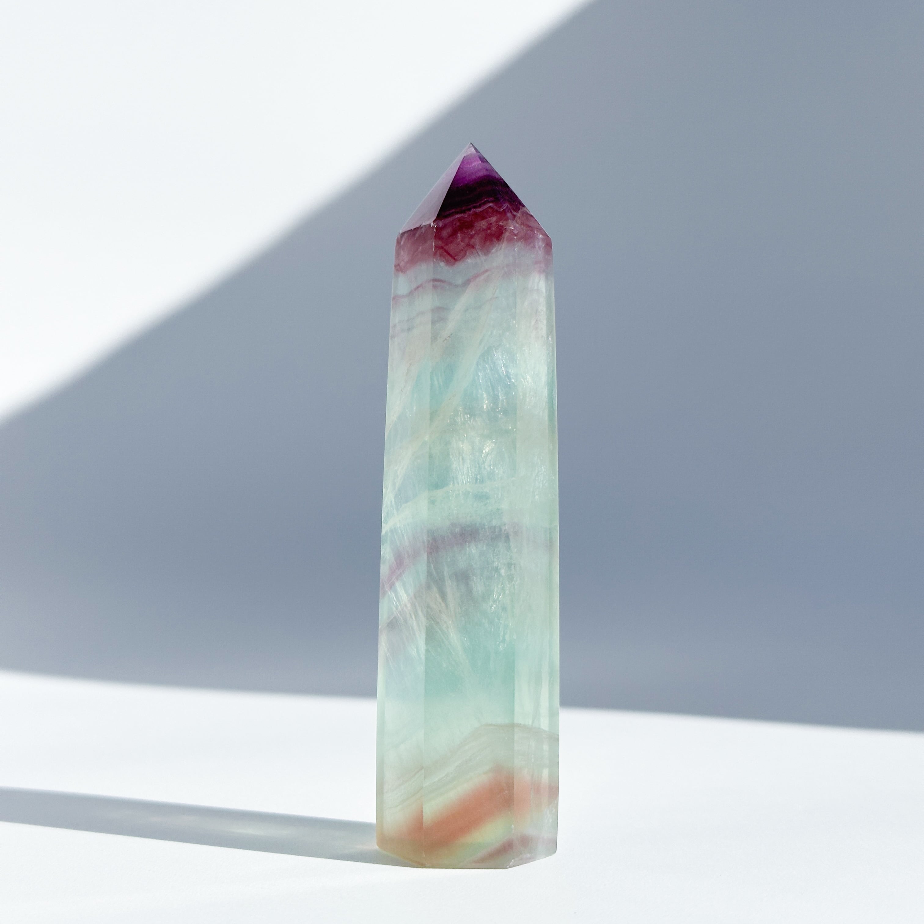 レインボーフローライトは複数のカラー(透明・パープル・ブルー・ピンク・グリーン)が共生し、水面のような曲線の模様を生み出しています。