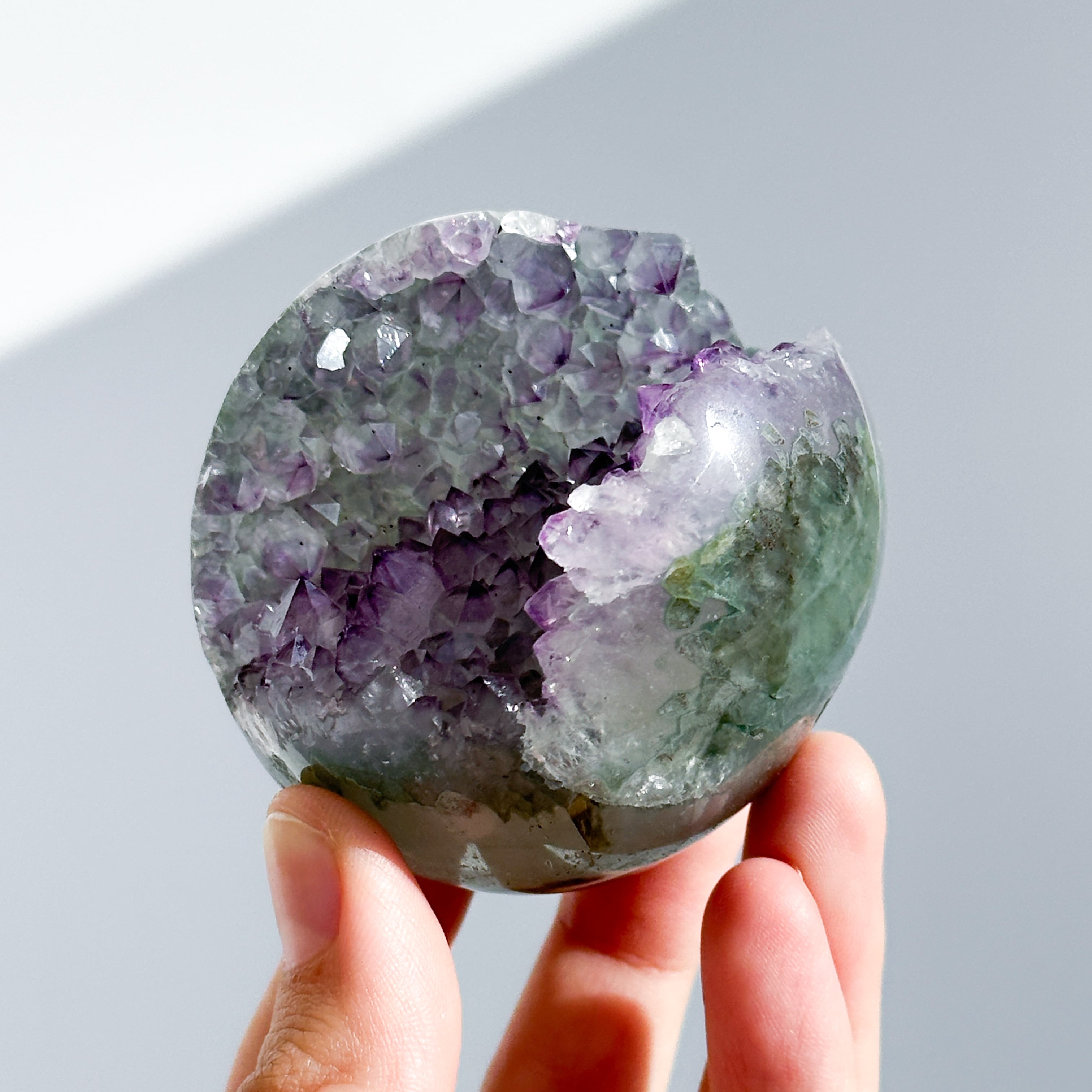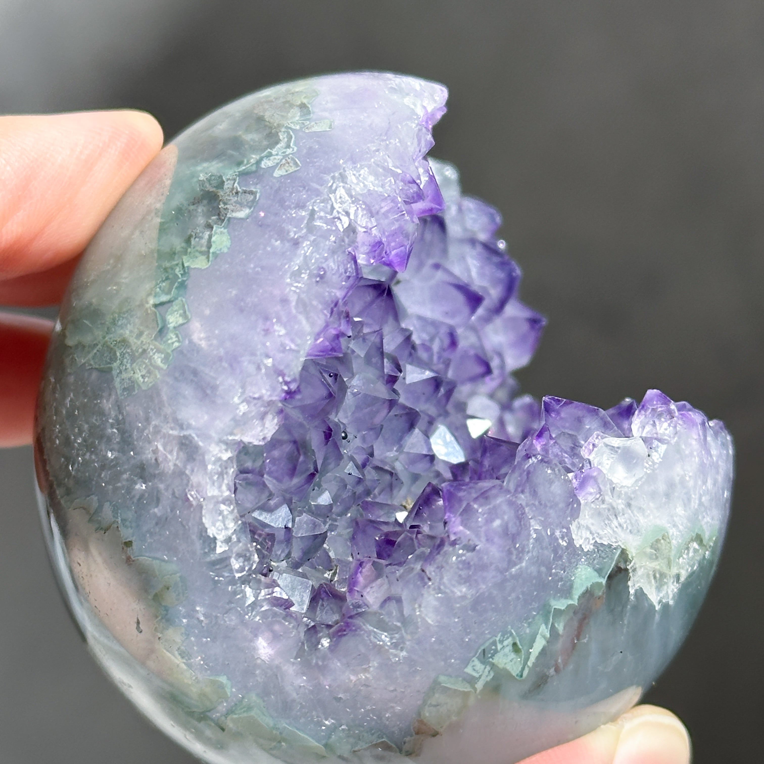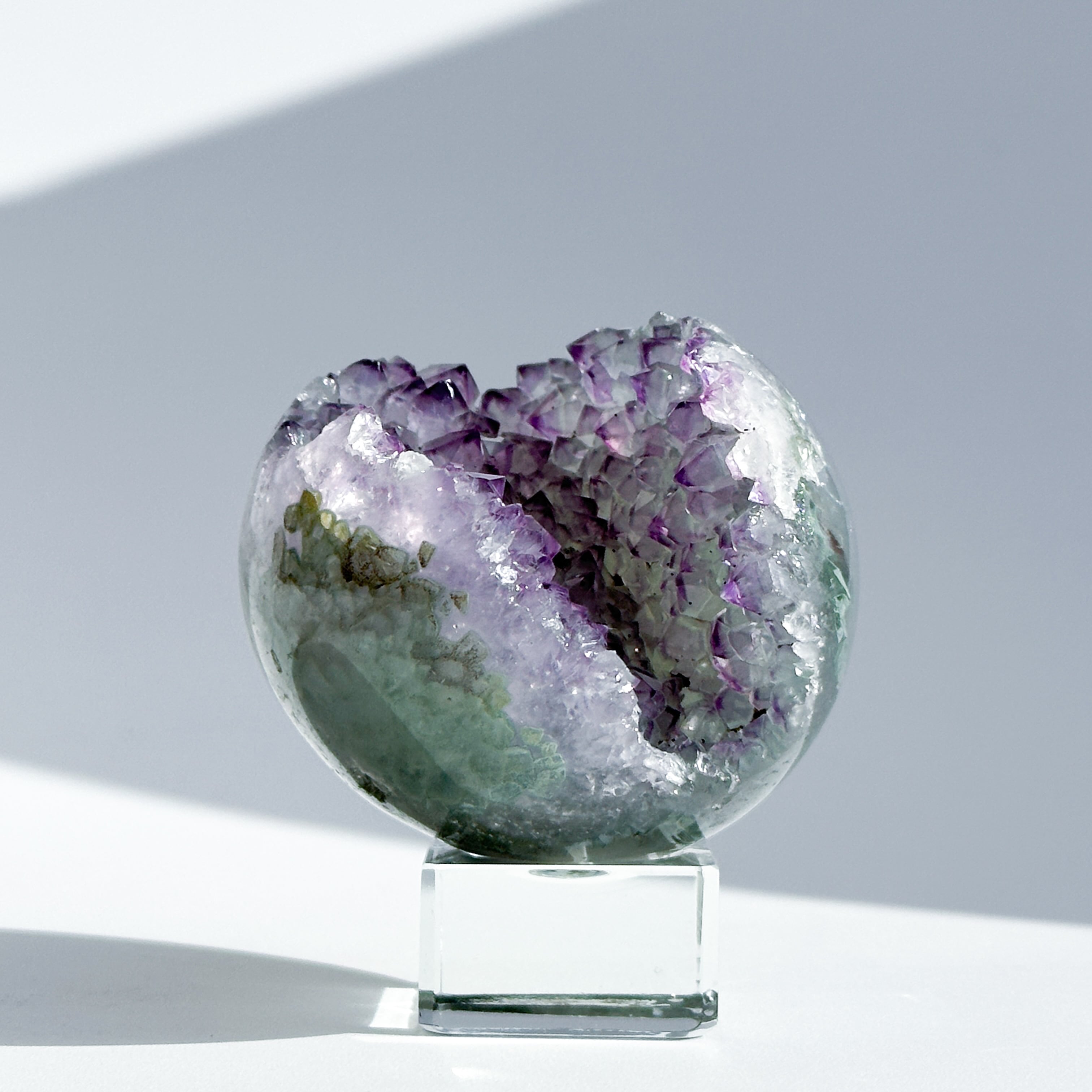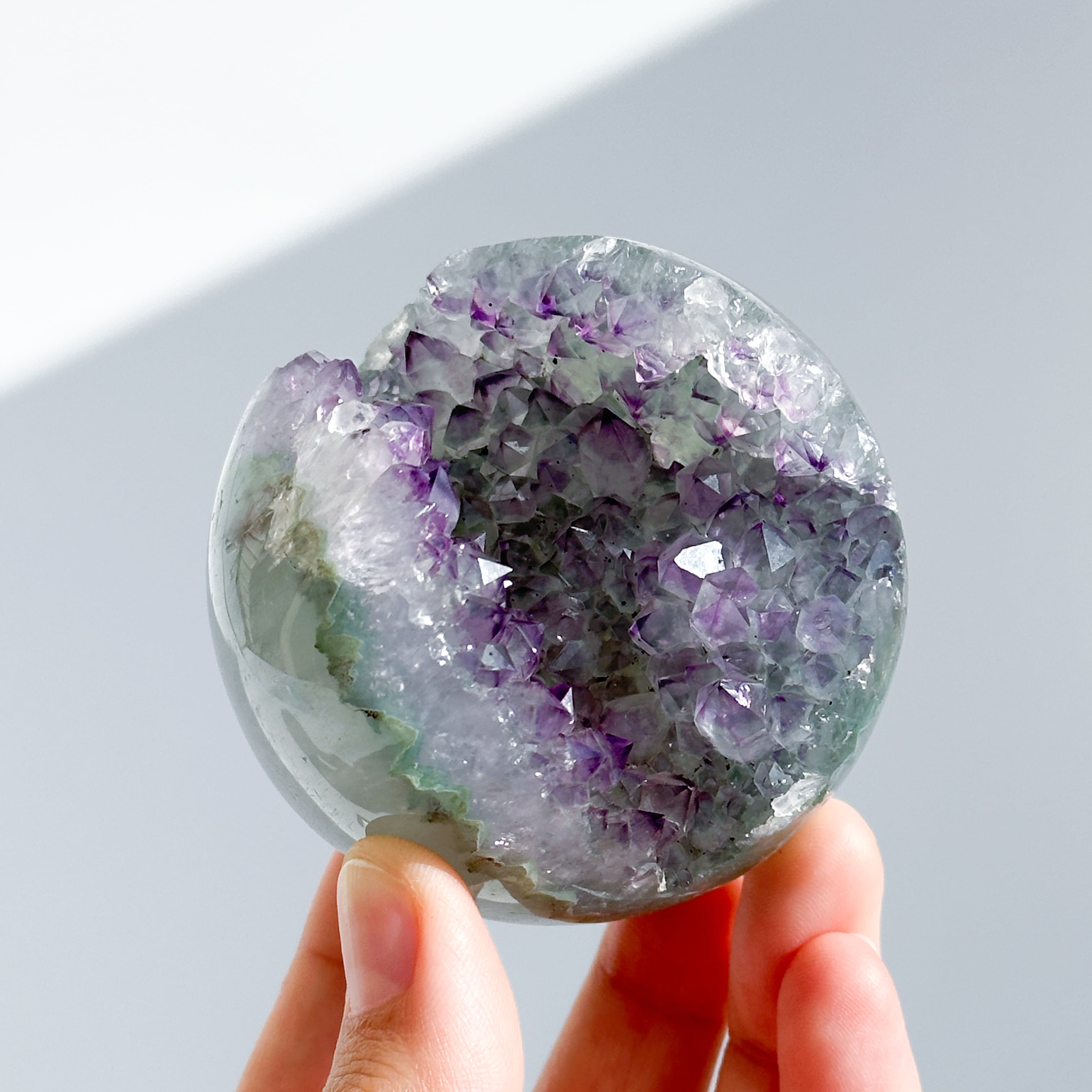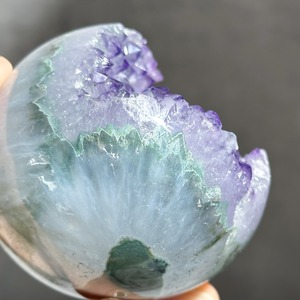 ウルグアイ産アメジストのジオードをスフィア(丸玉)に加工しました。