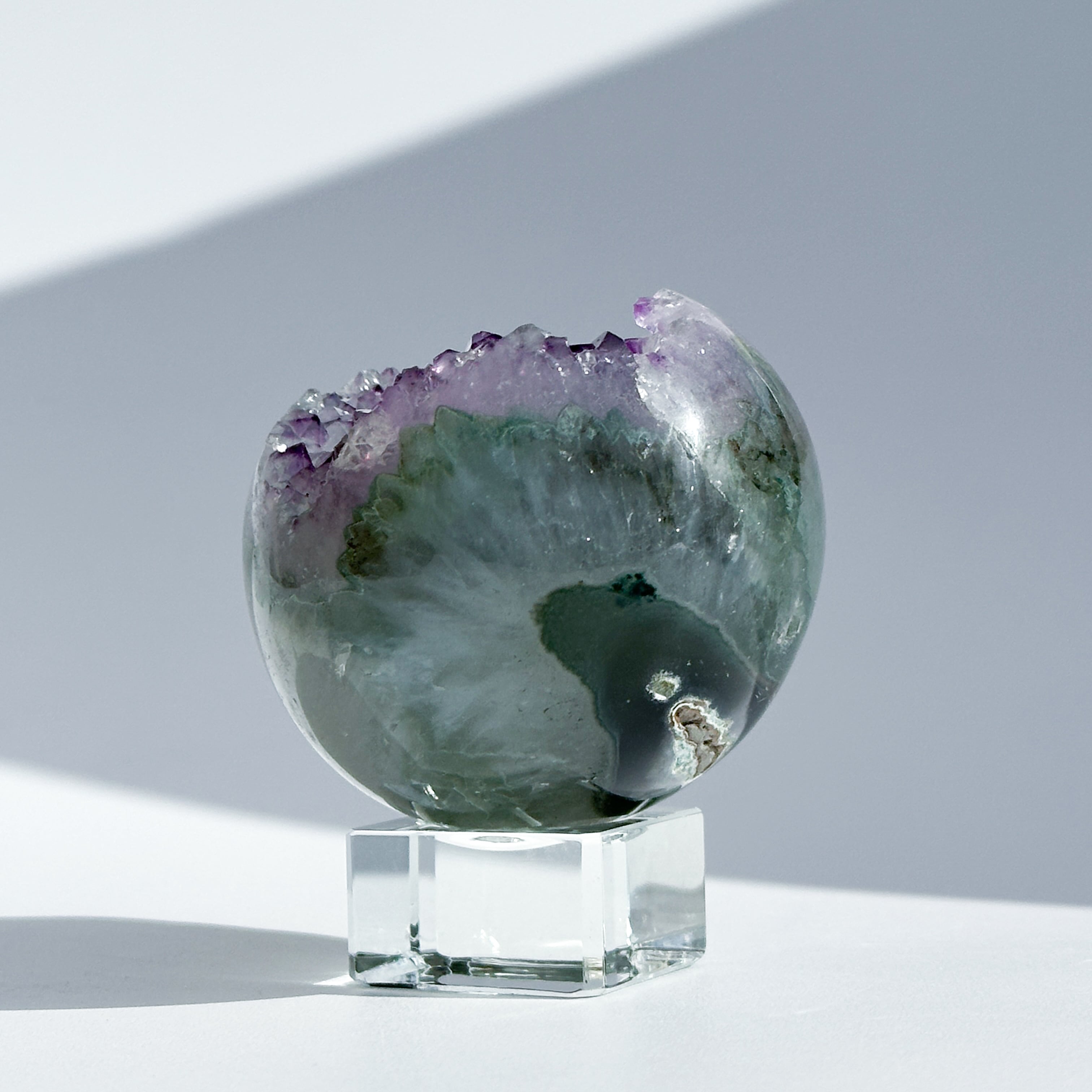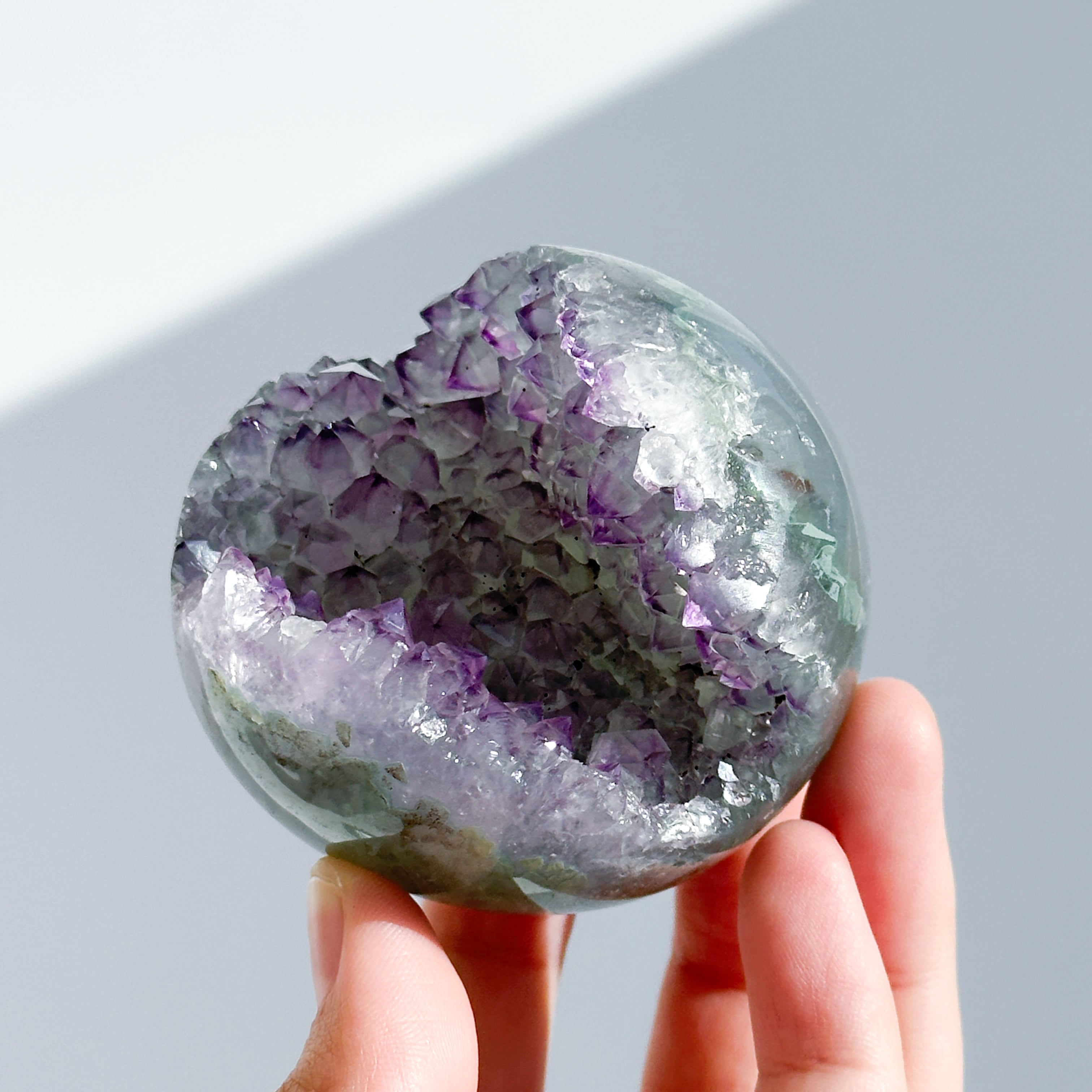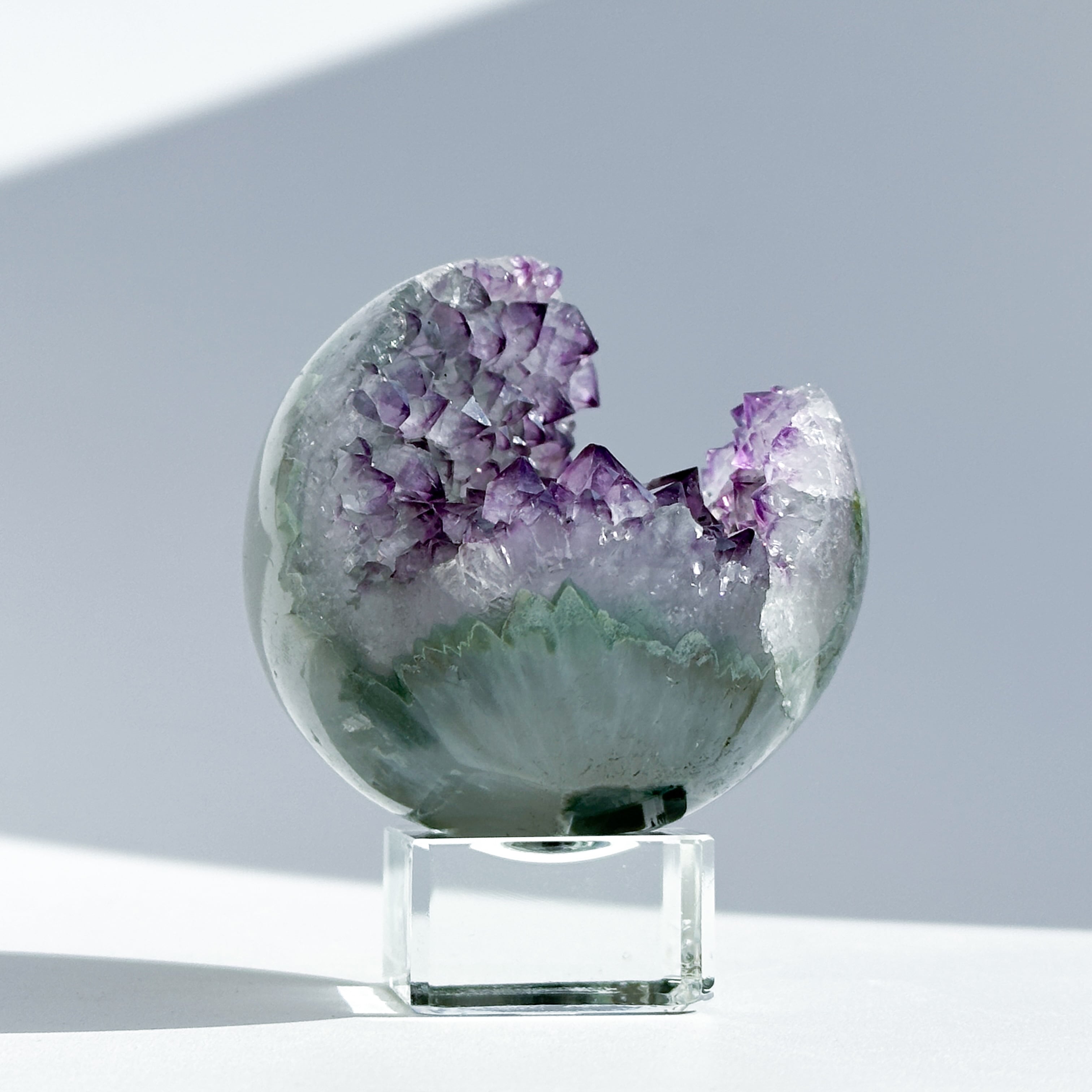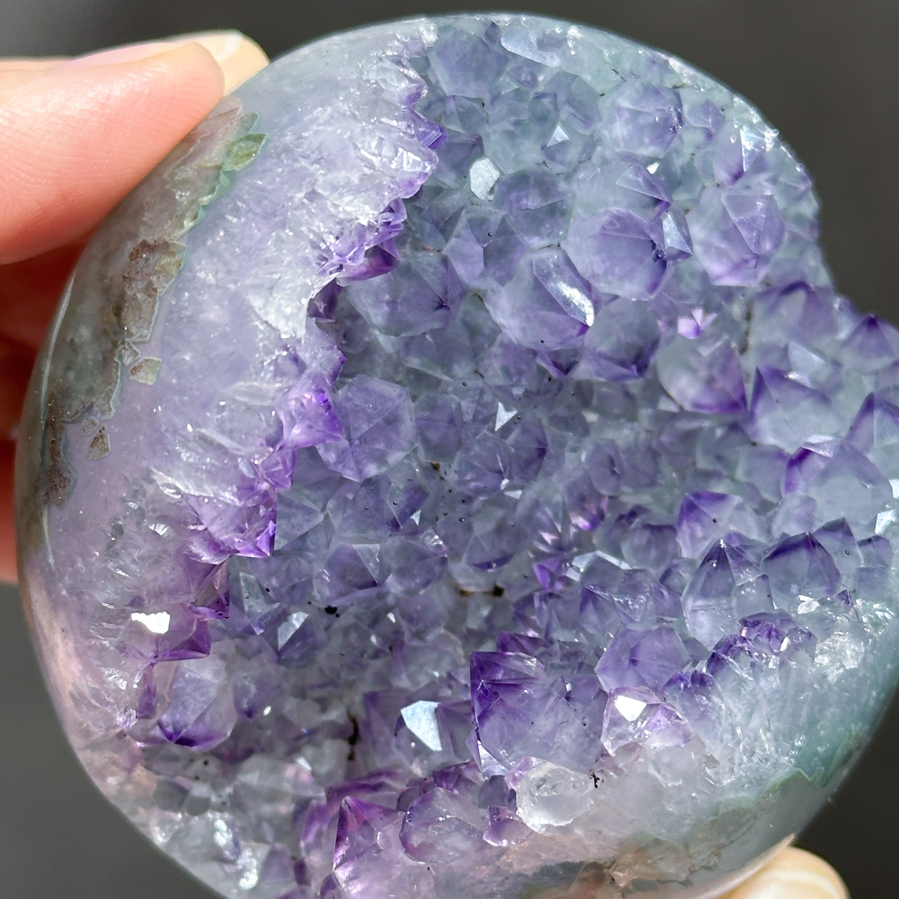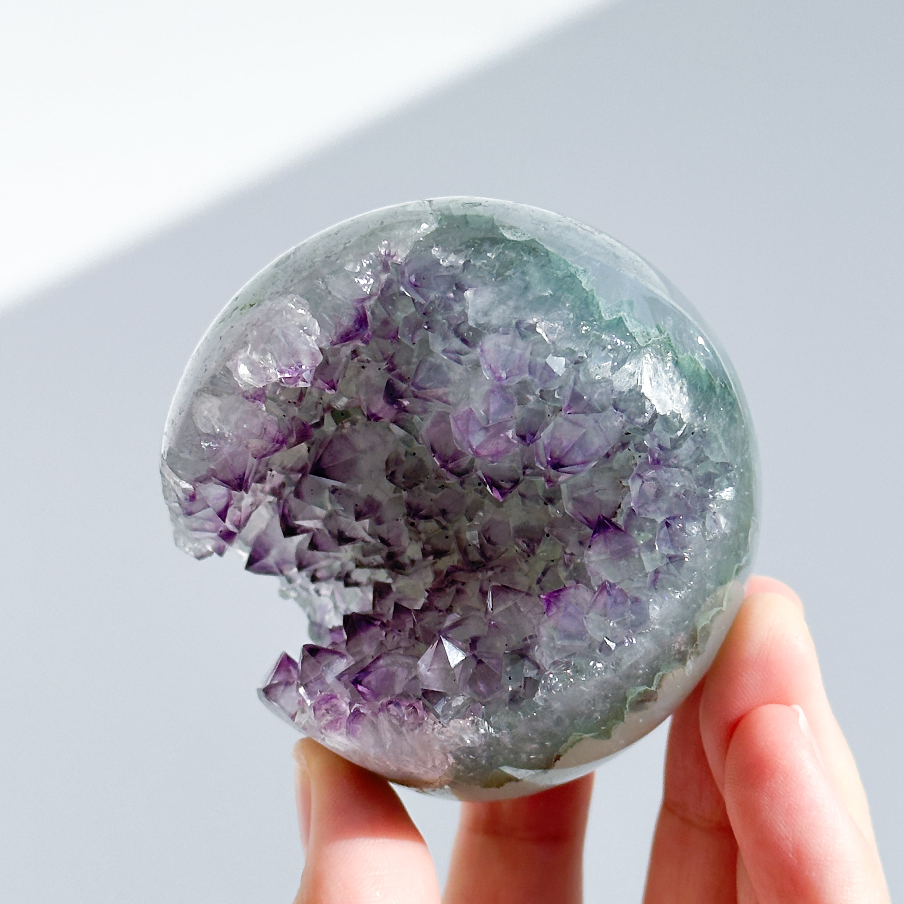 ウルグアイ産アメジストのジオードをスフィア(丸玉)に加工しました。