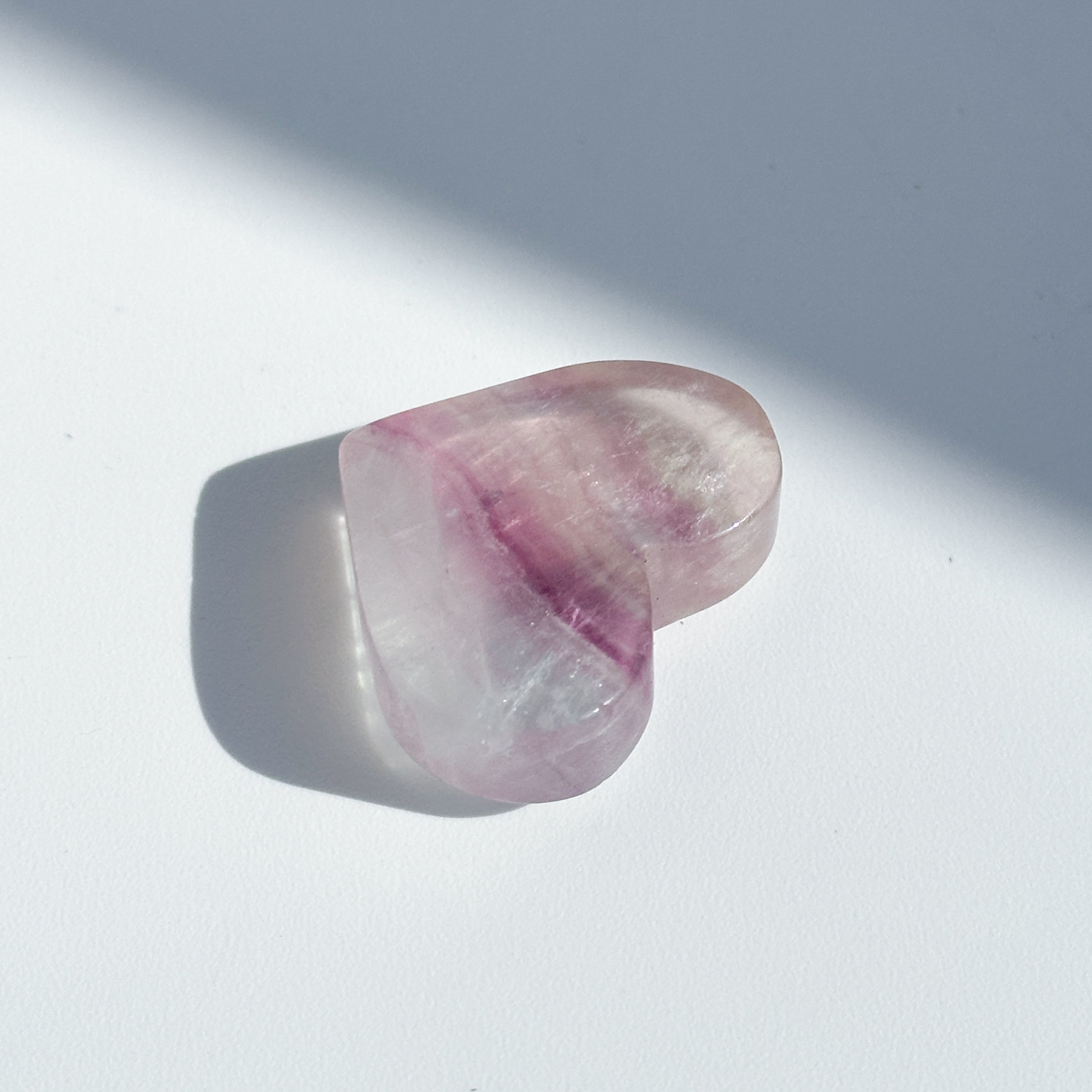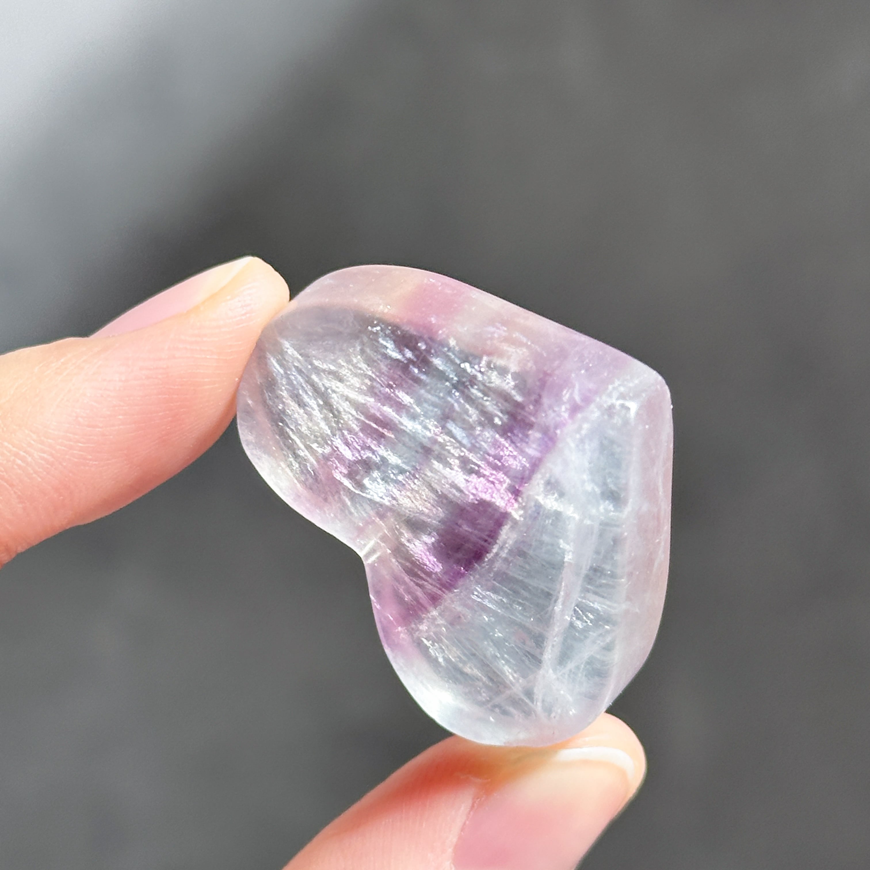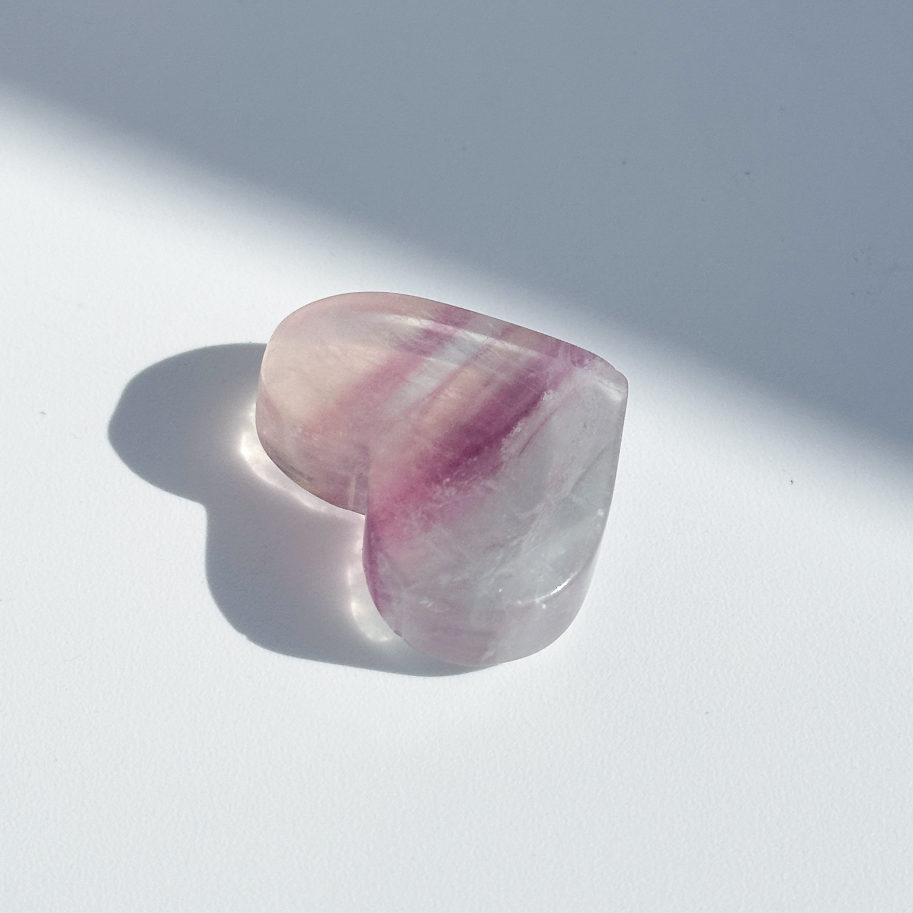 レインボーフローライトは複数のカラー(透明・パープル・ブルー・ピンク・グリーン)が共生し、水面のような曲線の模様を生み出しています。