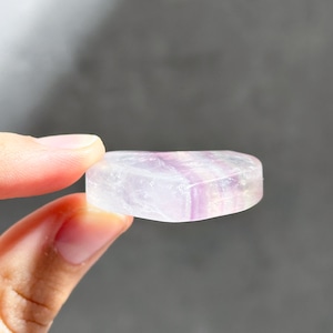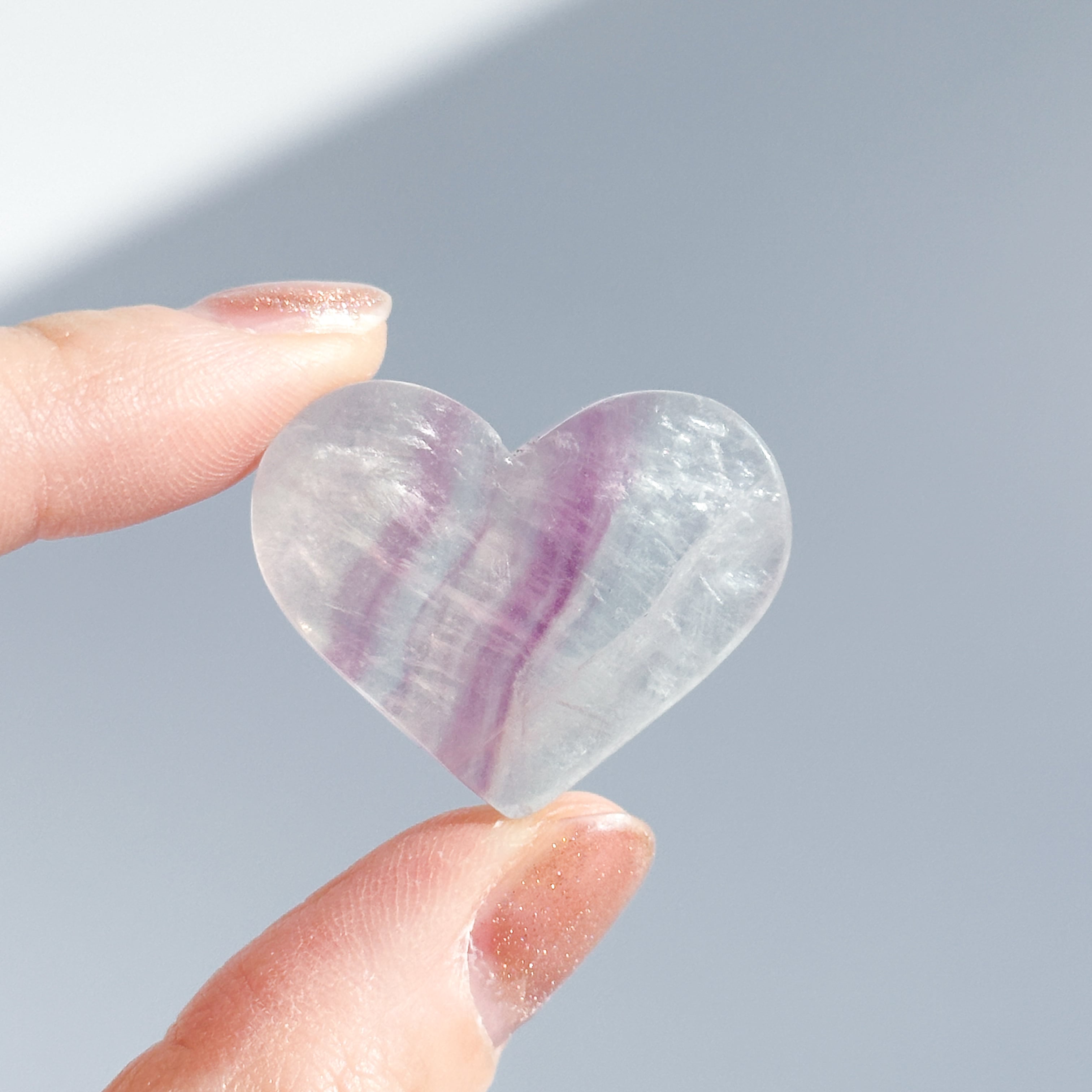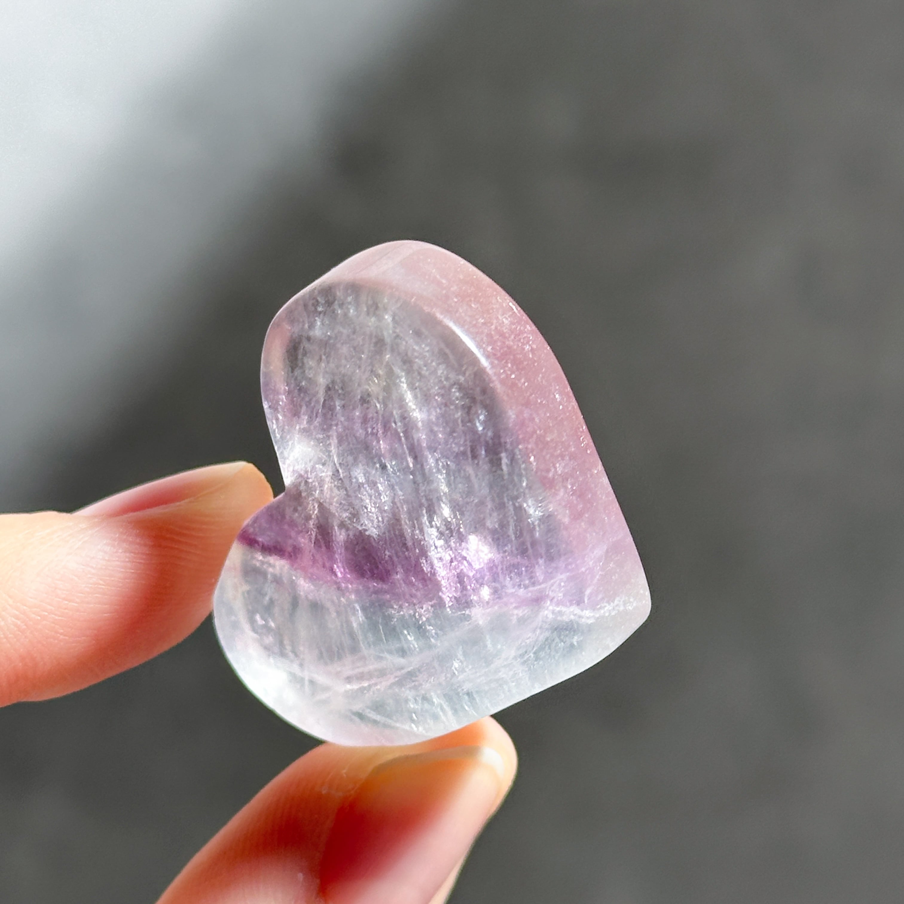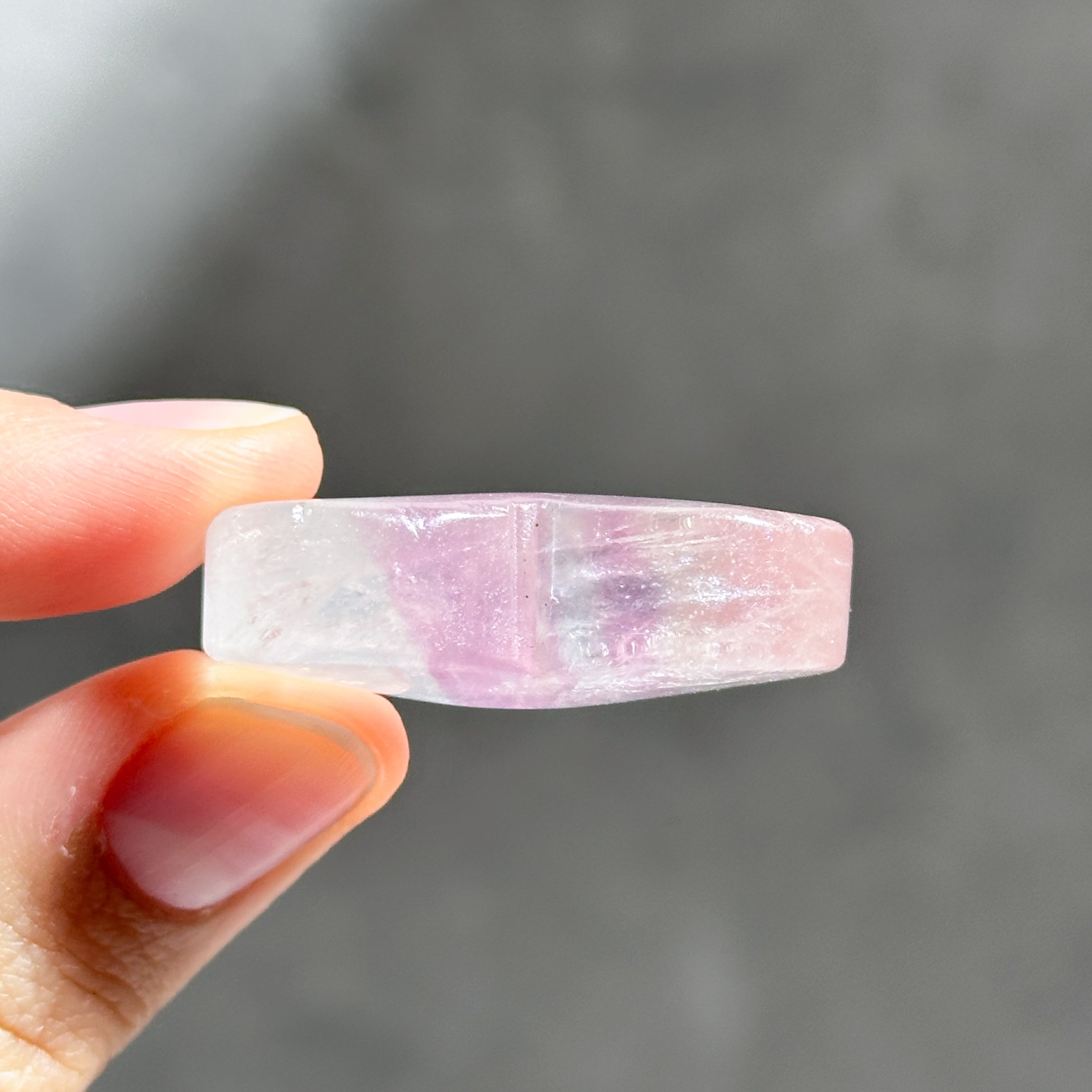レインボーフローライトは複数のカラー(透明・パープル・ブルー・ピンク・グリーン)が共生し、水面のような曲線の模様を生み出しています。