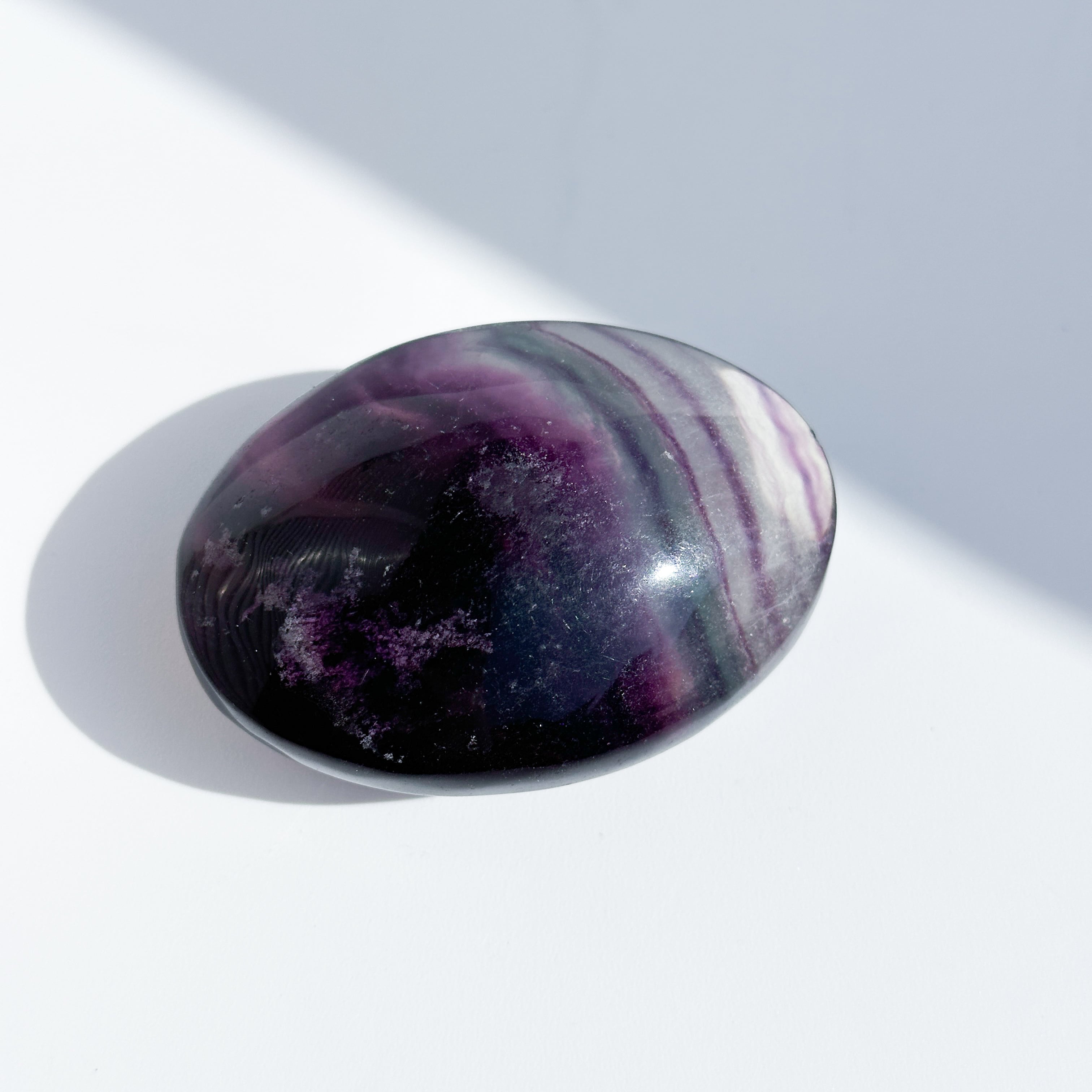 レインボーフローライトは複数のカラー(透明・パープル・ブルー・ピンク・グリーン)が共生し、水面のような曲線の模様を生み出しています。