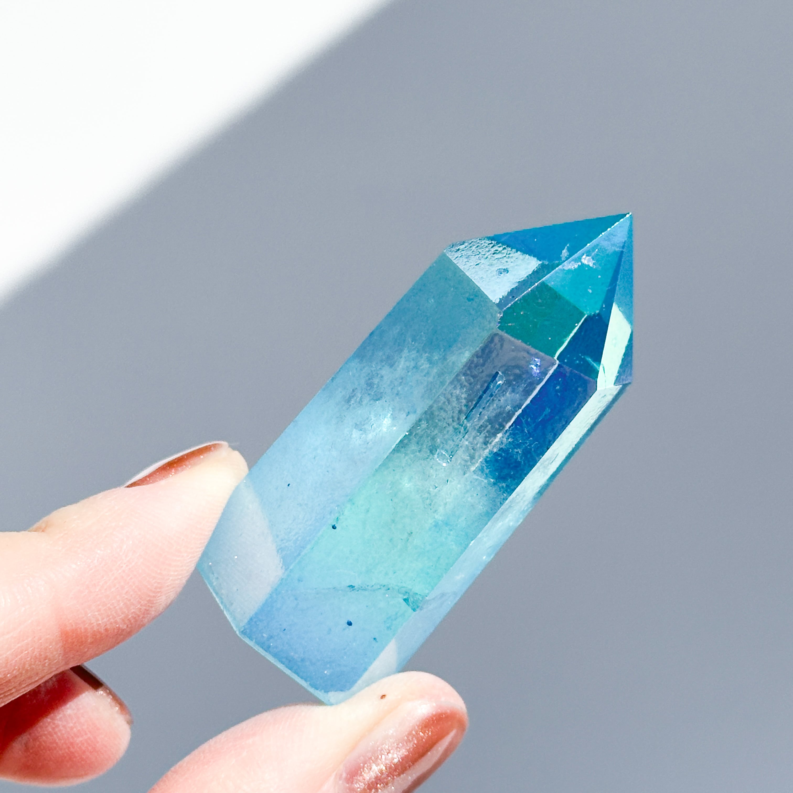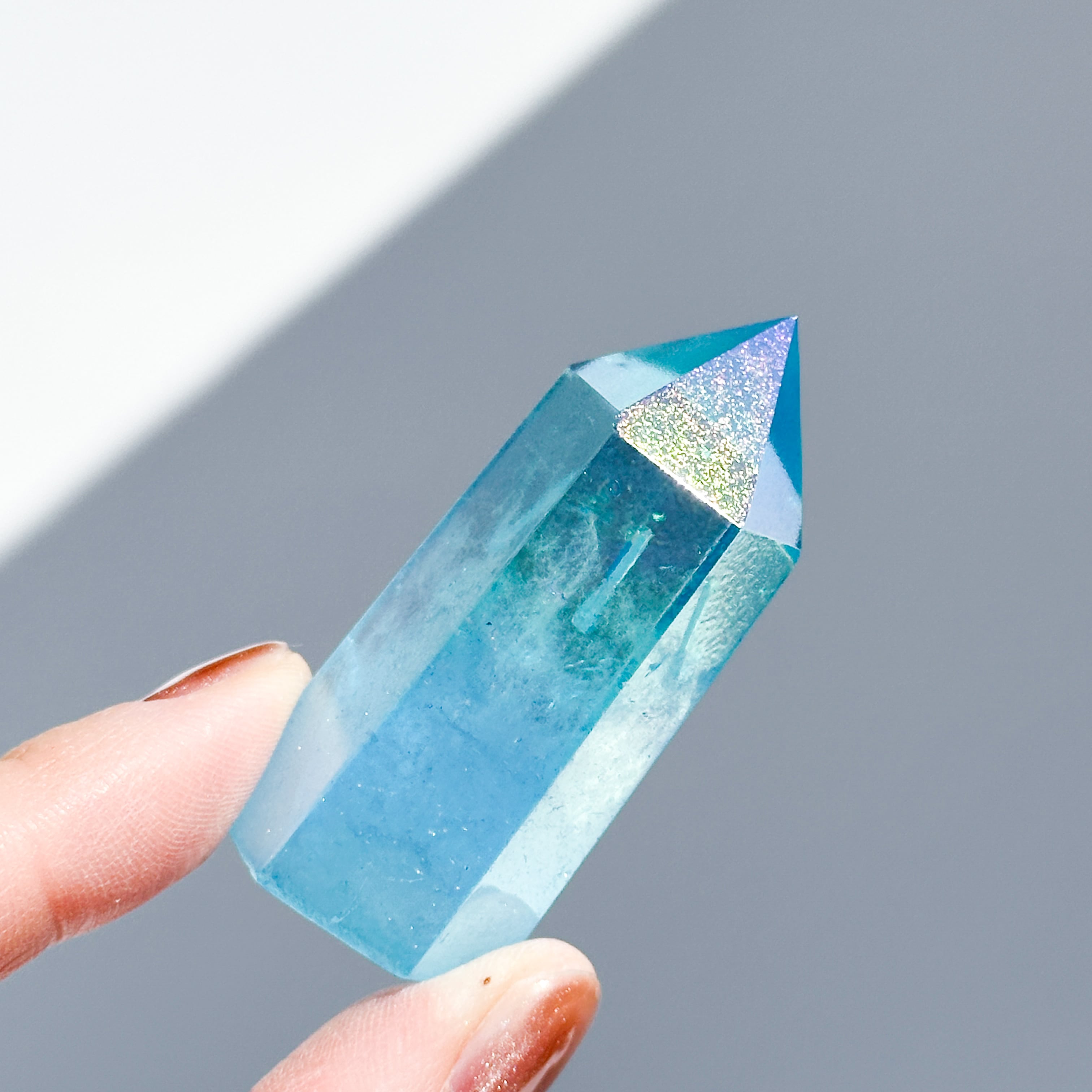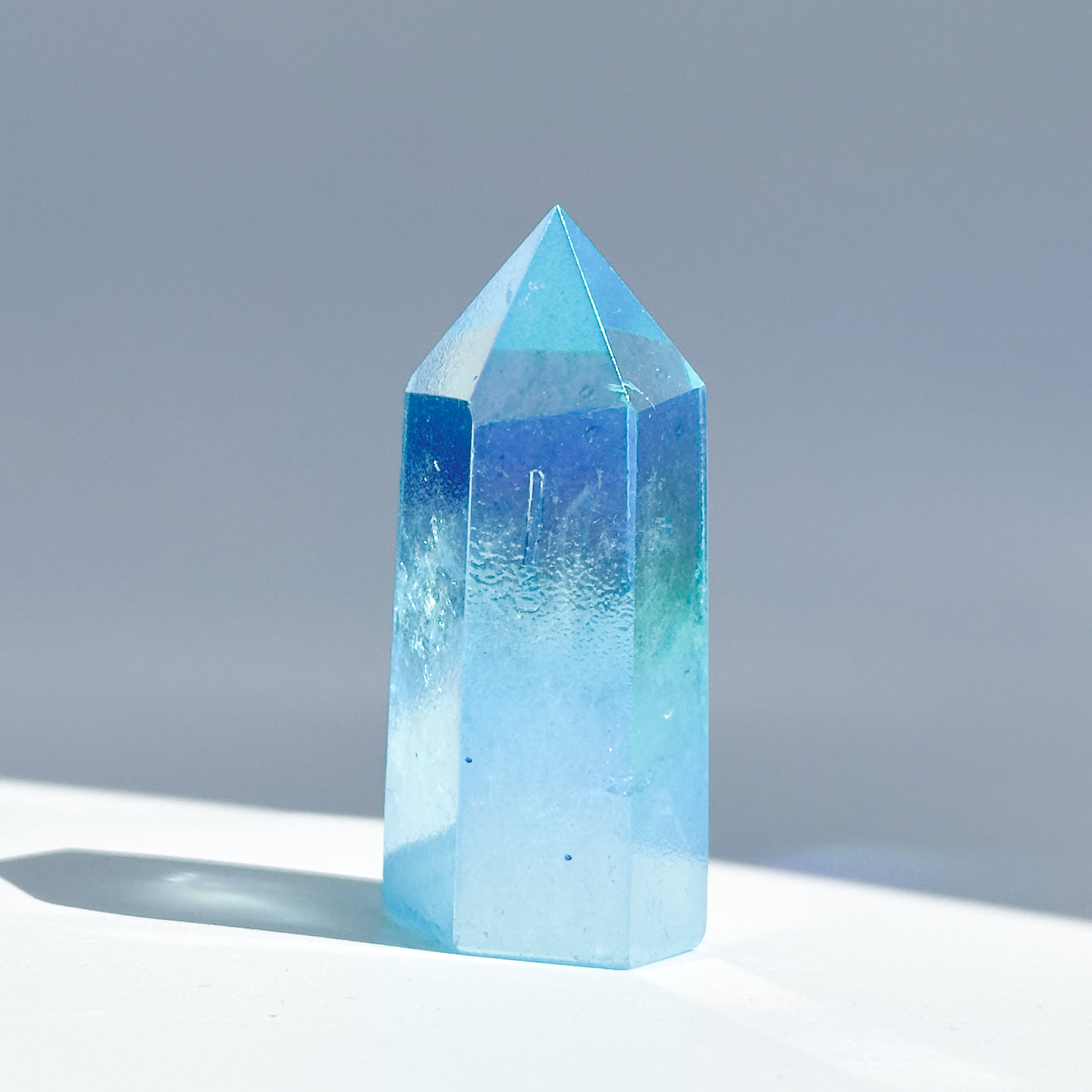 天然のクリアクォーツに、金属の薄い膜をコーティング(蒸着)する加工を加え、