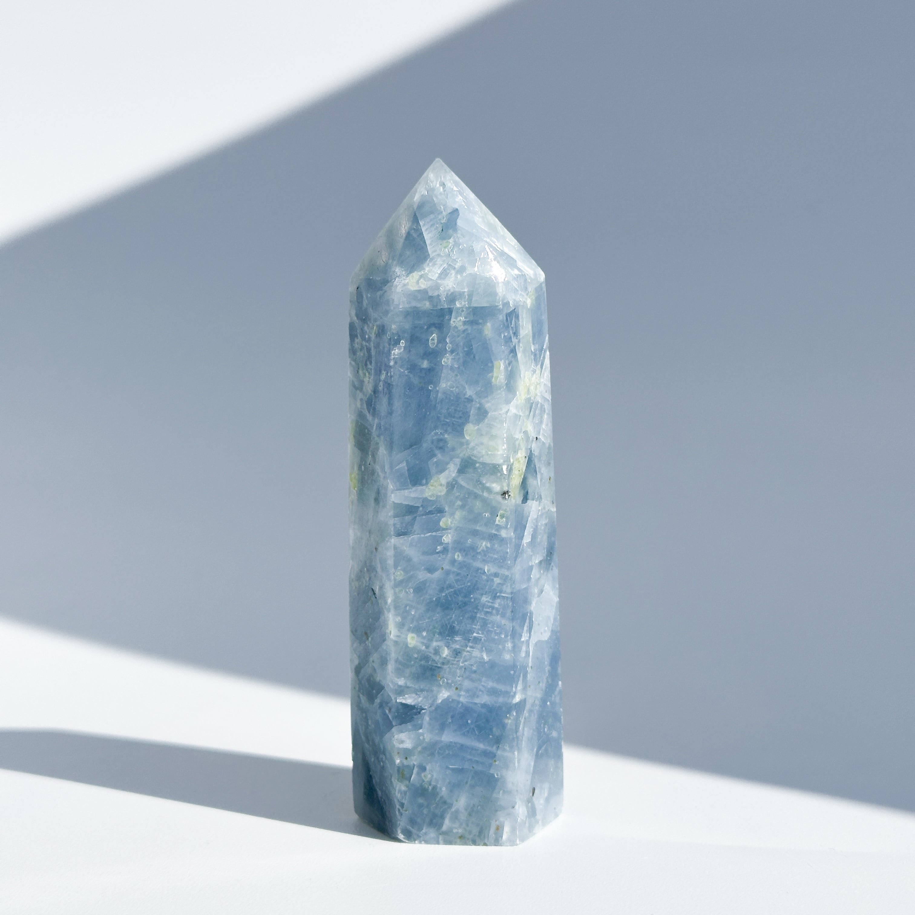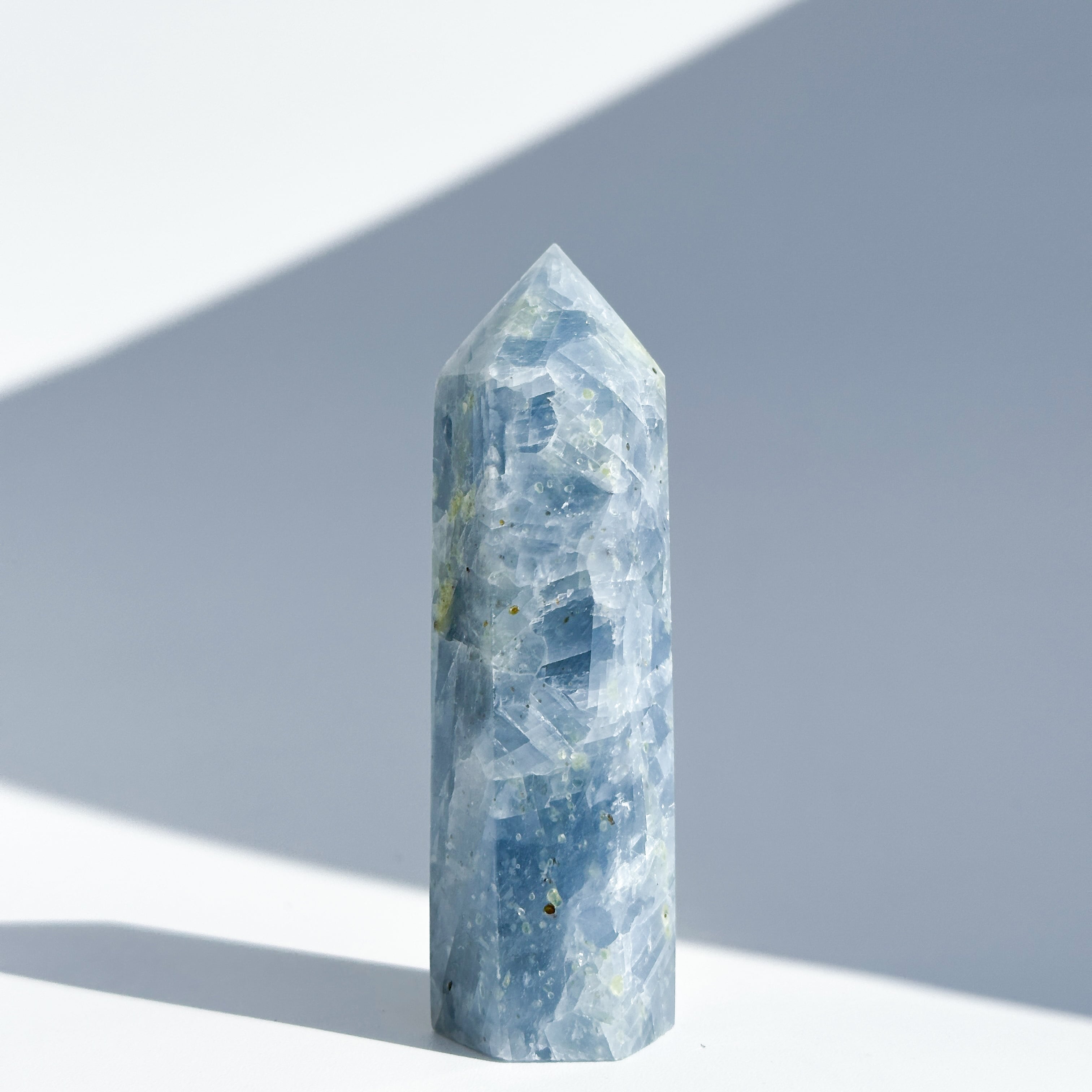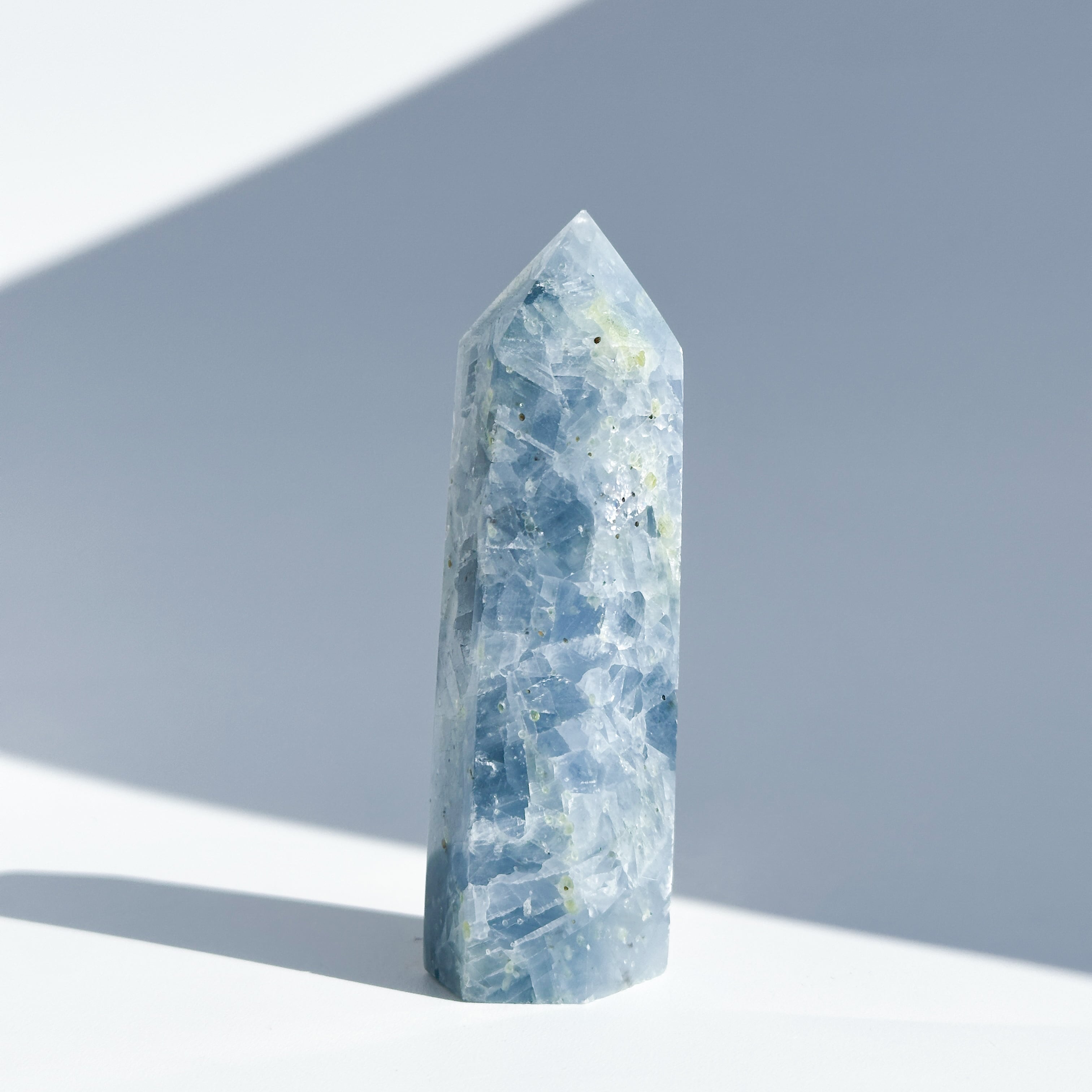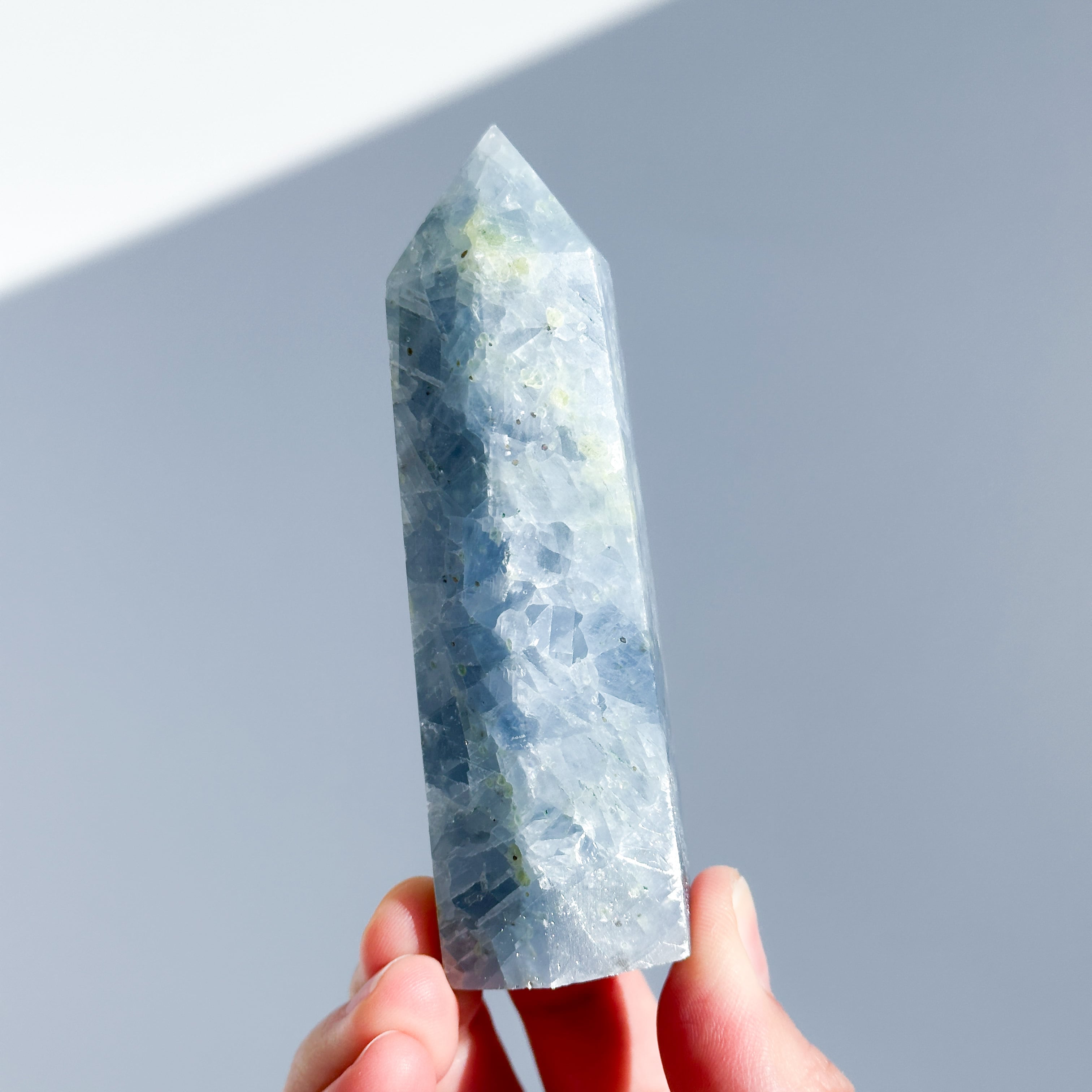 澄み渡るライトブルーの天然石、セレスタイトをタワー型に研磨しました。