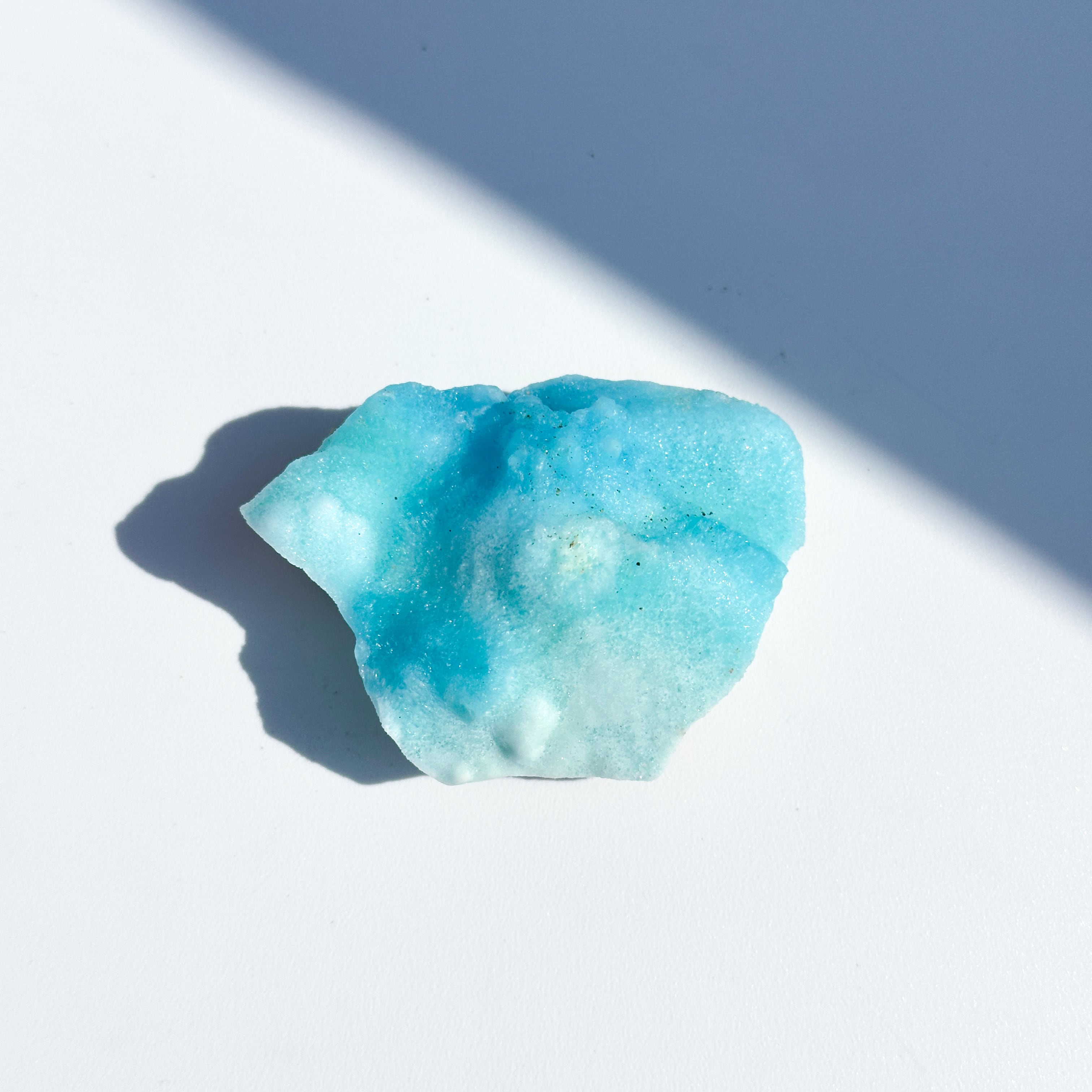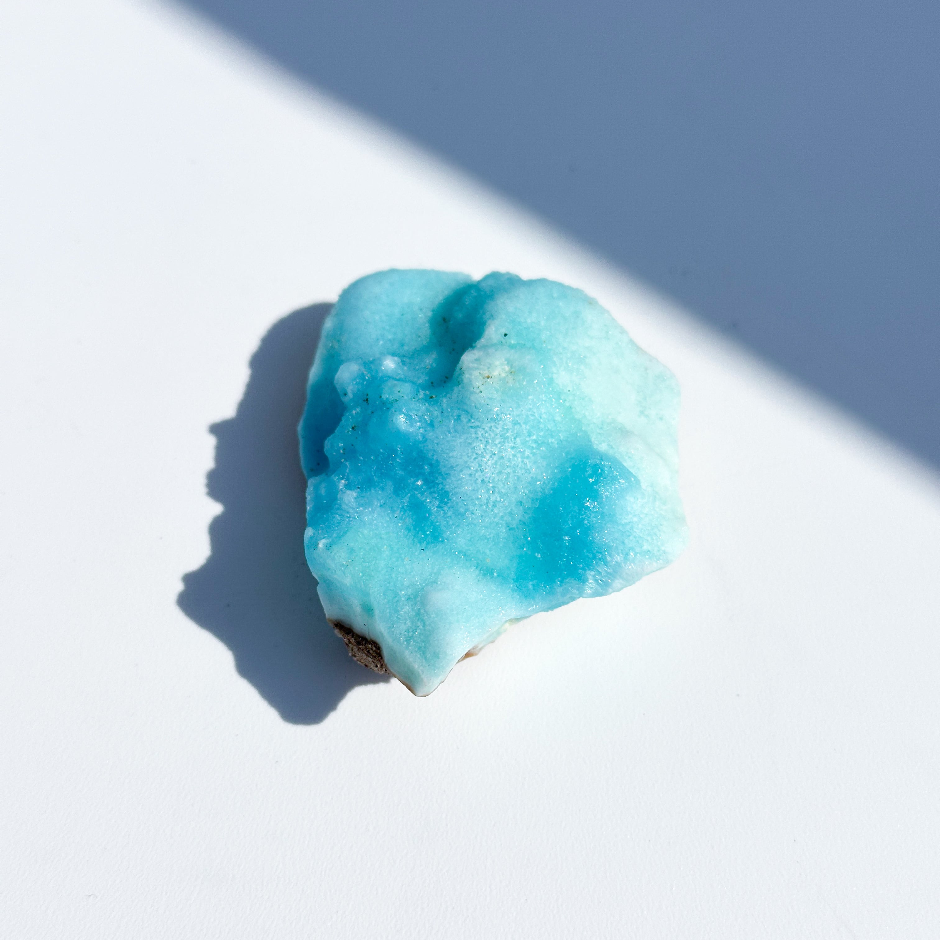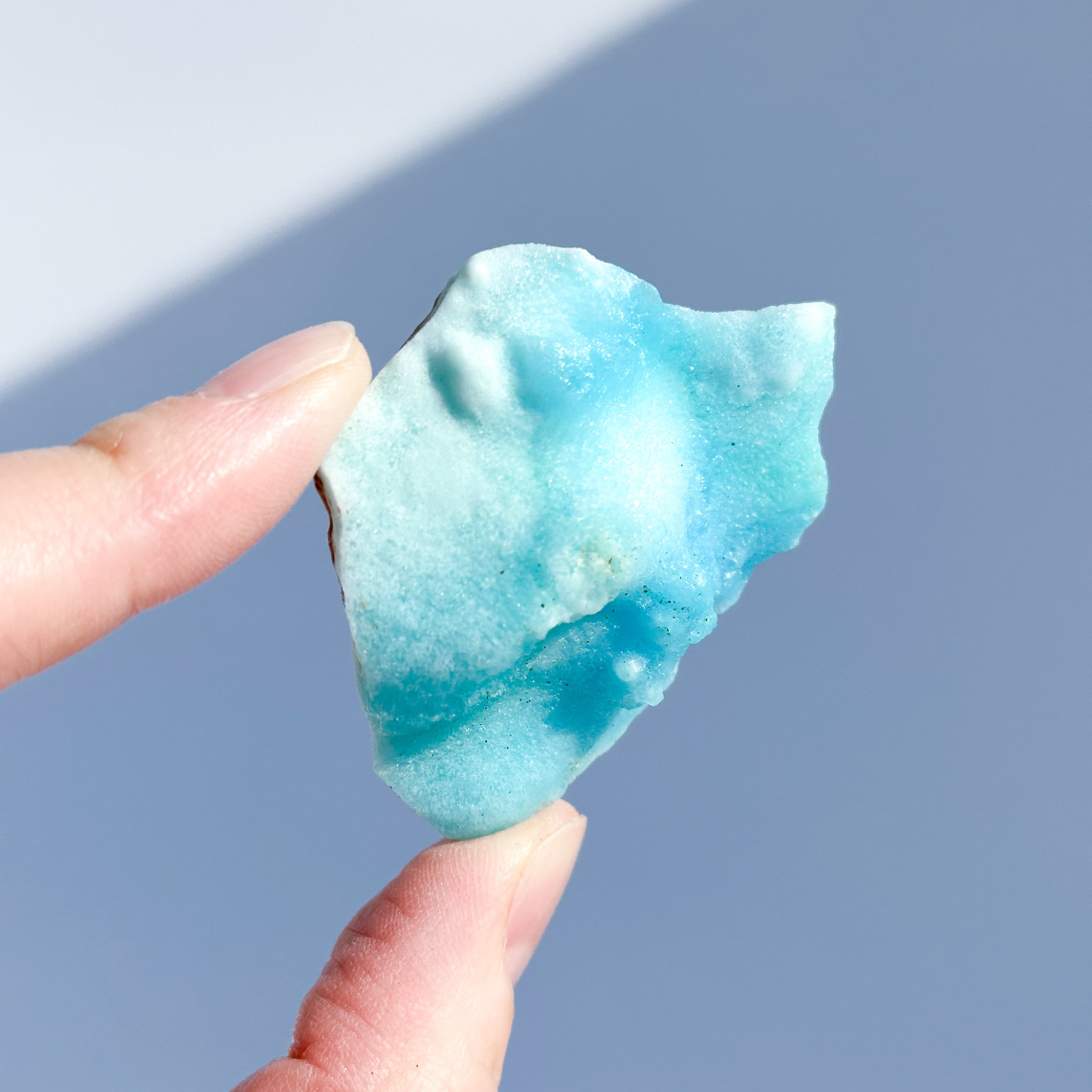 カルサイトの仲間でマラカイトやアズライトなど様々な鉱物と共に産出され、含有する成分の違いによる色の種類も豊か。その中で銅を多く含んだものがブルーやグリーンに発色します。