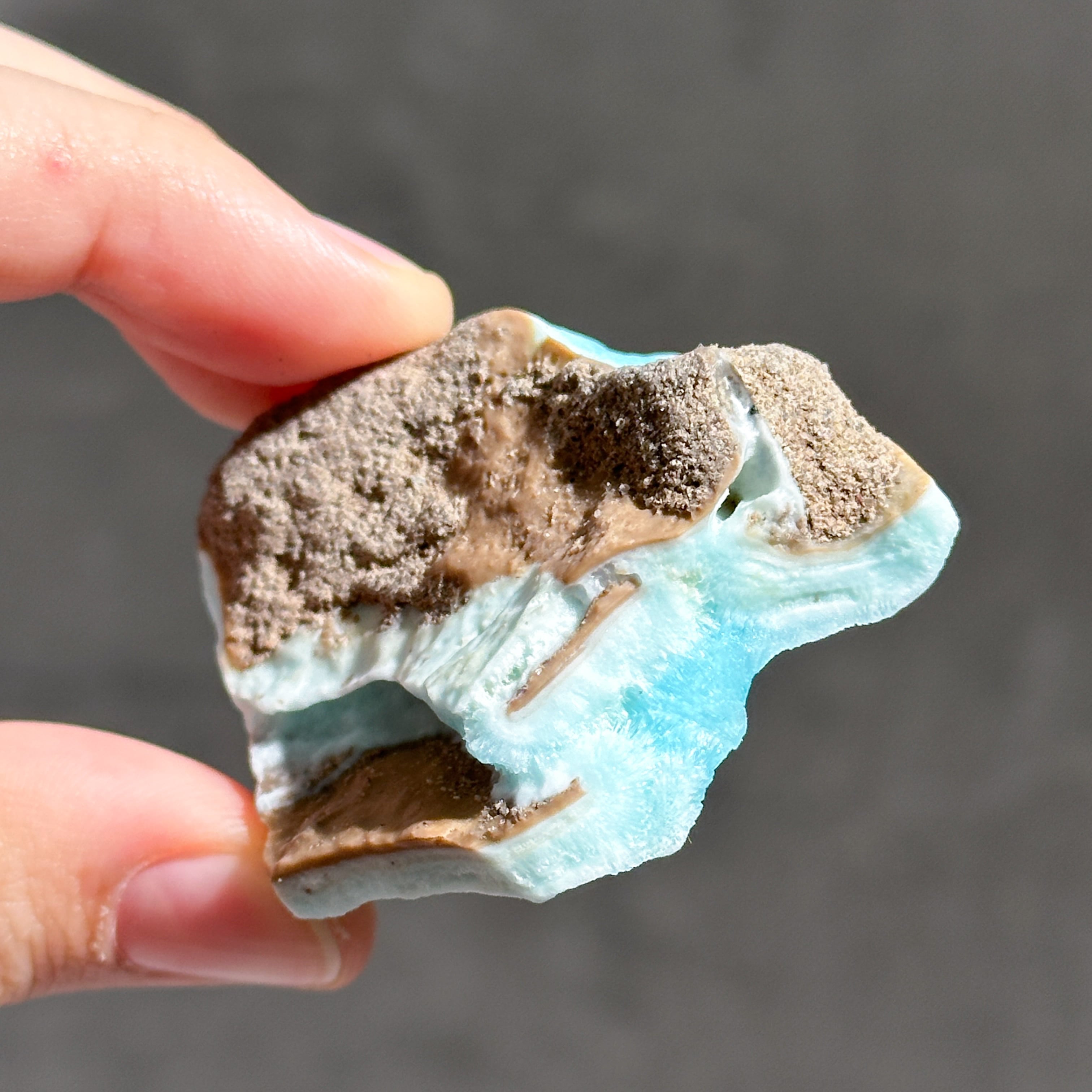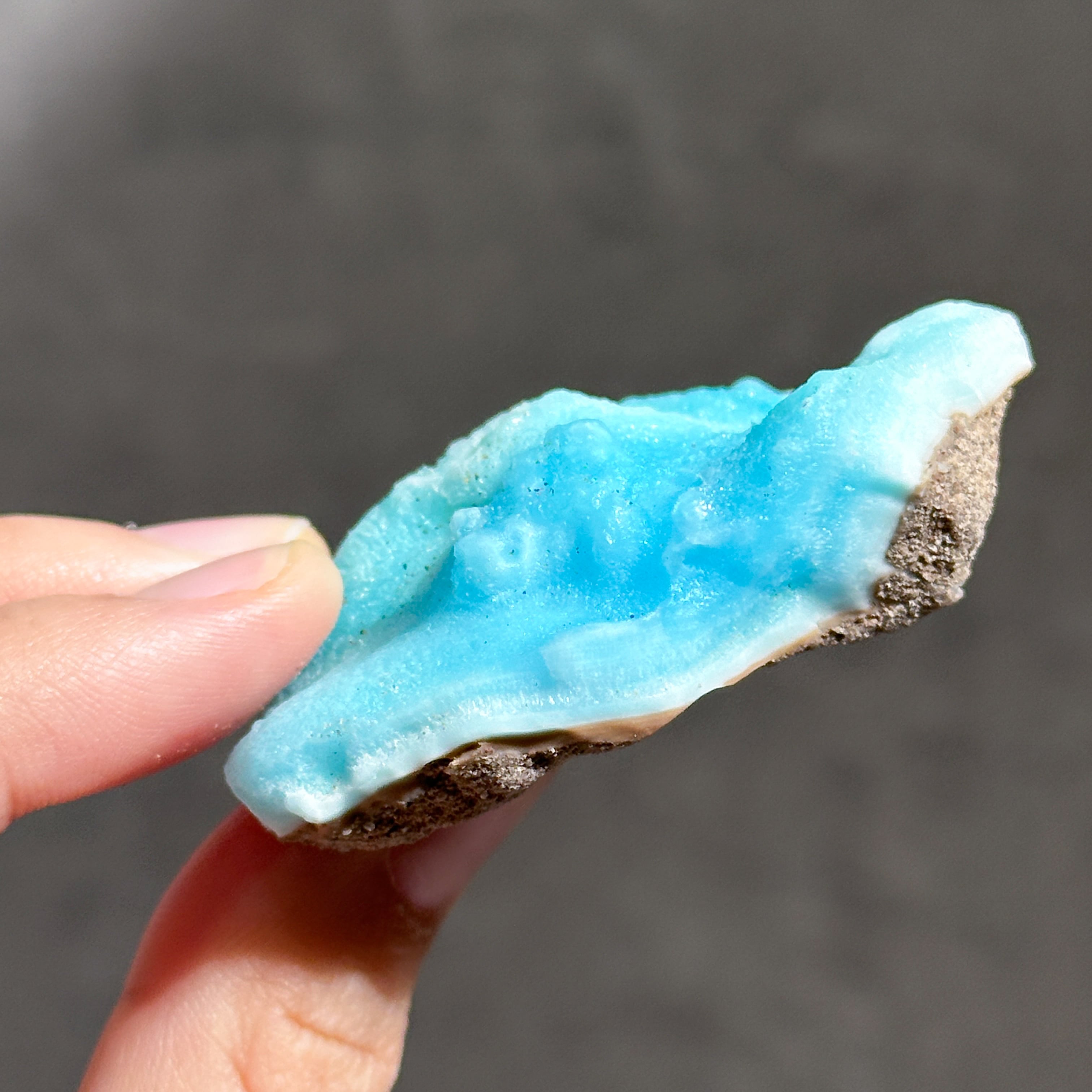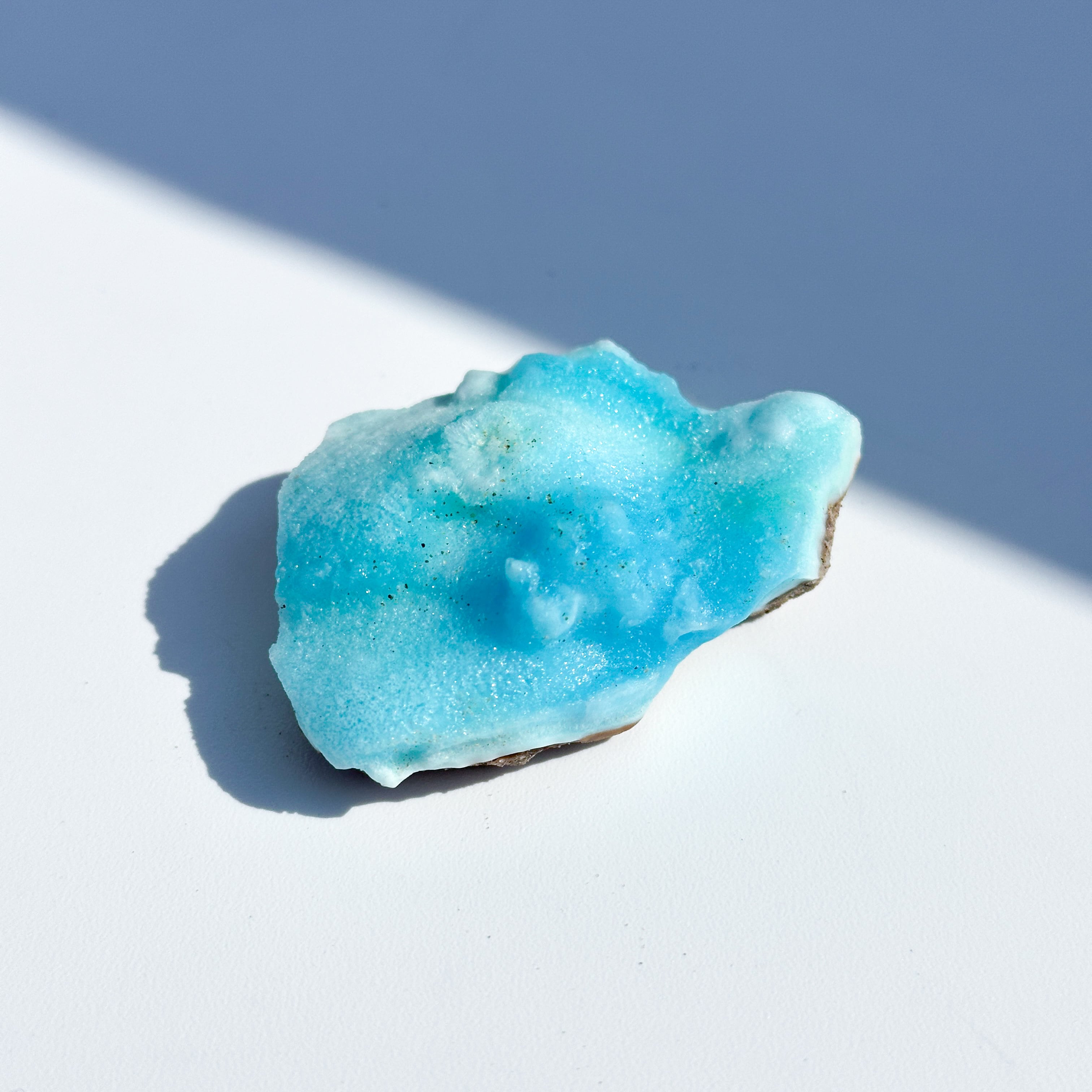 カルサイトの仲間でマラカイトやアズライトなど様々な鉱物と共に産出され、含有する成分の違いによる色の種類も豊か。その中で銅を多く含んだものがブルーやグリーンに発色します。