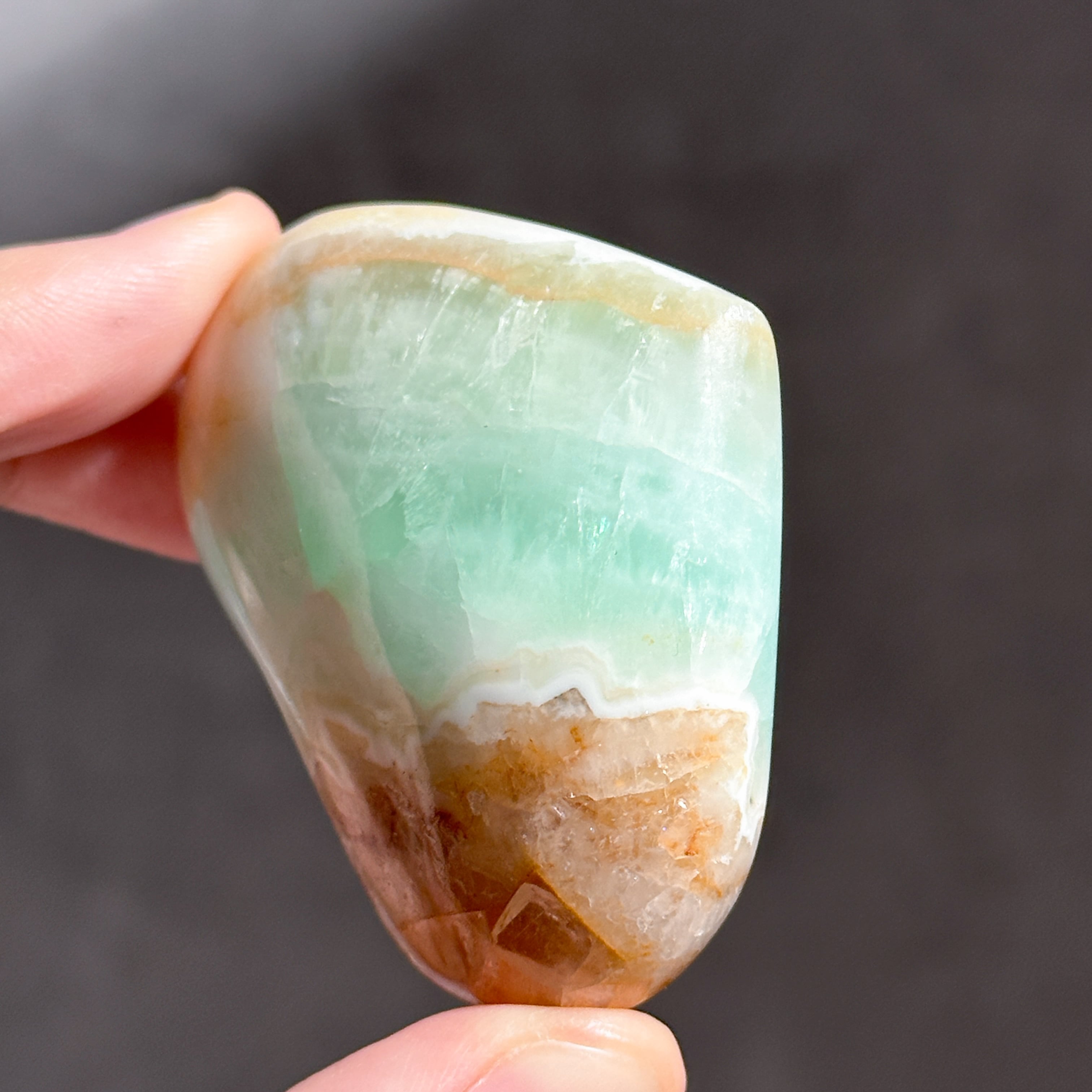 ブルーカルサイトと言われていた青い部分を含め、全体的にアラゴナイトであることが判明しました。ただ世界的にこの名前で流通しており、鉱物名と流通名が異なることはよくあることですので、このまま「カリビアンブルーカルサイト」という名称で紹介させていただきます。