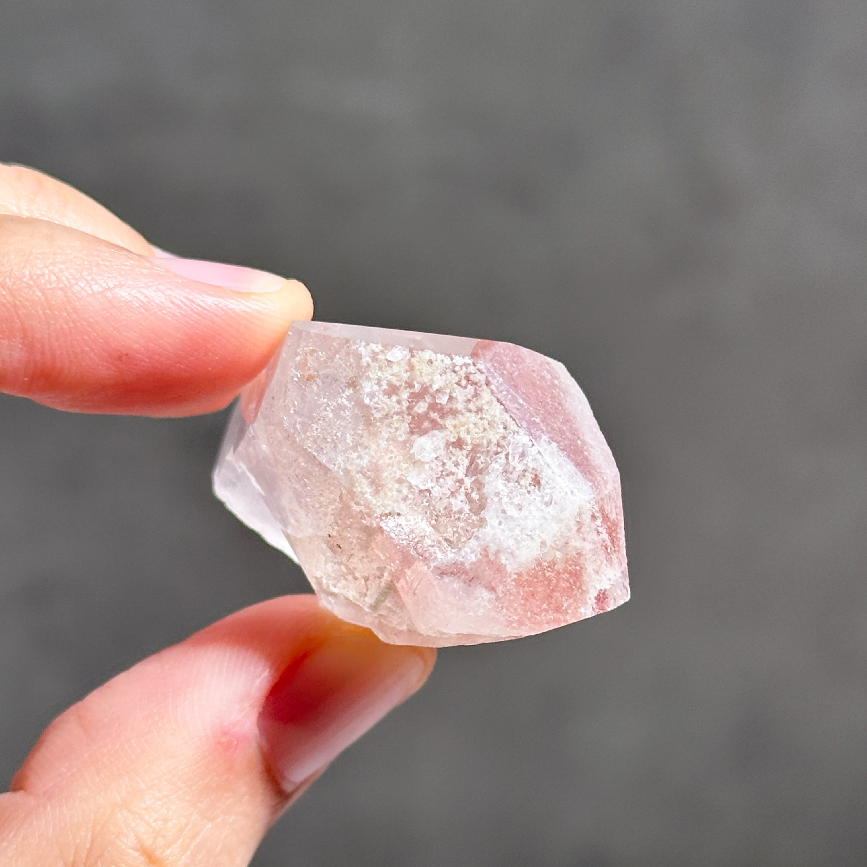 ピンクレムリアンはレッドヘマタイトの鉄分が表面に付着し、赤みを帯びたピンクカラーに色付いたもの。
