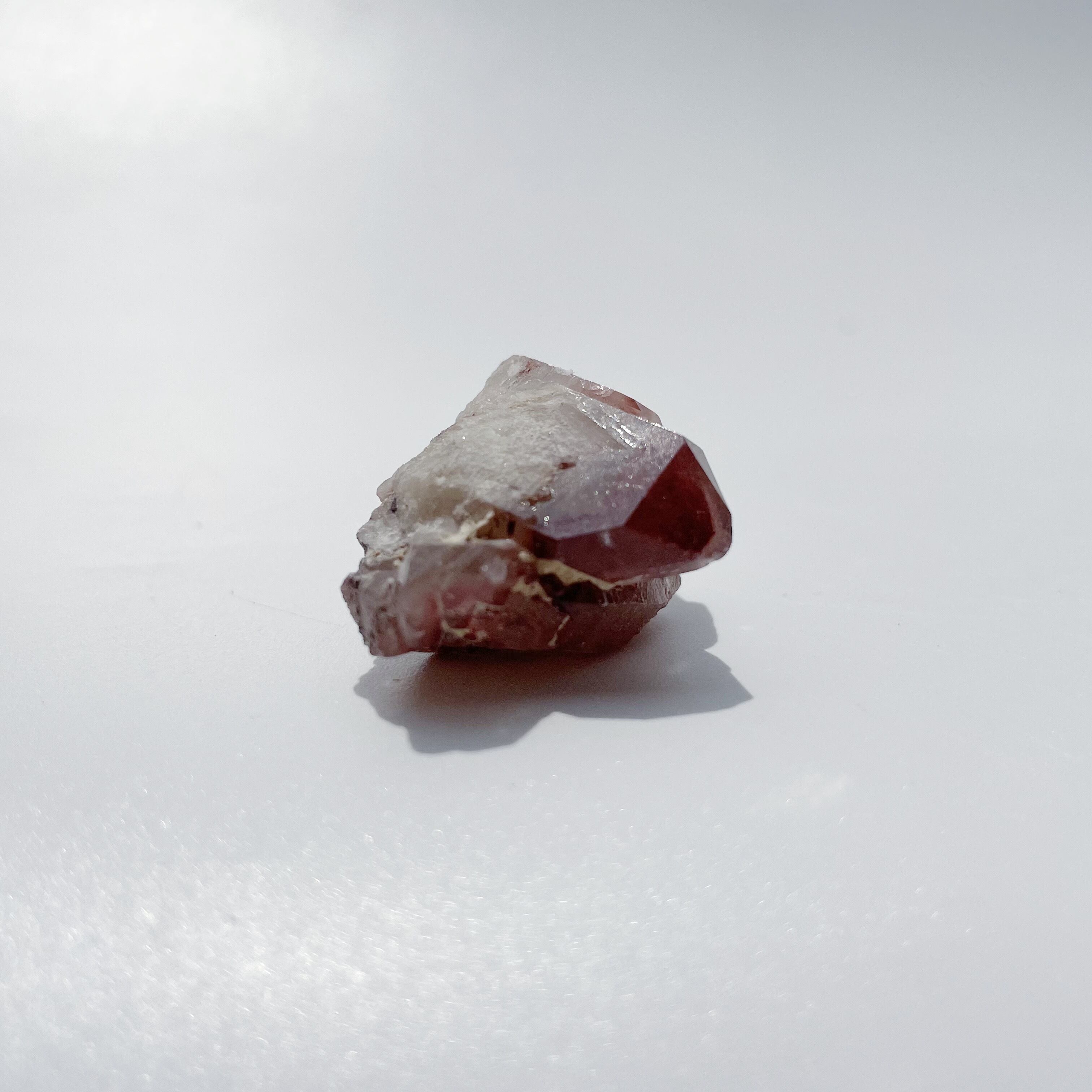 水晶の中に内包されたヘマタイトが酸化/変色することで、赤い色なったものです。