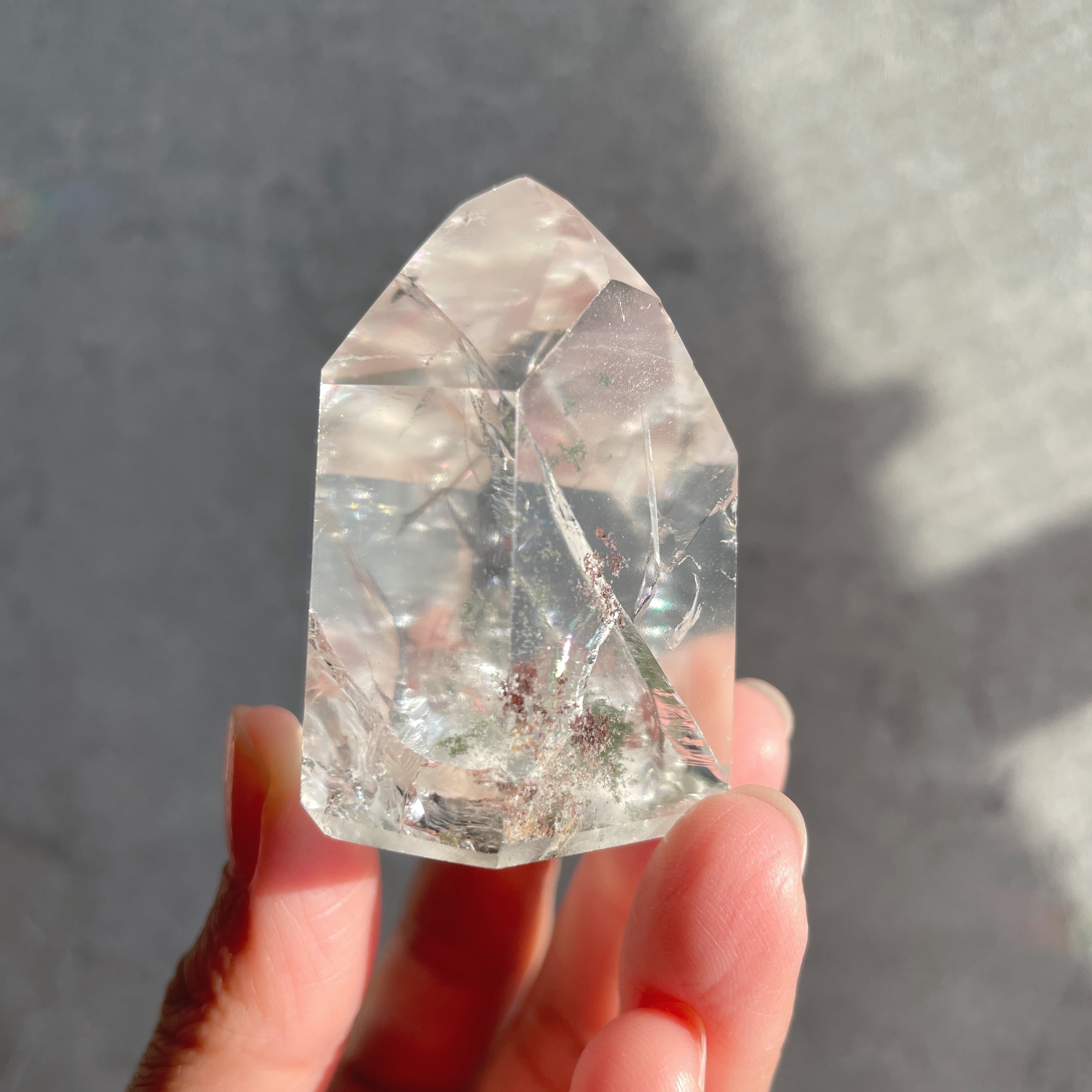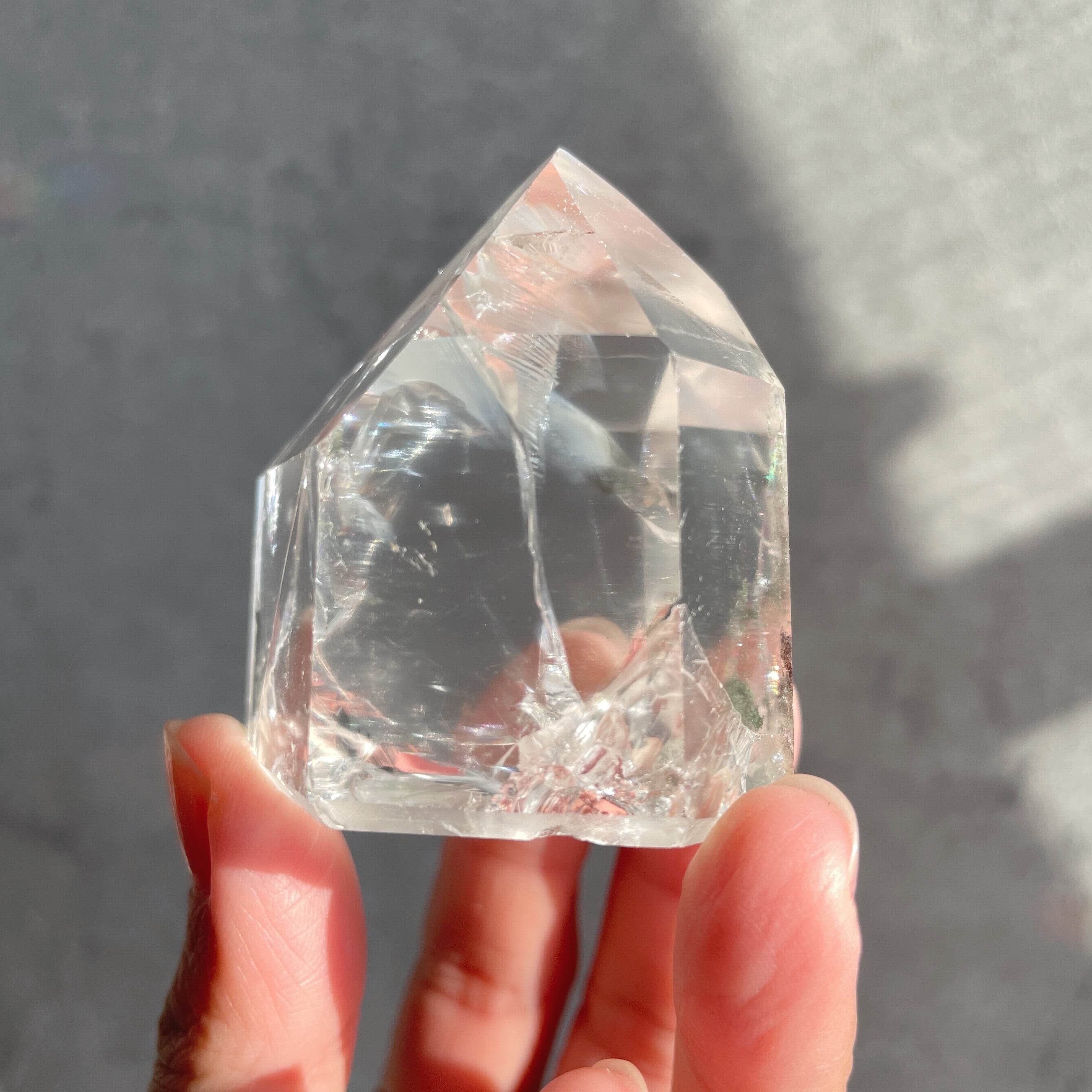 水晶にクラック(ひびや割れ)があると、光が屈折して、プリズムのようにレインボーの七色の輝きが見られます。