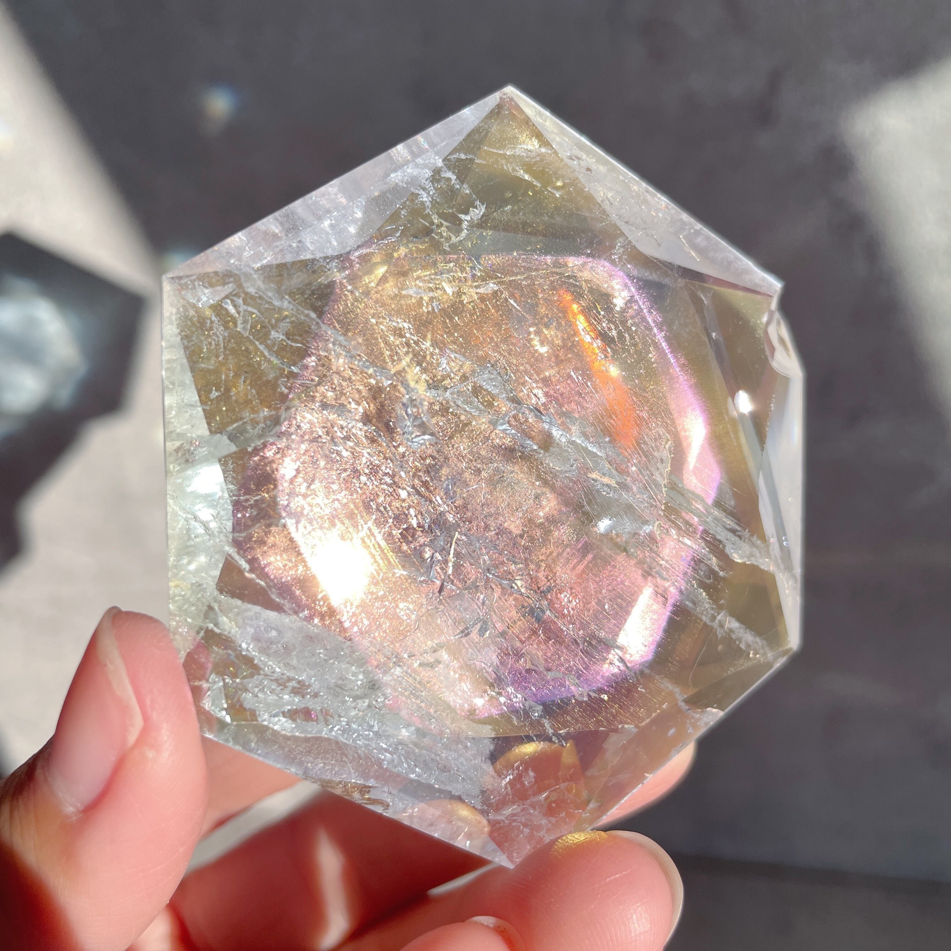 ヘキサグラム(六芒星)とヘキサゴン(六角形)を組み合わせたカットを施したクリアクォーツに、エンジェルオーラ加工を施しました。