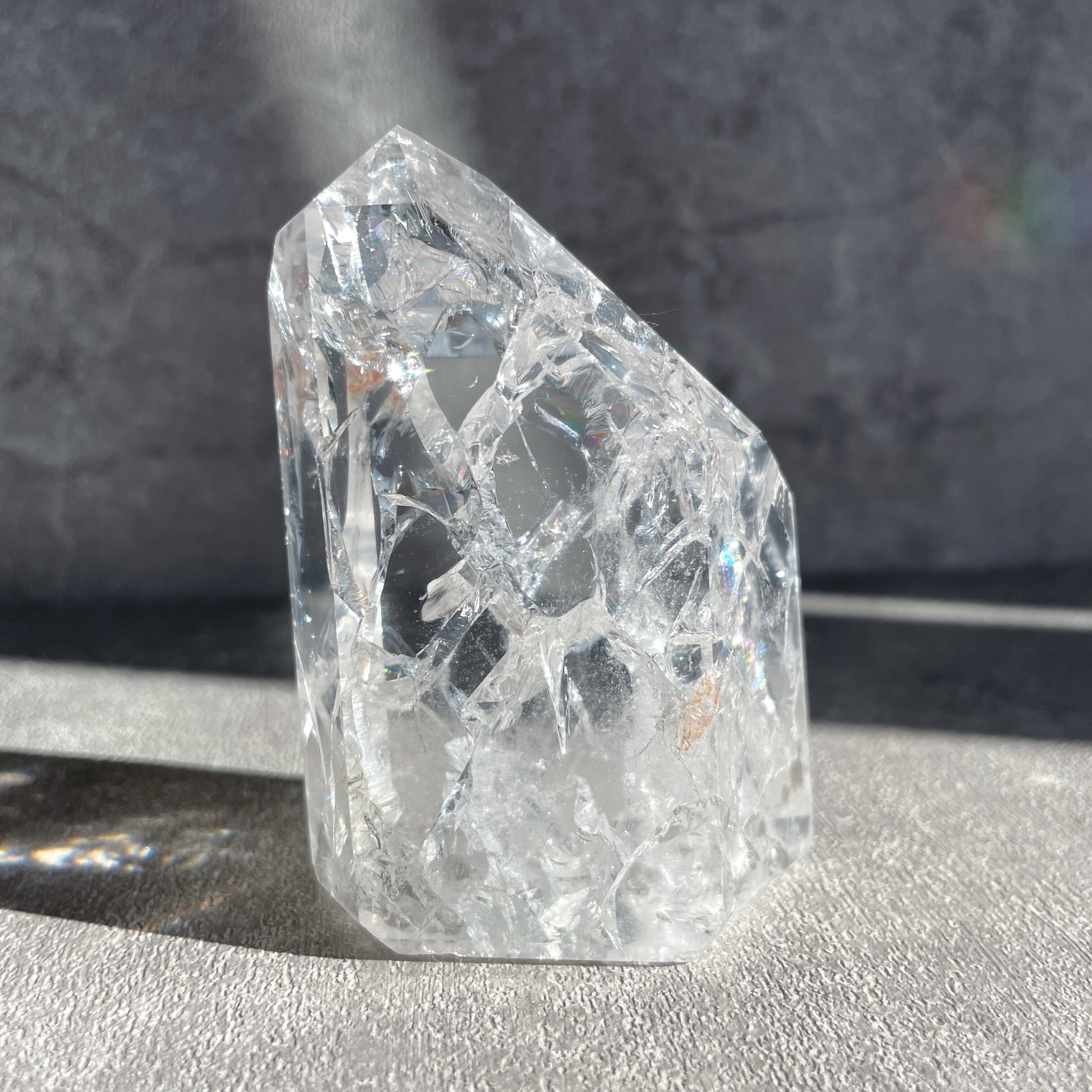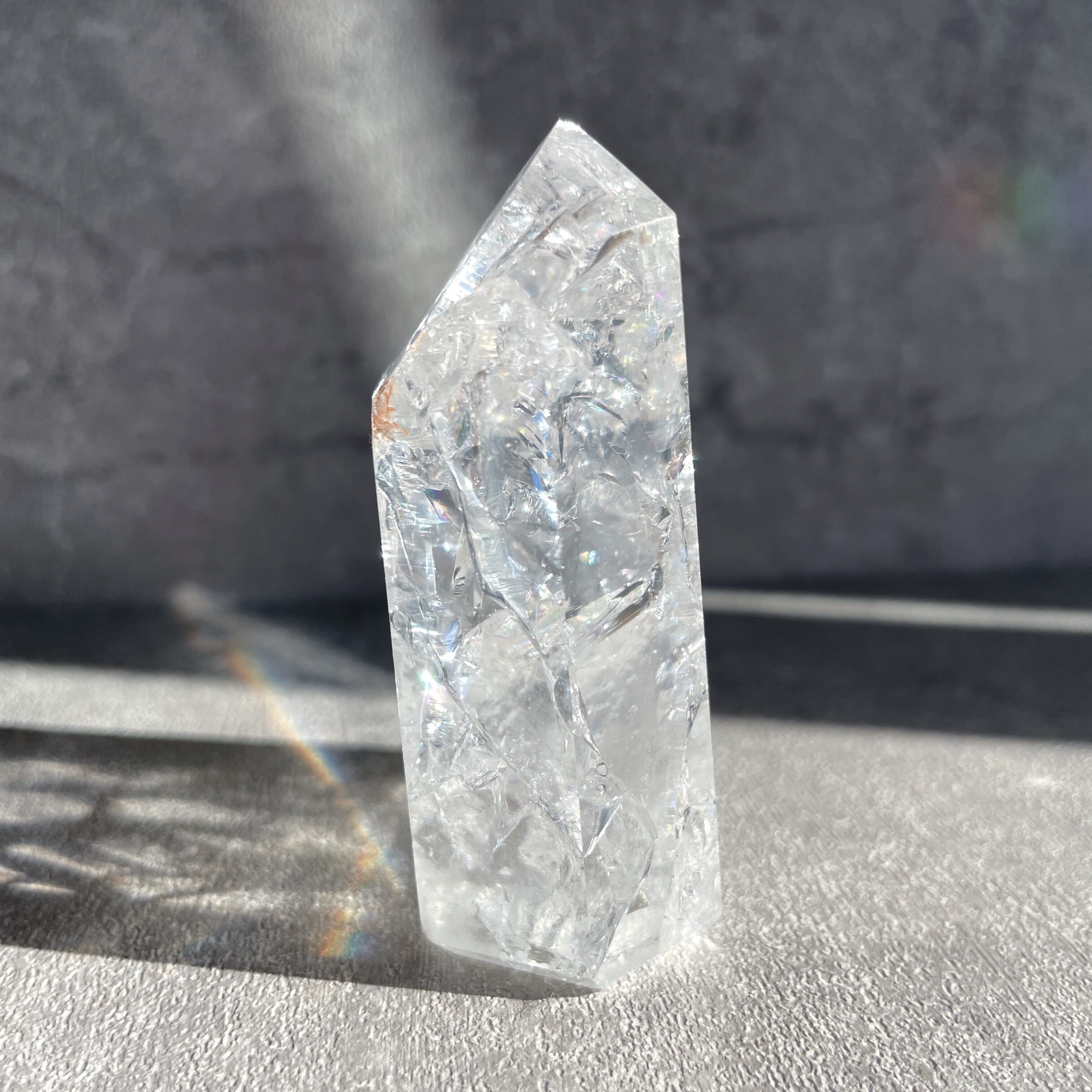 水晶にクラック(ひびや割れ)があると、光が屈折して、プリズムのようにレインボーの七色の輝きが見られます。