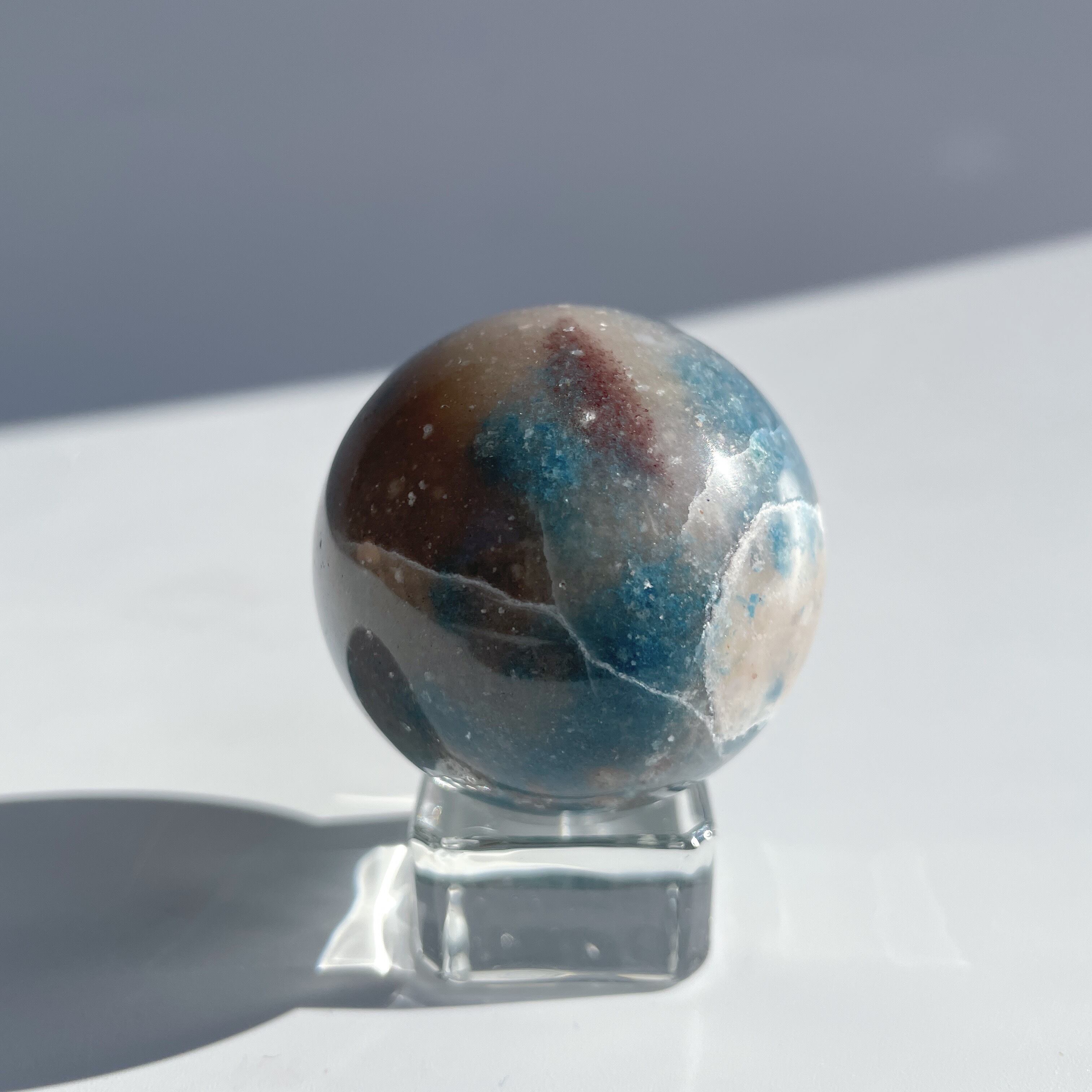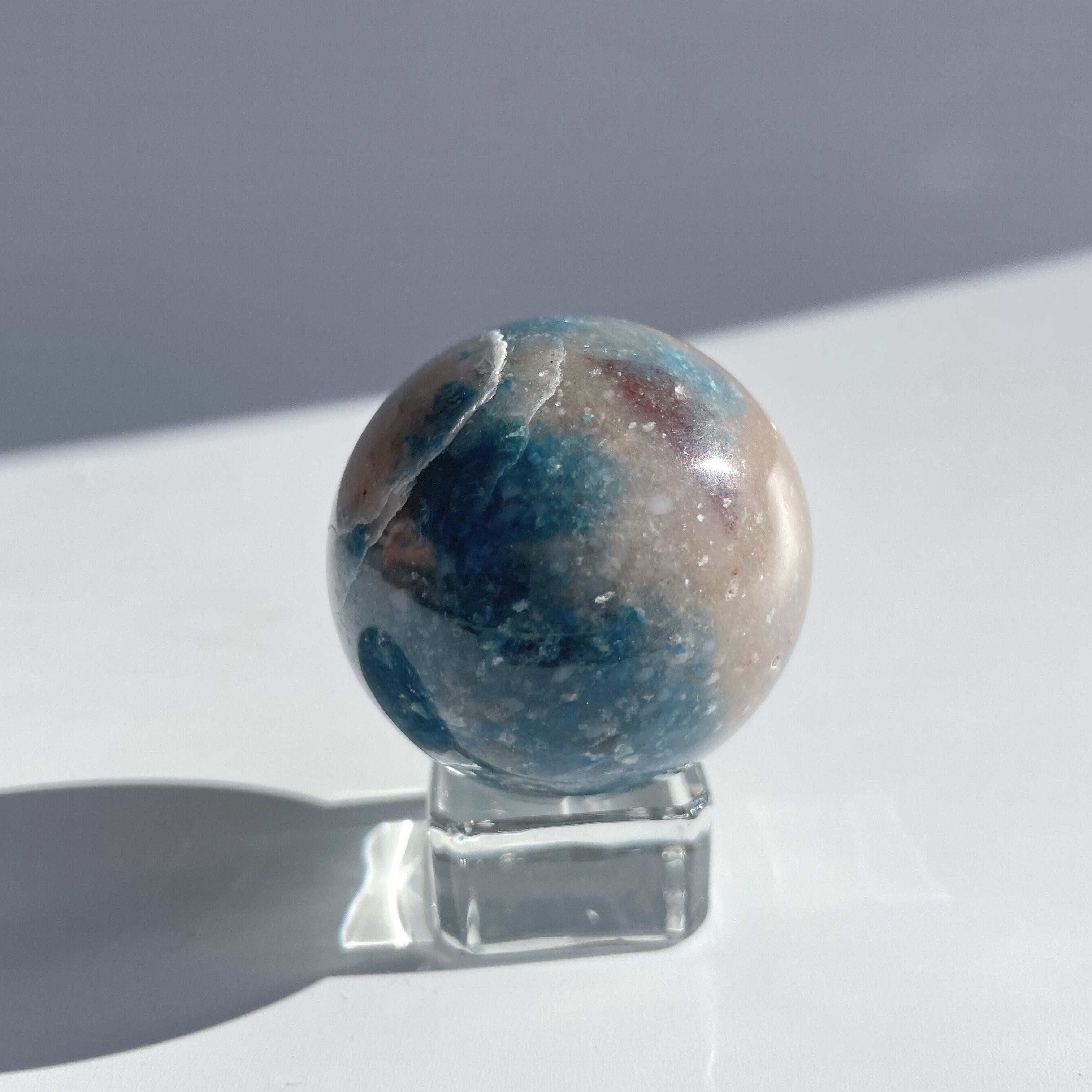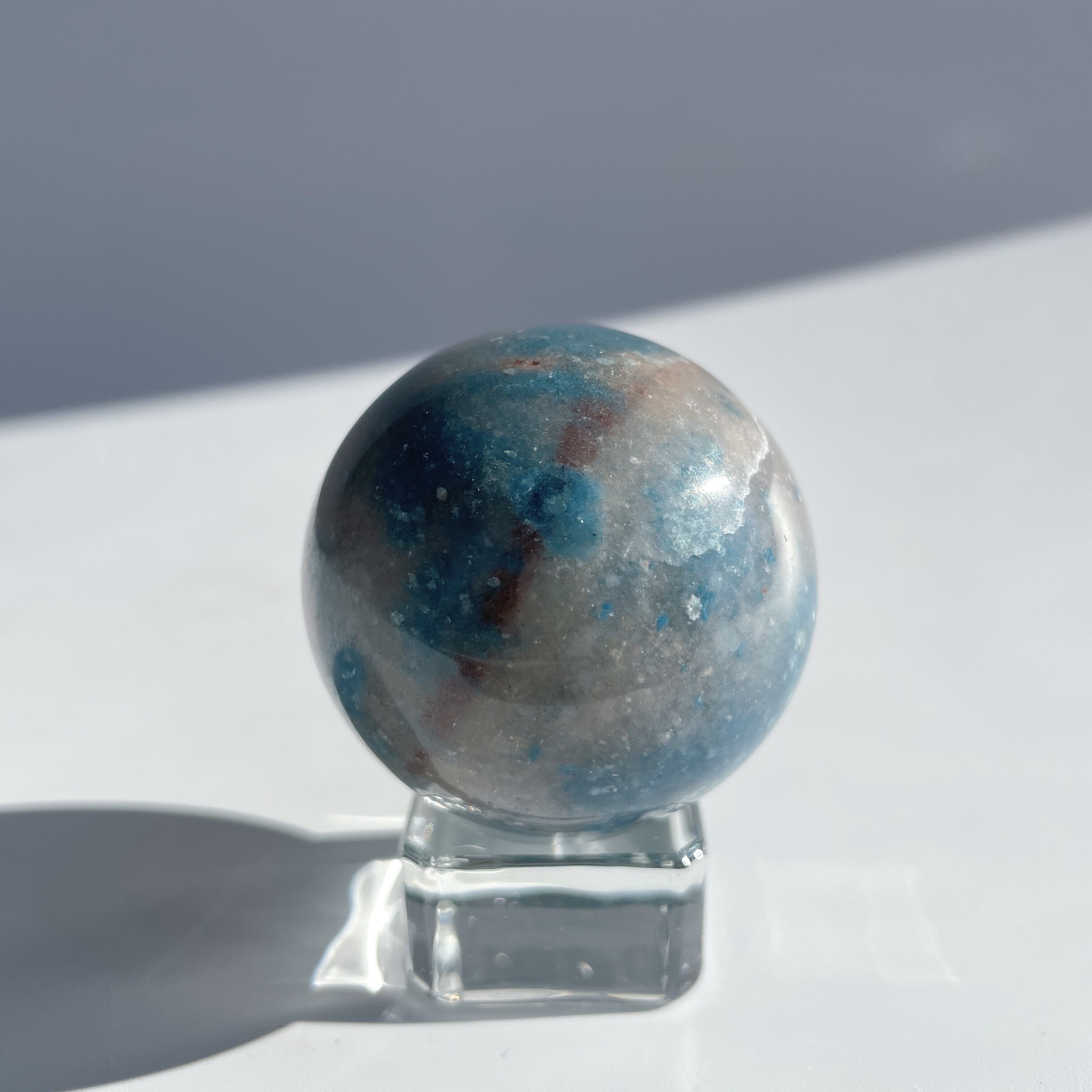ここでは「トロレアイト」と呼びますが、トロレアイト(青)・クォーツ(白)・ラズライト(濃い青)が混じったもののようで、曲線を描くグラデーションと引き込まれるような色合いを持つ鉱石です。面によって異なる表情を見せる、世界に二つとないお品です。