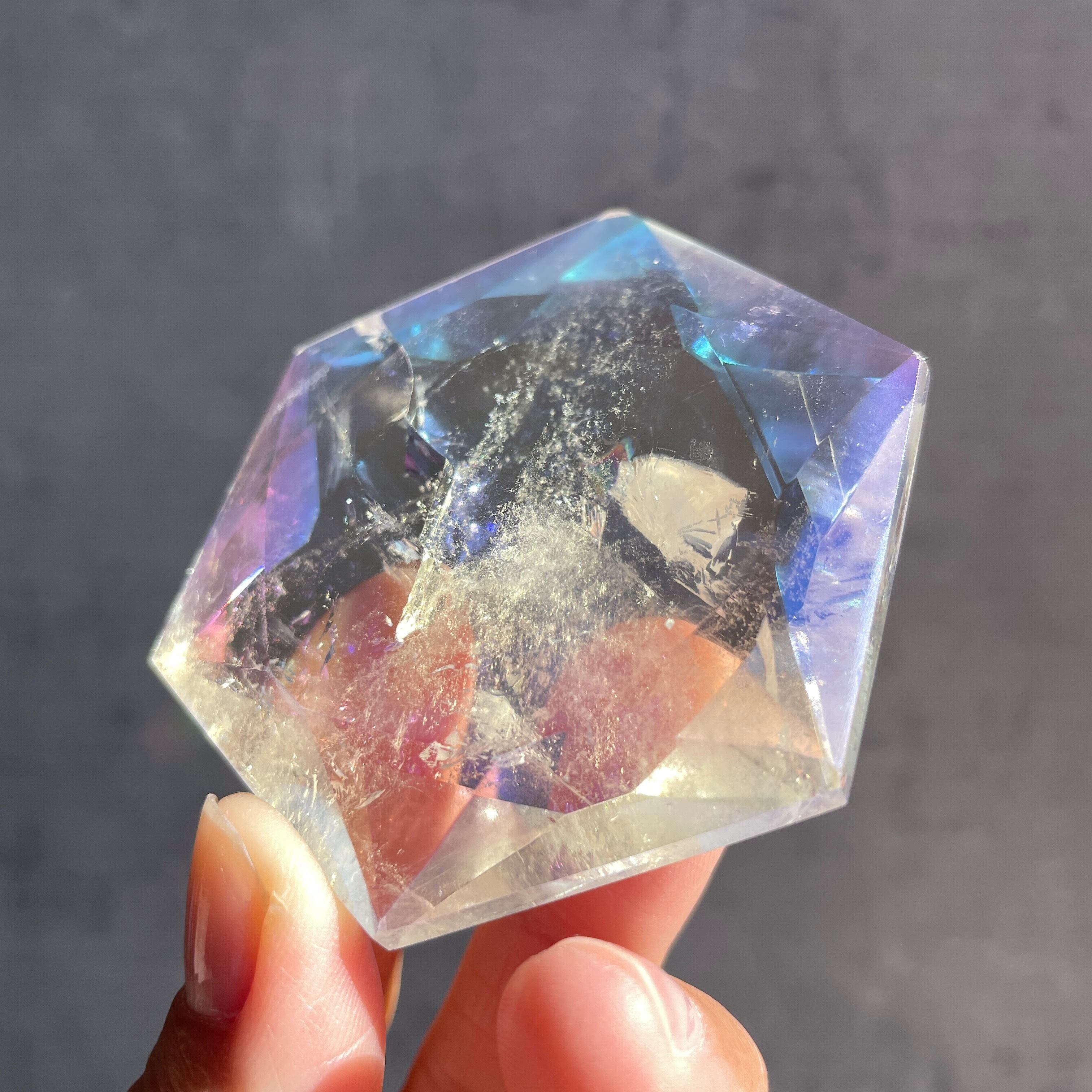ヘキサグラム(六芒星)とヘキサゴン(六角形)を組み合わせたカットを施したクリアクォーツに、エンジェルオーラ加工を施しました。