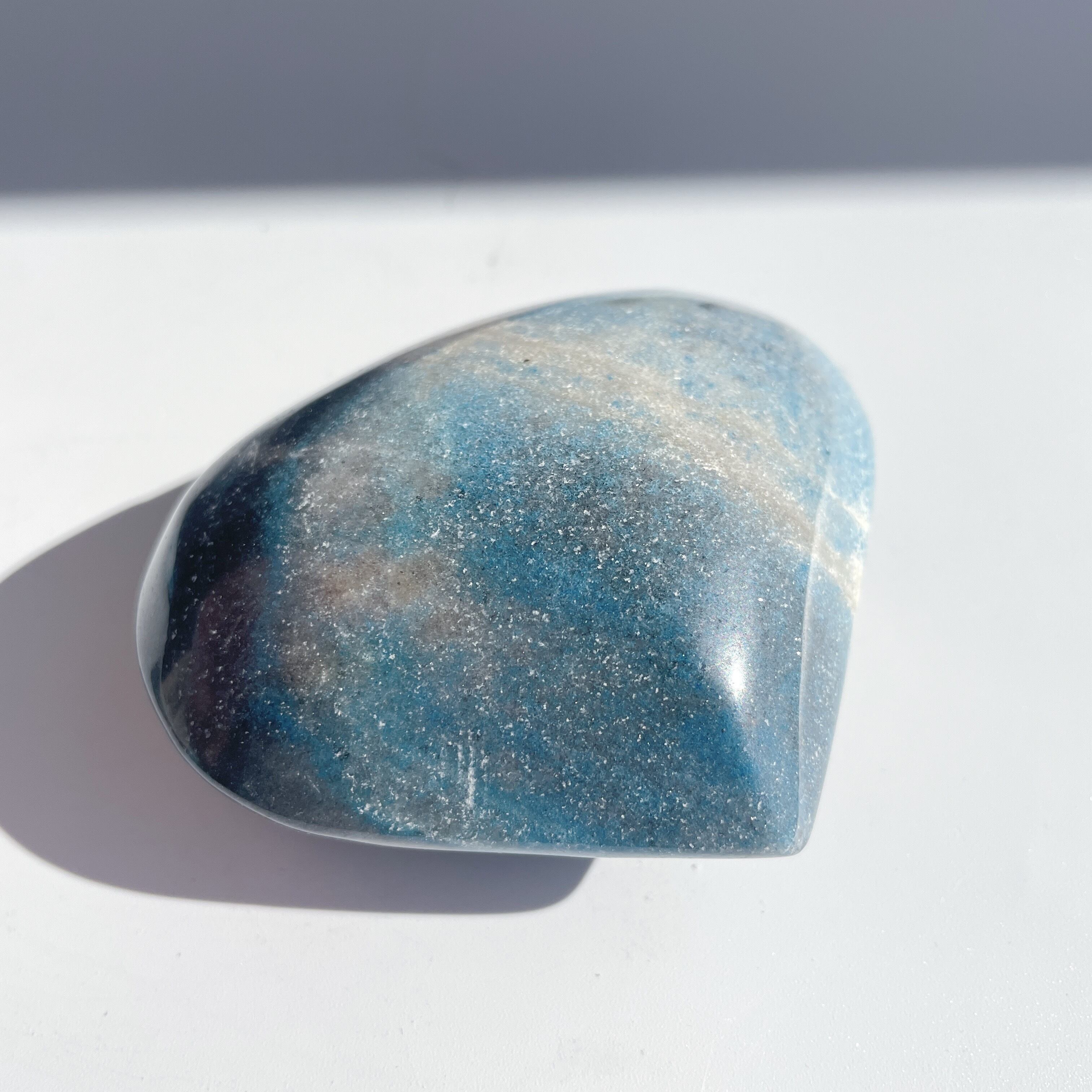 ここでは「トロレアイト」と呼びますが、トロレアイト(青)・クォーツ(白)・ラズライト(濃い青)が混じったもののようで、曲線を描くグラデーションと引き込まれるような色合いを持つ鉱石です。面によって異なる表情を見せる、世界に二つとないお品です。