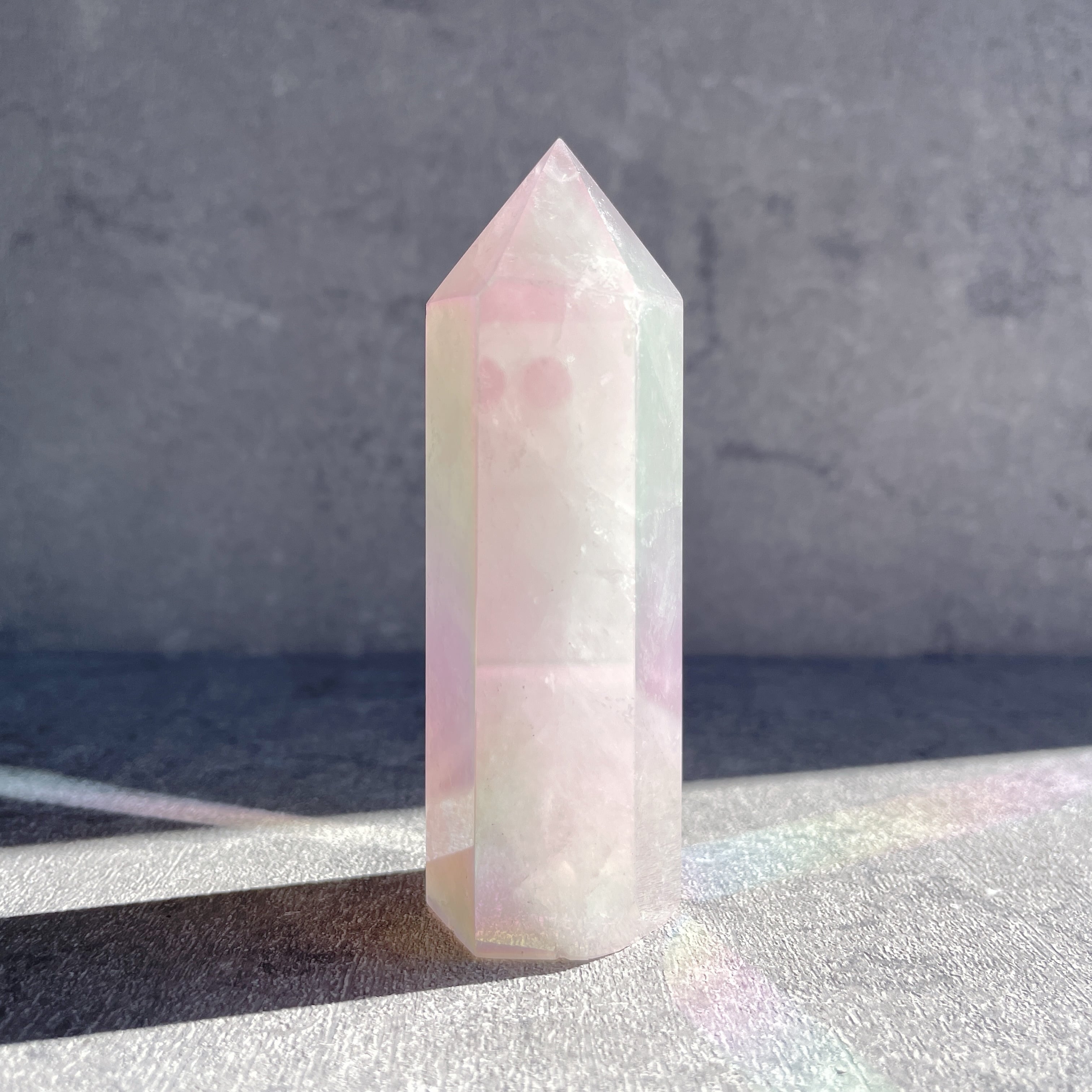 本品はローズクォーツのタワーに、エンジェルオーラ加工を施したもの◎