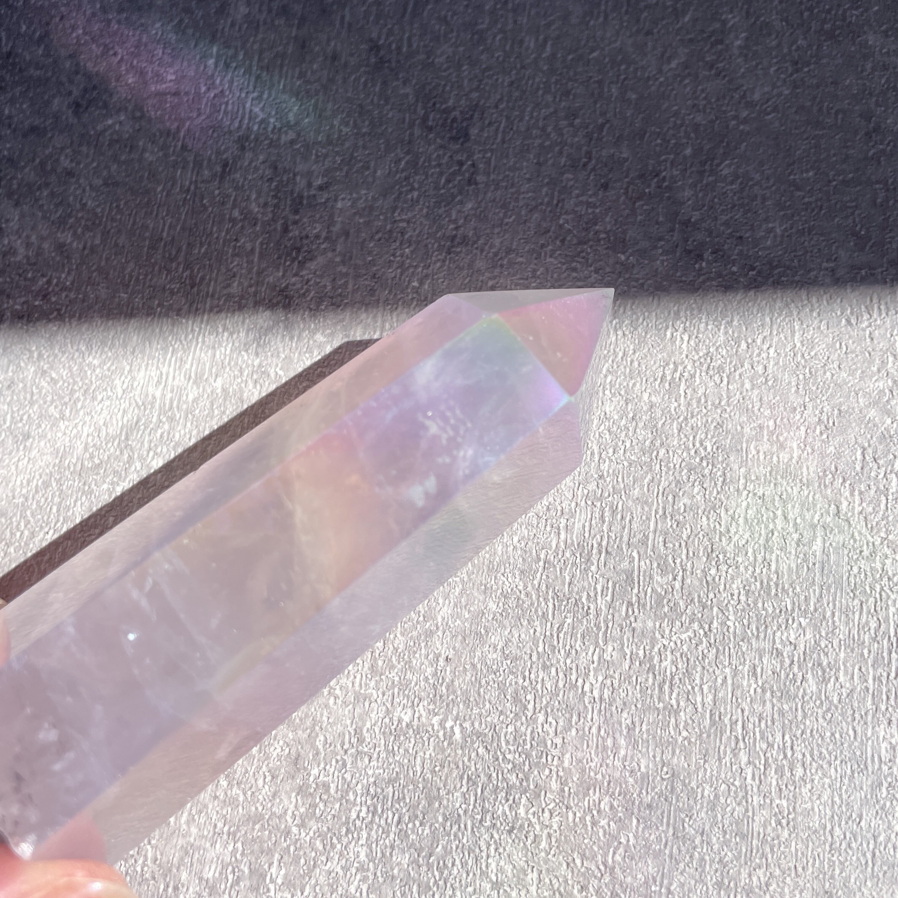 オーラクォーツとは天然の水晶に真空状態で金属を癒着コーティングさせた、新時代のクリスタルです。本品はローズクォーツのタワーに、エンジェルオーラ加工を施したもの◎