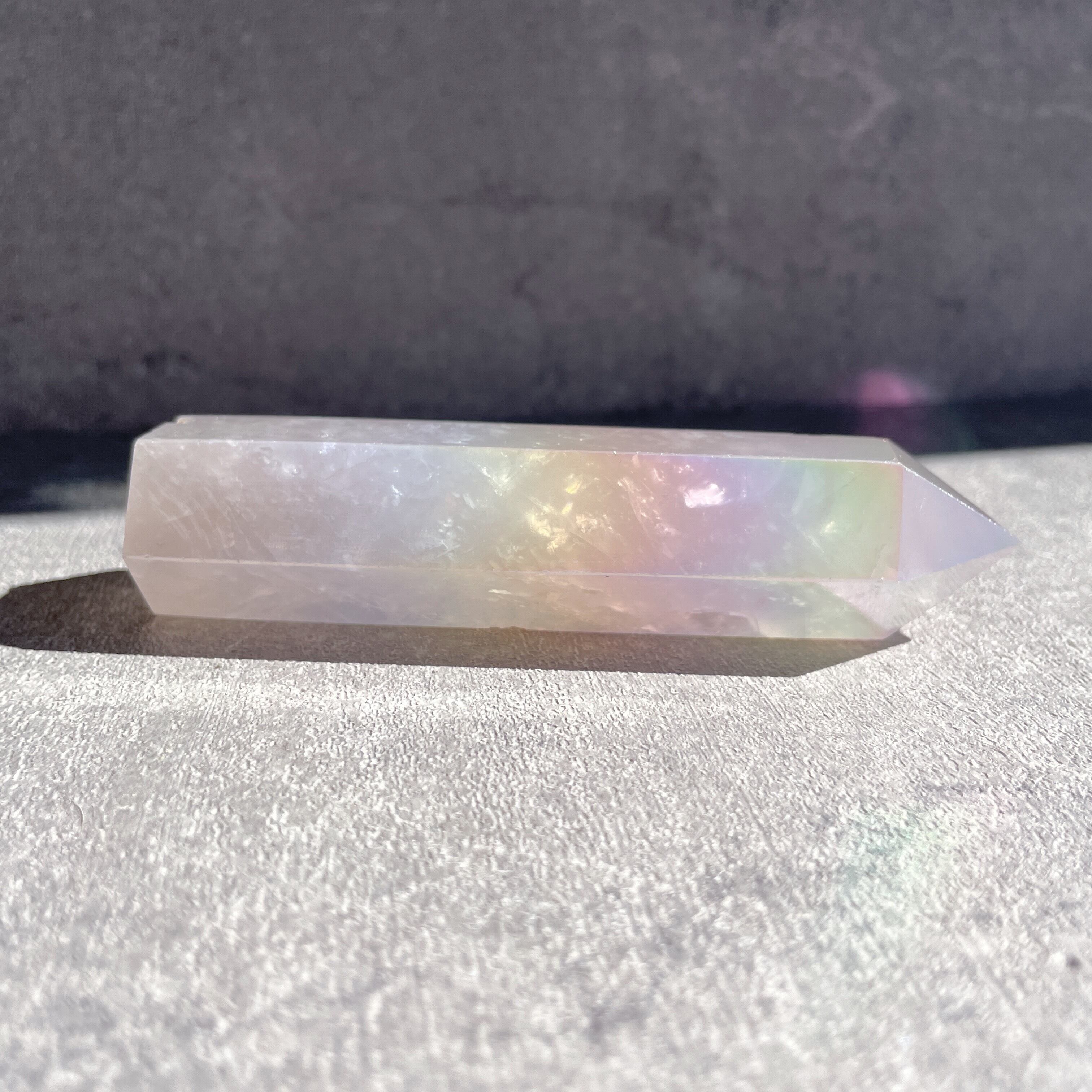 オーラクォーツとは天然の水晶に真空状態で金属を癒着コーティングさせた、新時代のクリスタルです。本品はローズクォーツのタワーに、エンジェルオーラ加工を施したもの◎