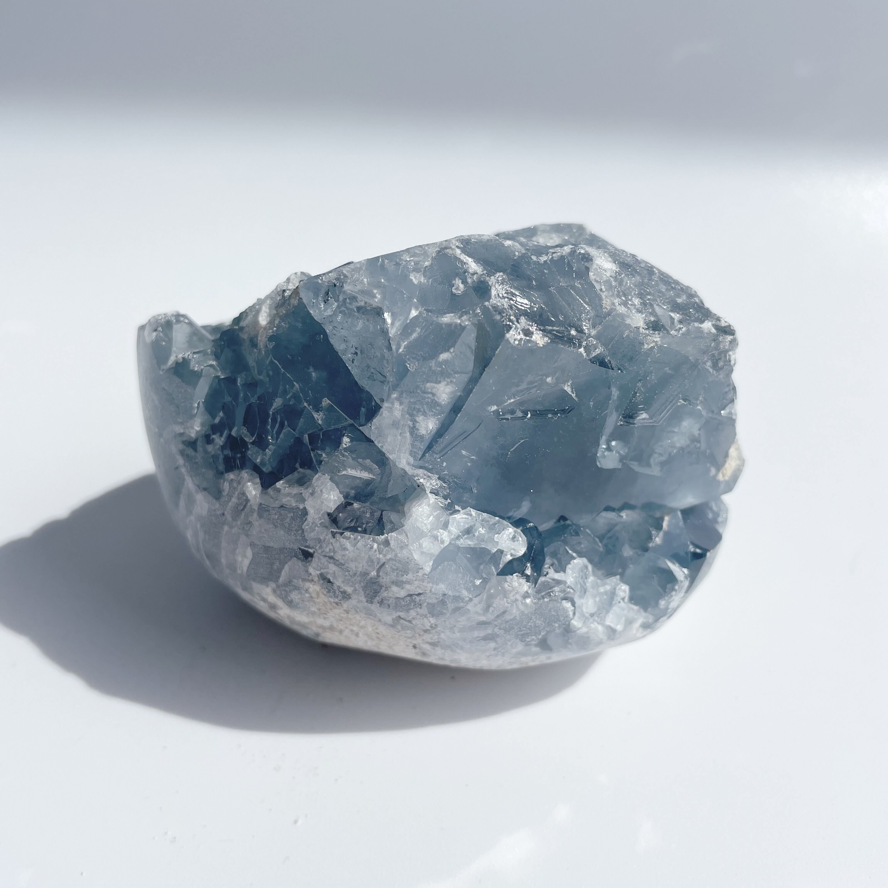 幾多あるブルーの天然石の中でも、晴れた空の穏やかさに最も近い印象があるのがセレスタイト。柔らかく色味、優しい輝きから、エンジェルを連想する人も多いようです。