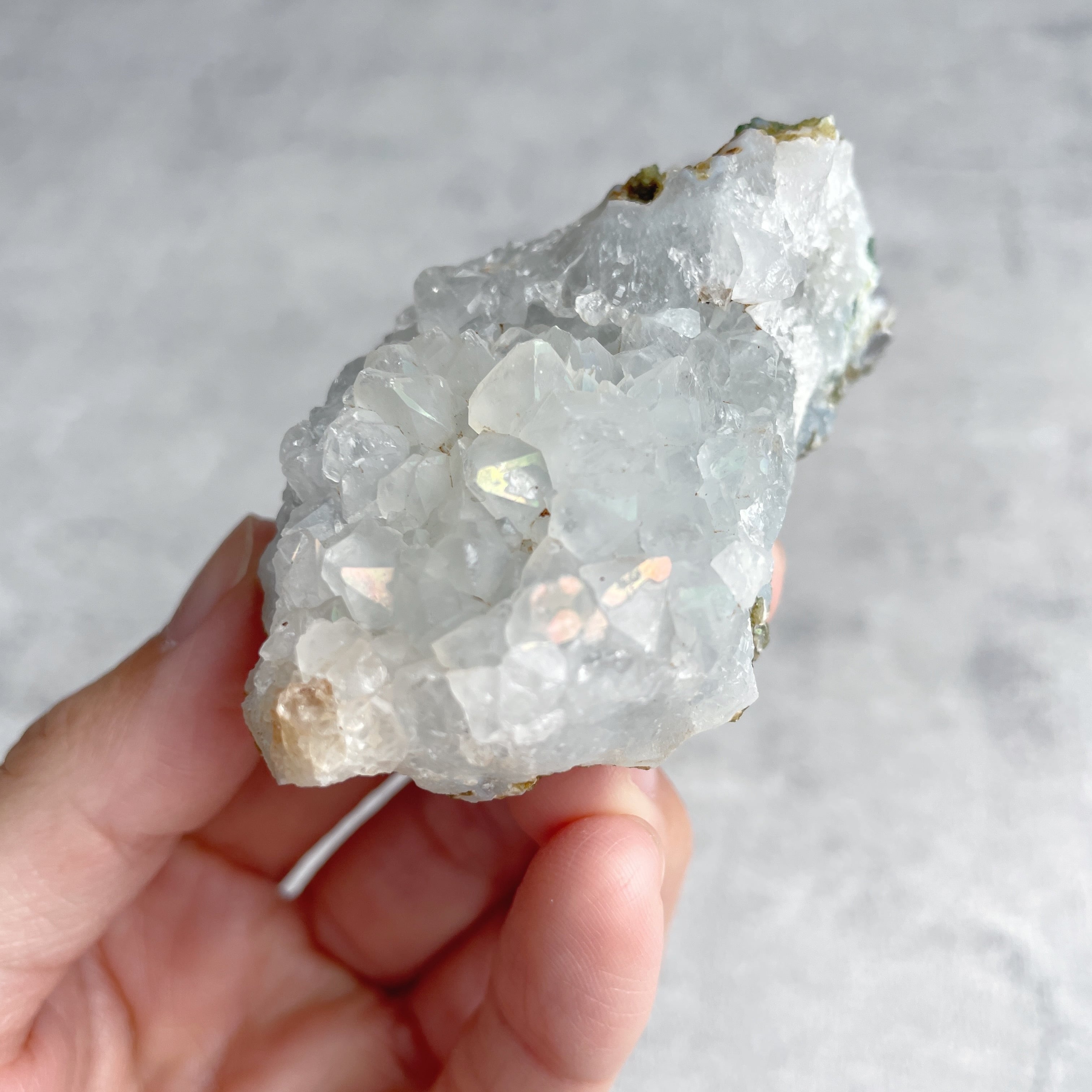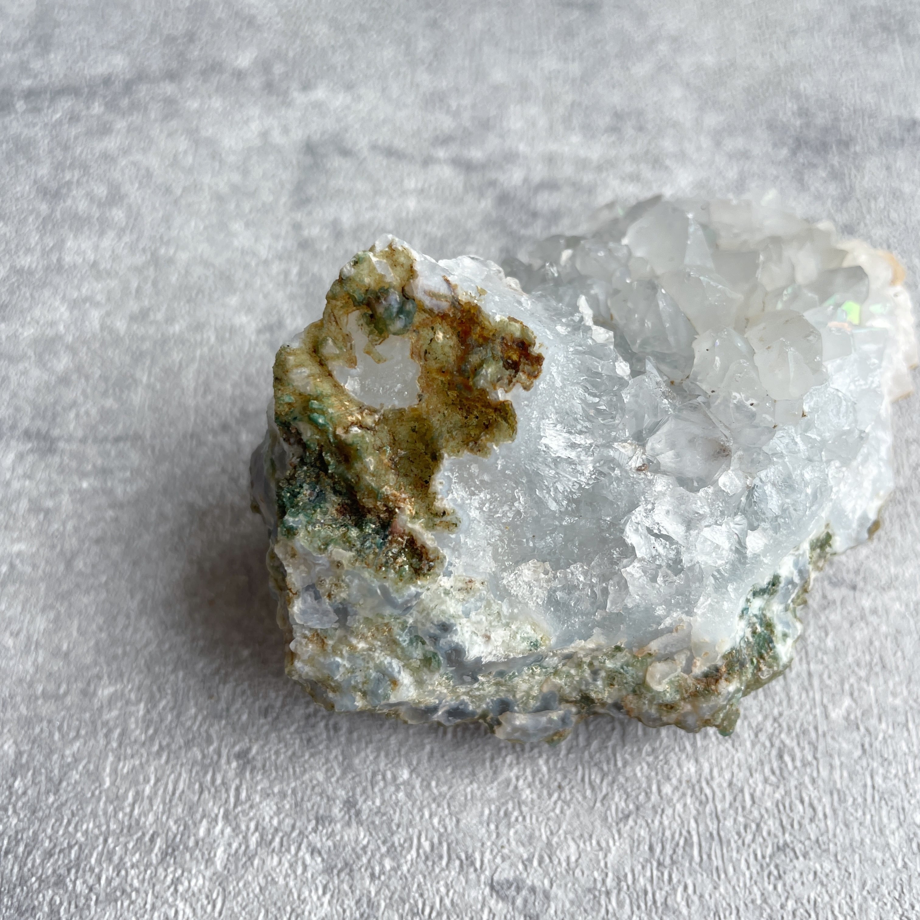 ファセット(結晶の先の面)に、七色のイリデッセンス(遊色効果)を持つのが特徴。