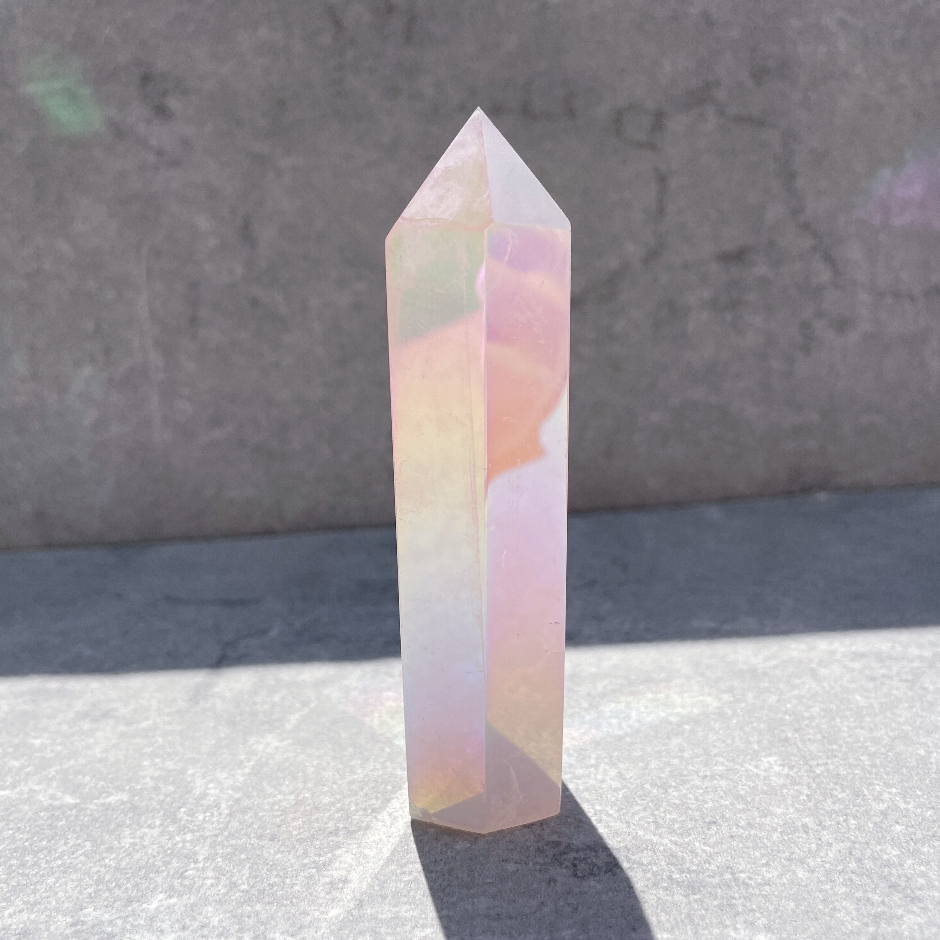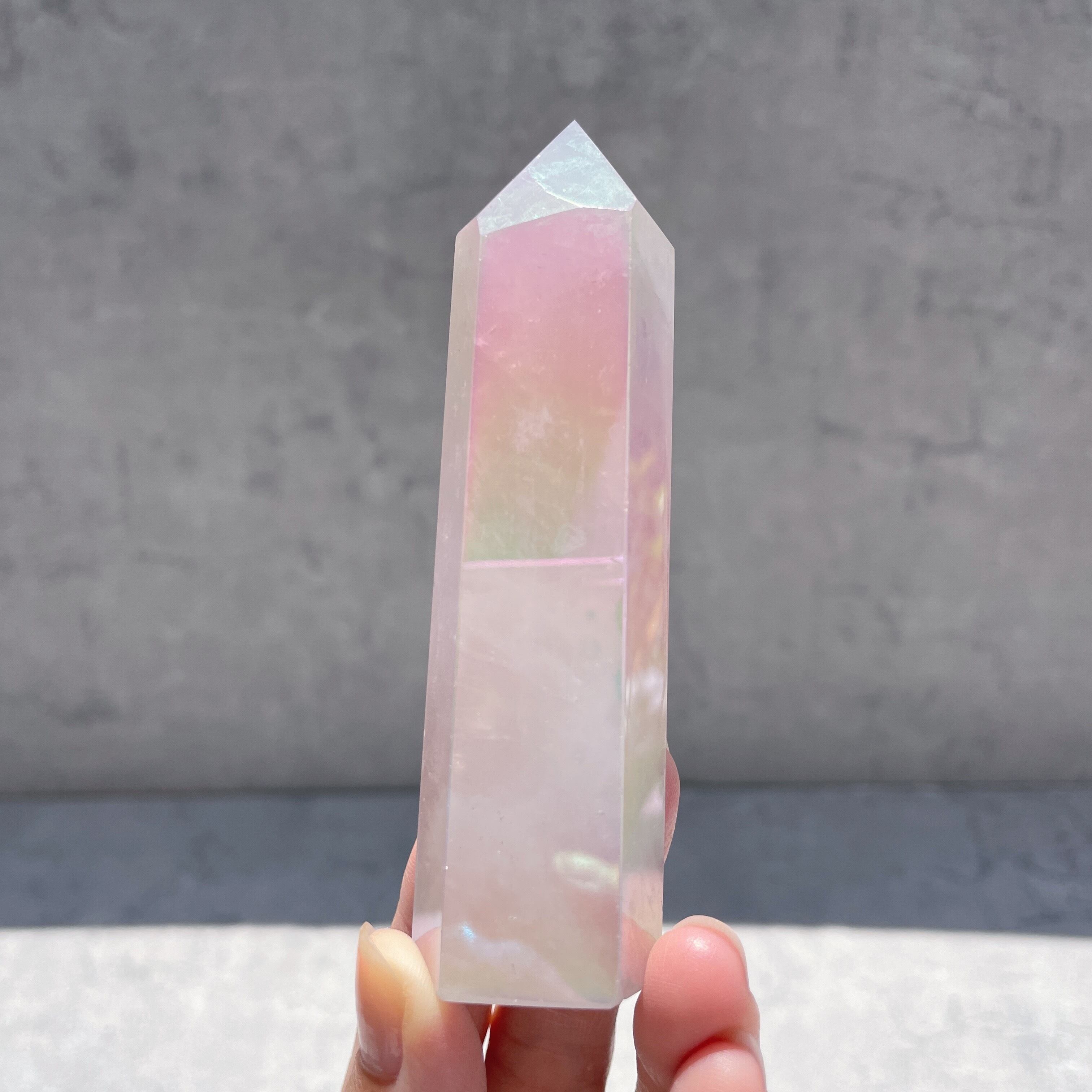 オーラクォーツとは天然の水晶に真空状態で金属を癒着コーティングさせた、新時代のクリスタルです。本品はローズクォーツのタワーに、エンジェルオーラ加工を施したもの◎