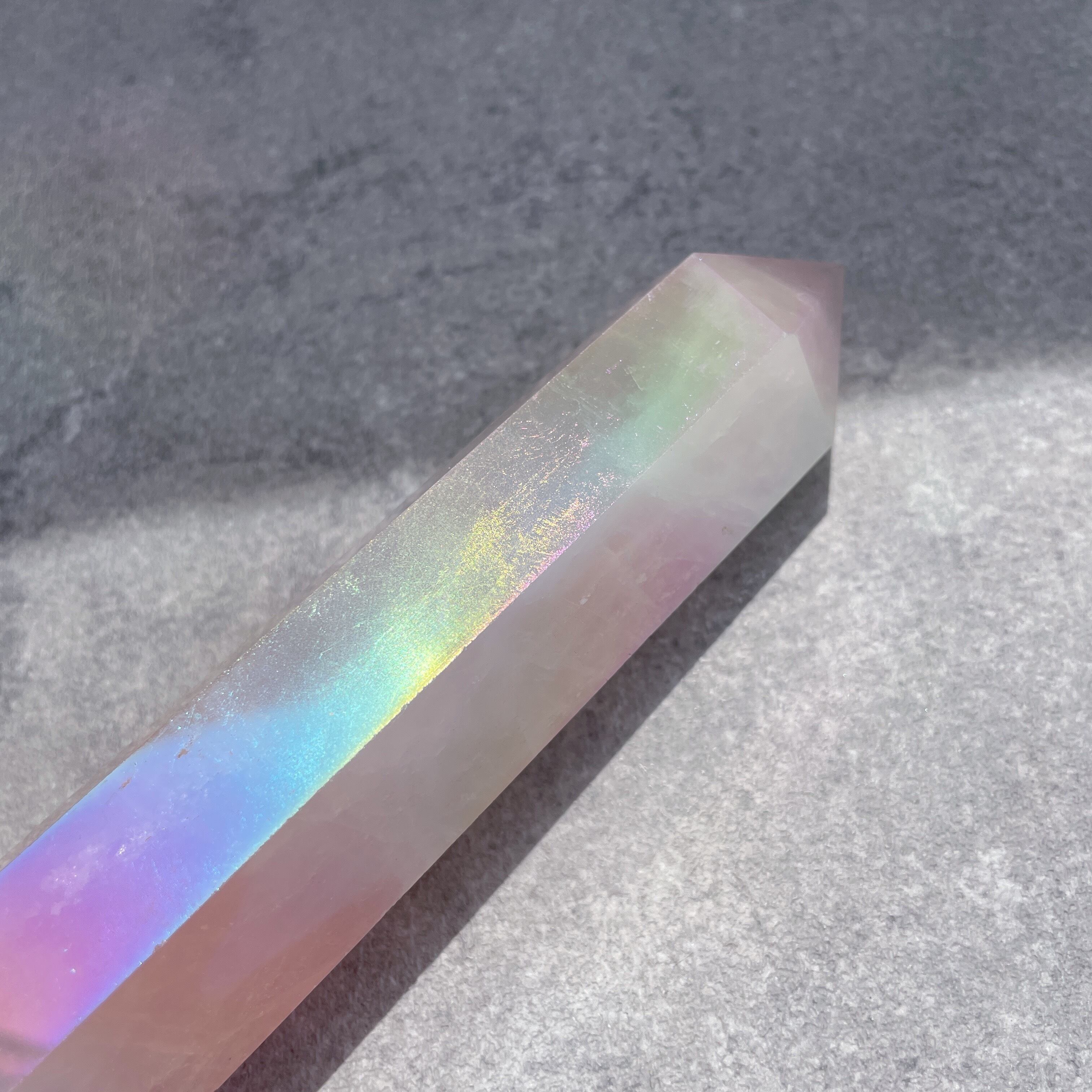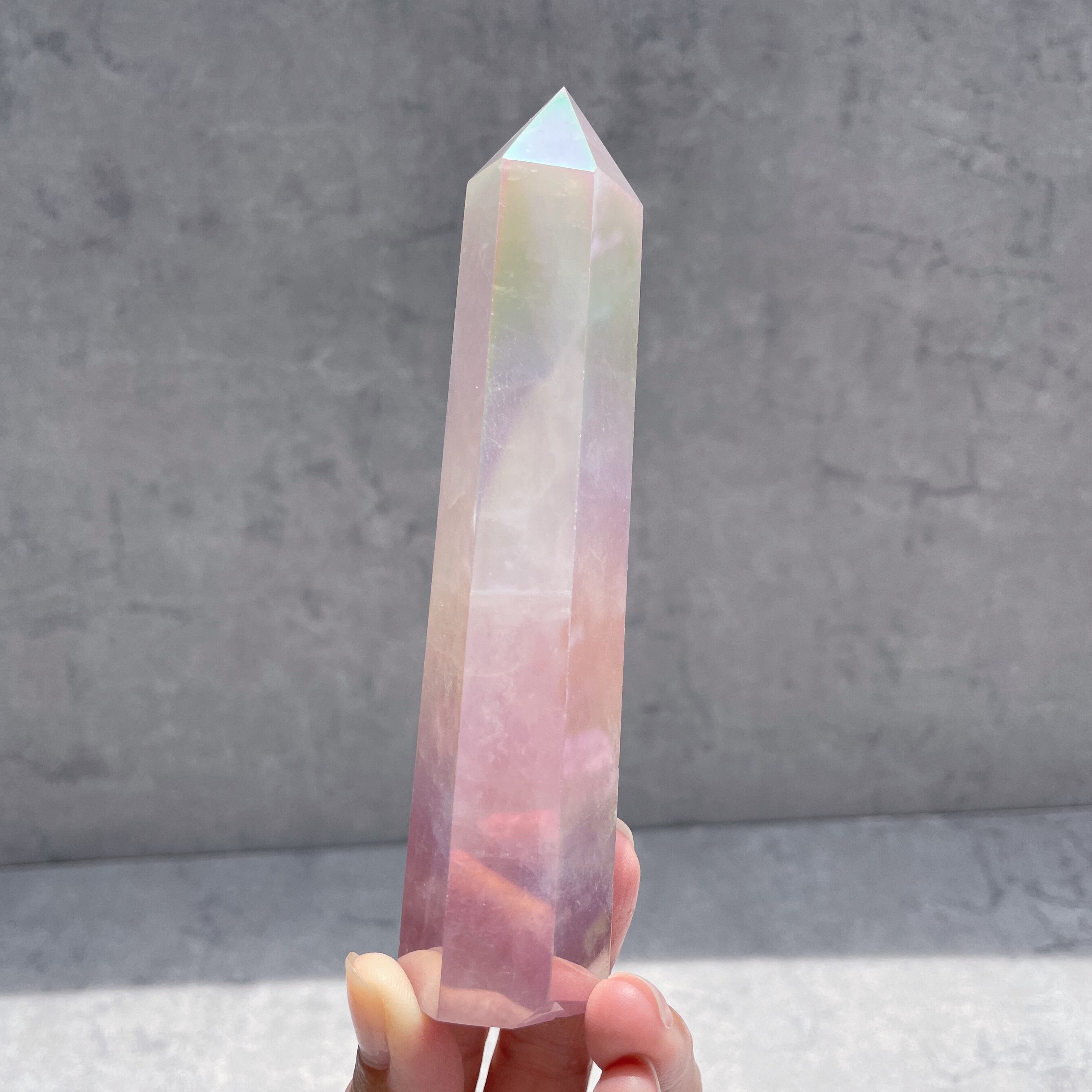 オーラクォーツとは天然の水晶に真空状態で金属を癒着コーティングさせた、新時代のクリスタルです。本品はローズクォーツのタワーに、エンジェルオーラ加工を施したもの◎