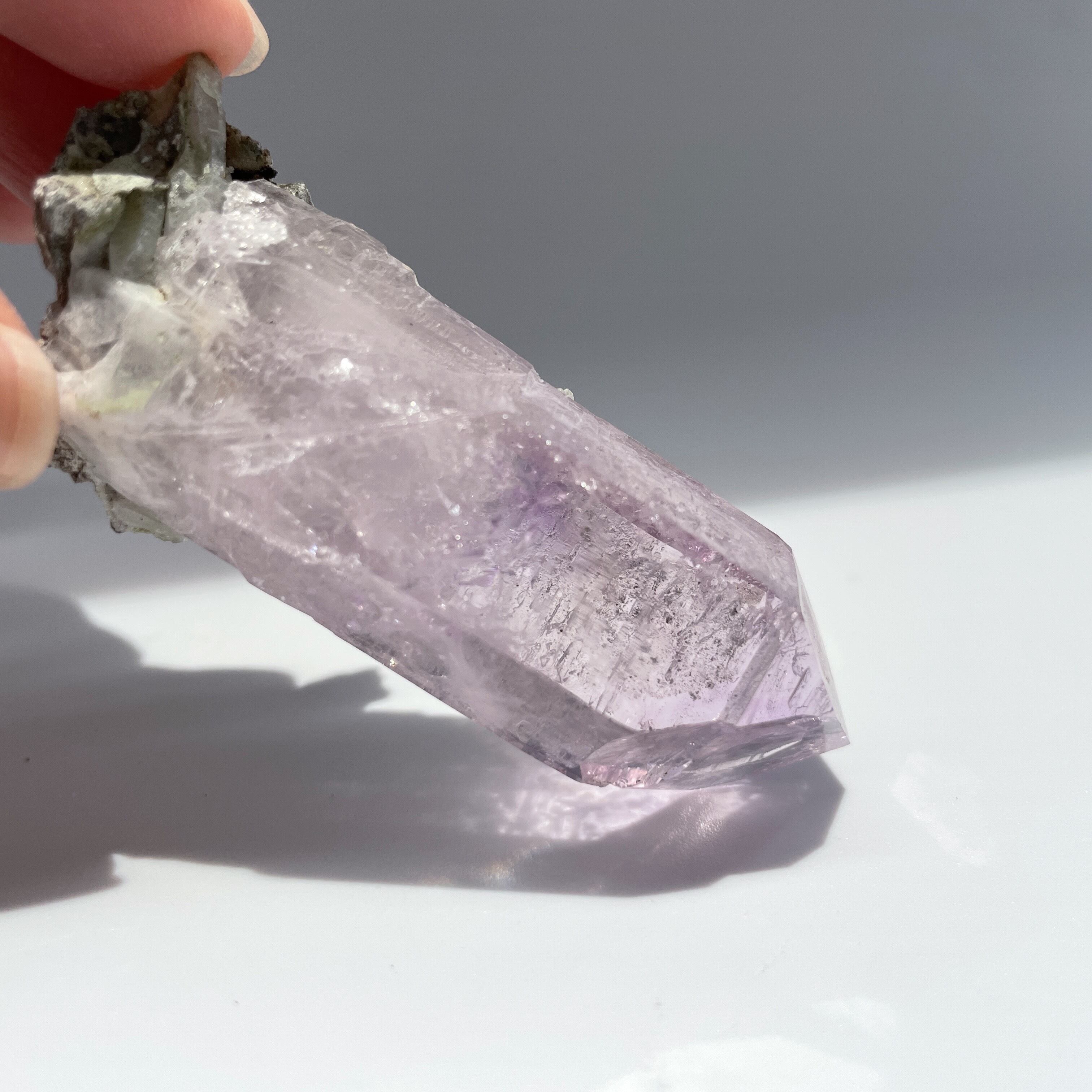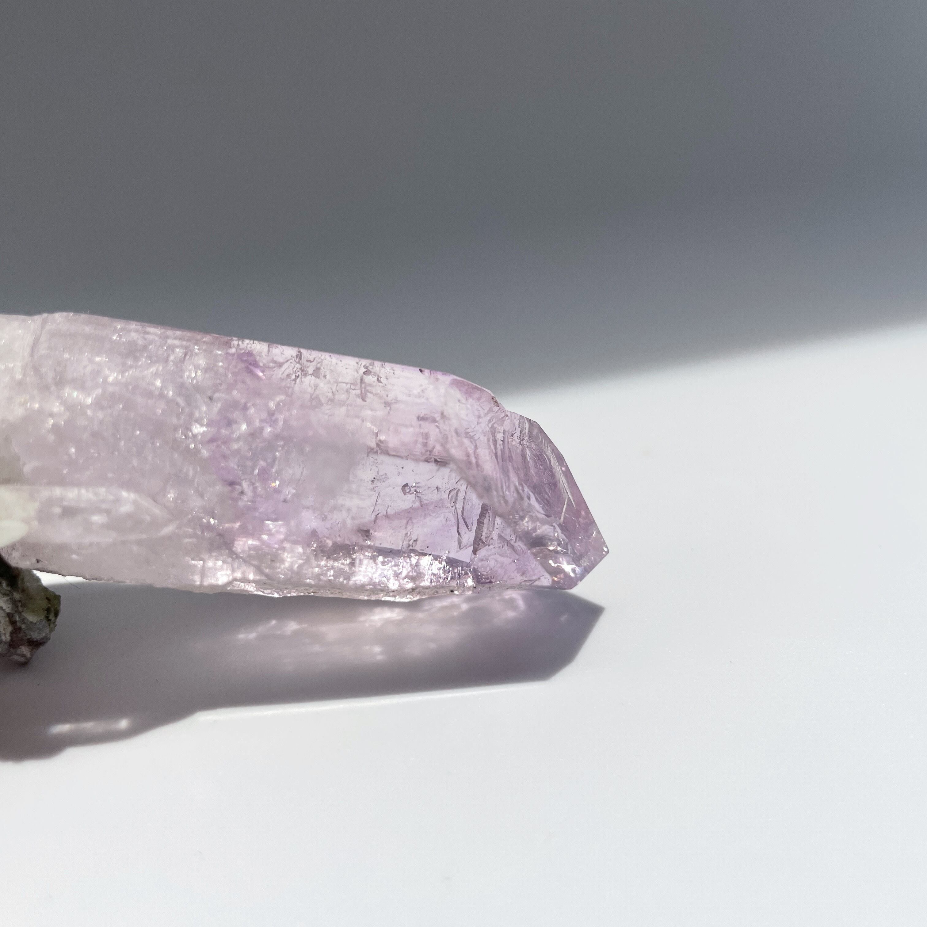 結晶のサイドには成長線(レムリアンレッジ)がくっきりとみられ、