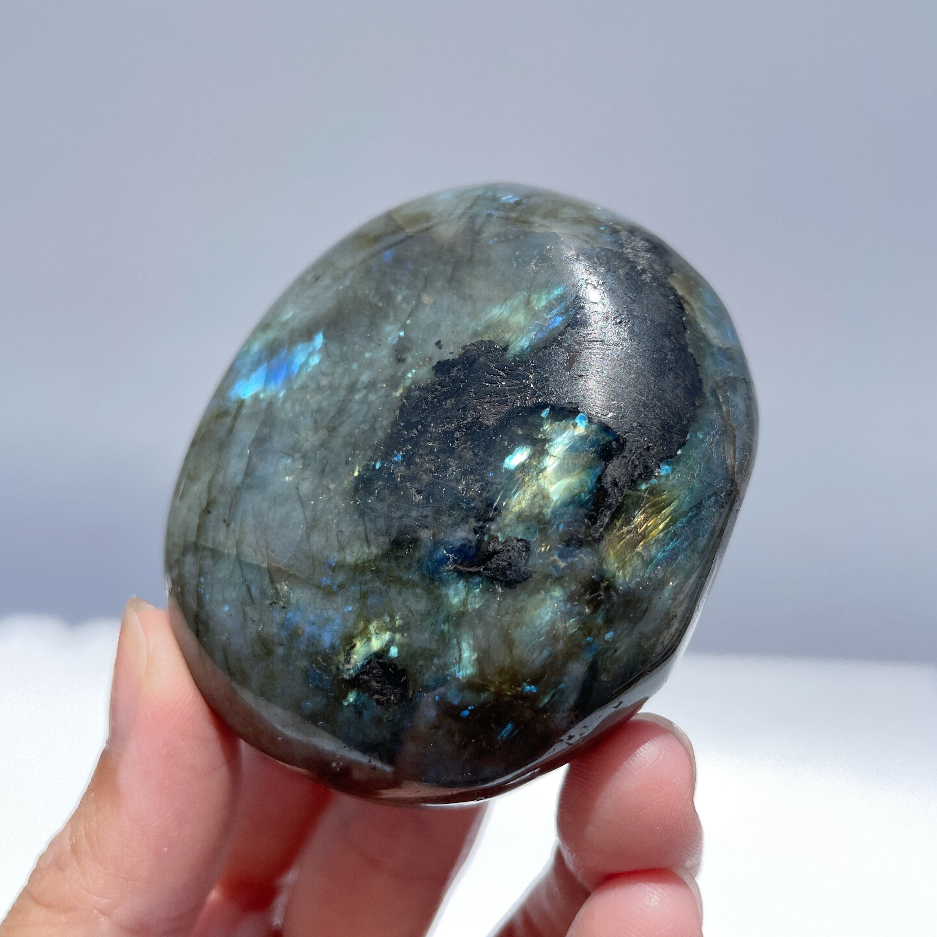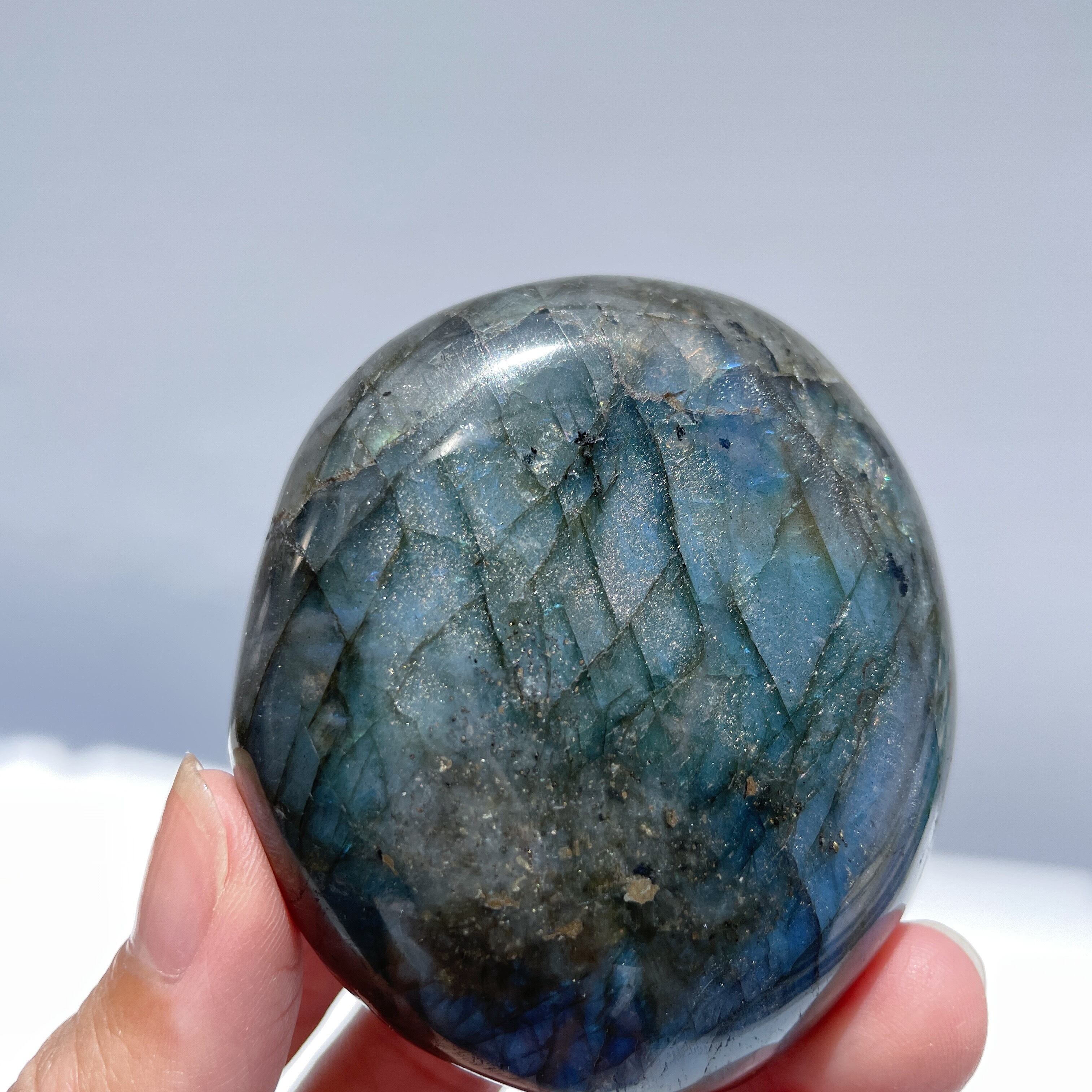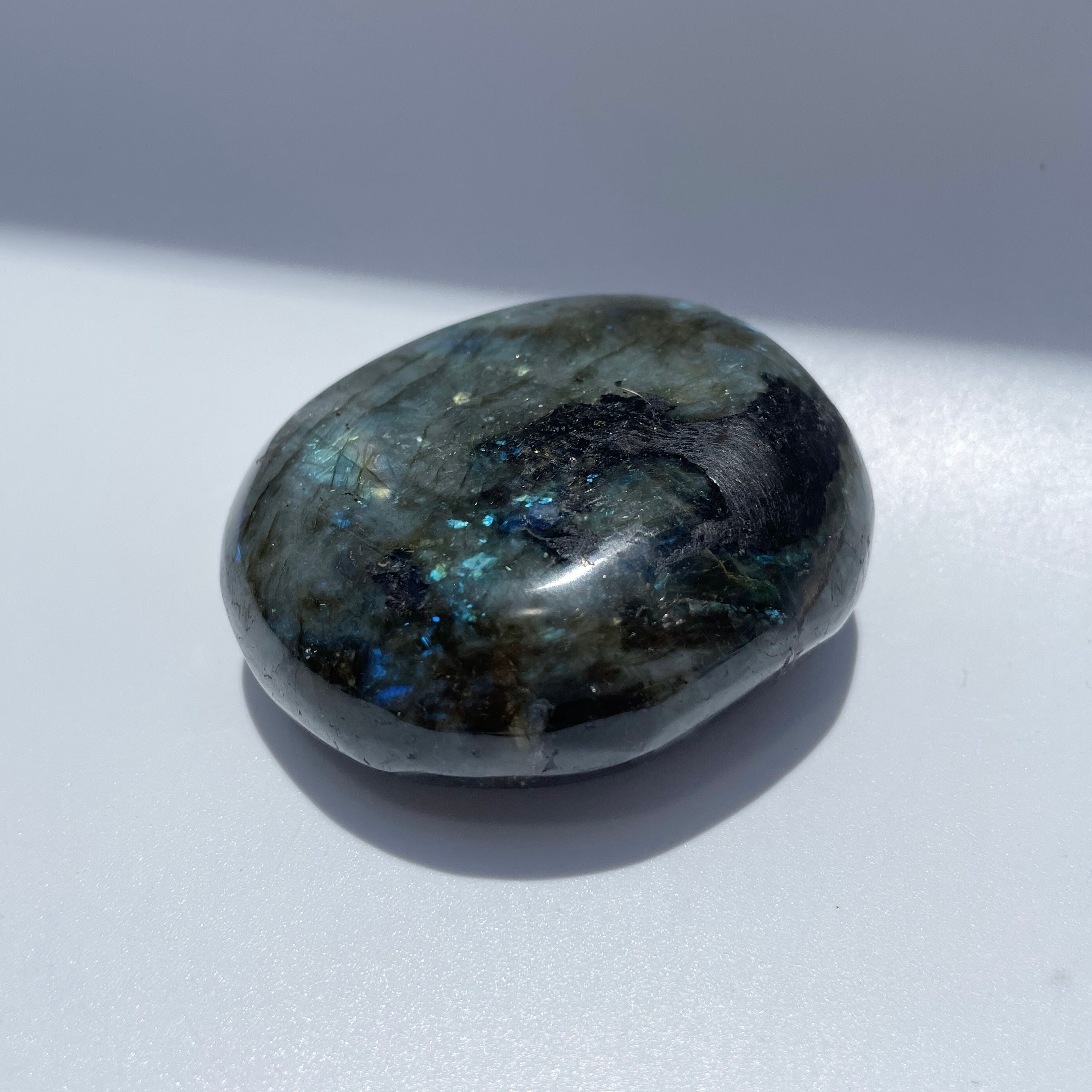 マダガスカル産のラブラドライトのパームストーン(手のひらサイズの石)の登場です。