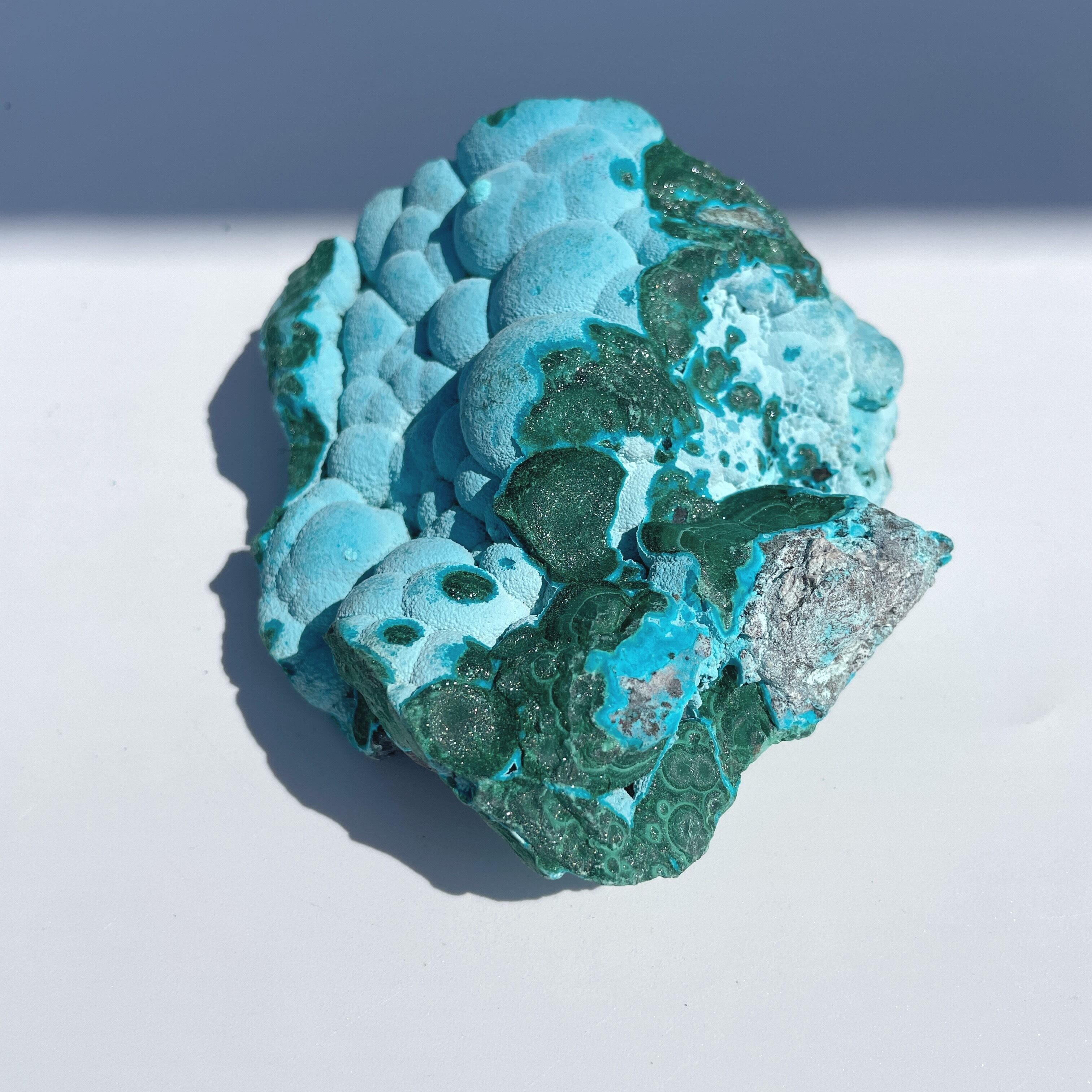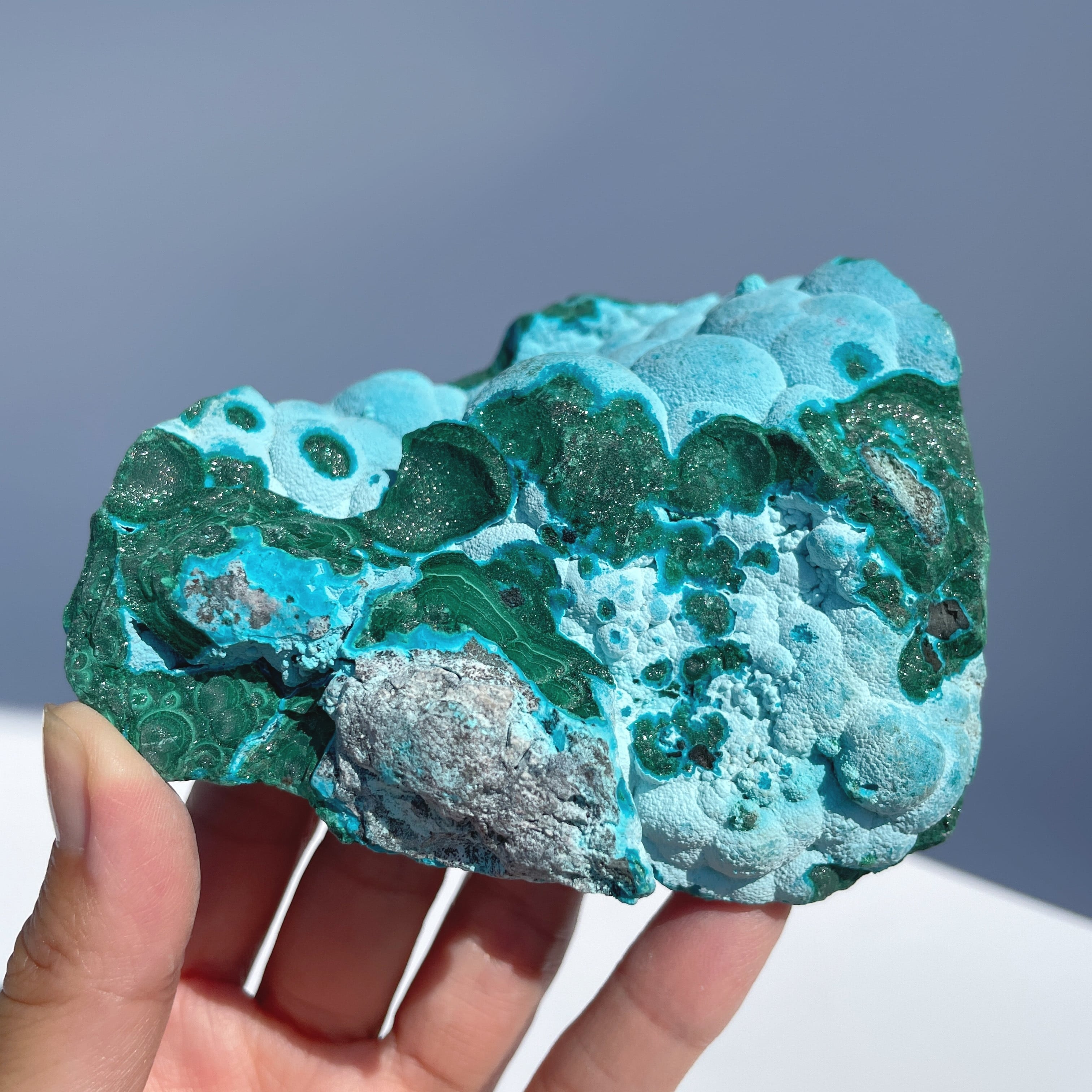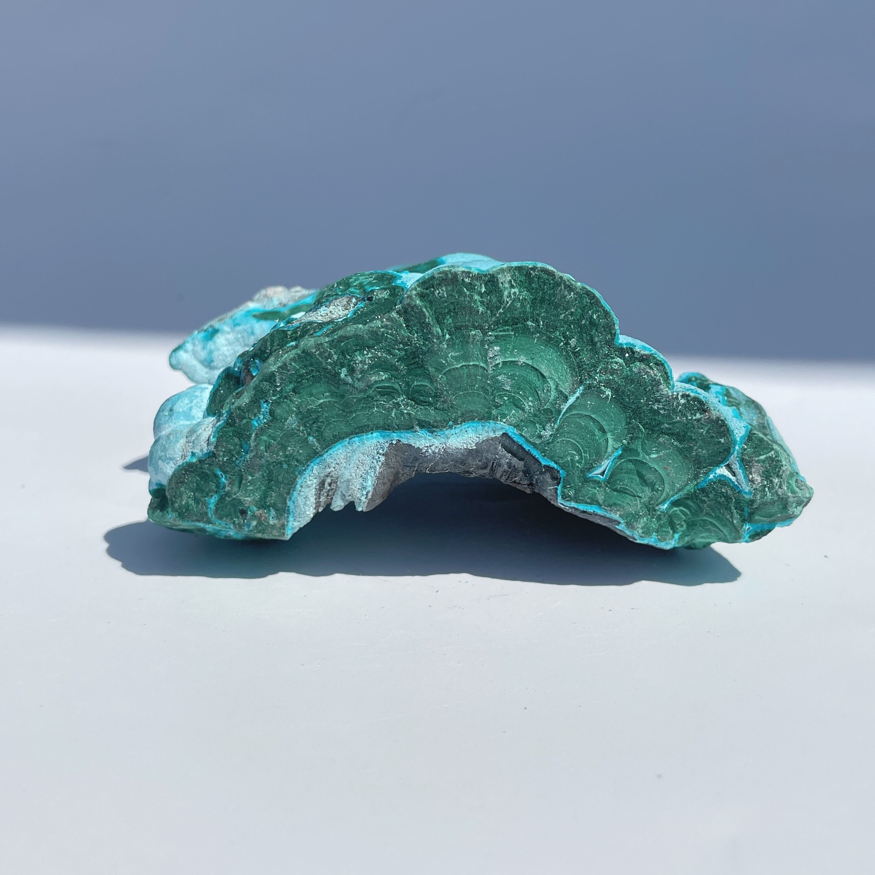 深緑のマラカイトと、ターコイズブルーのクリソコラが共生した鉱物。