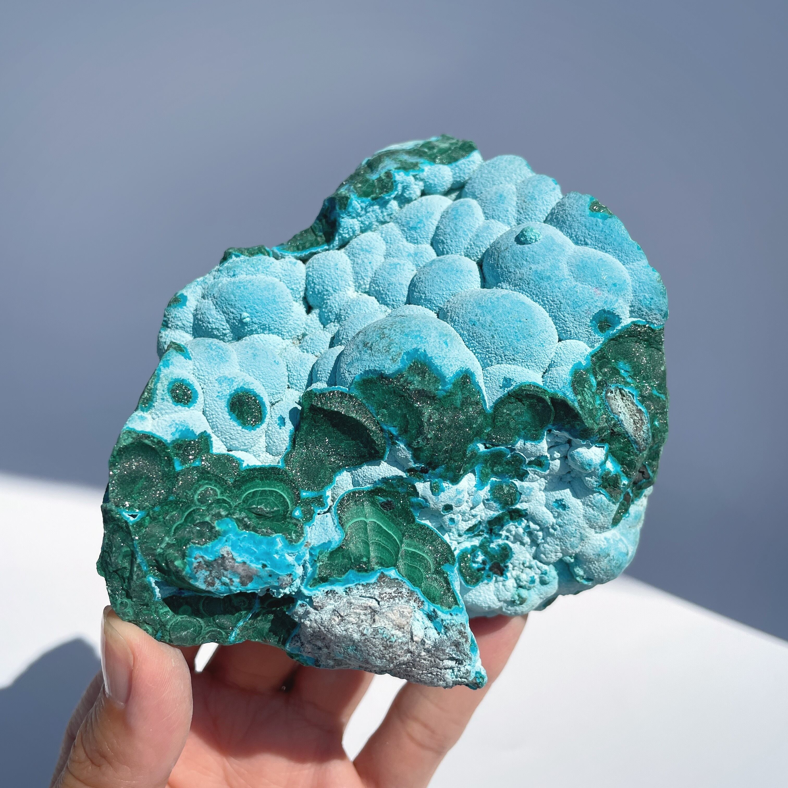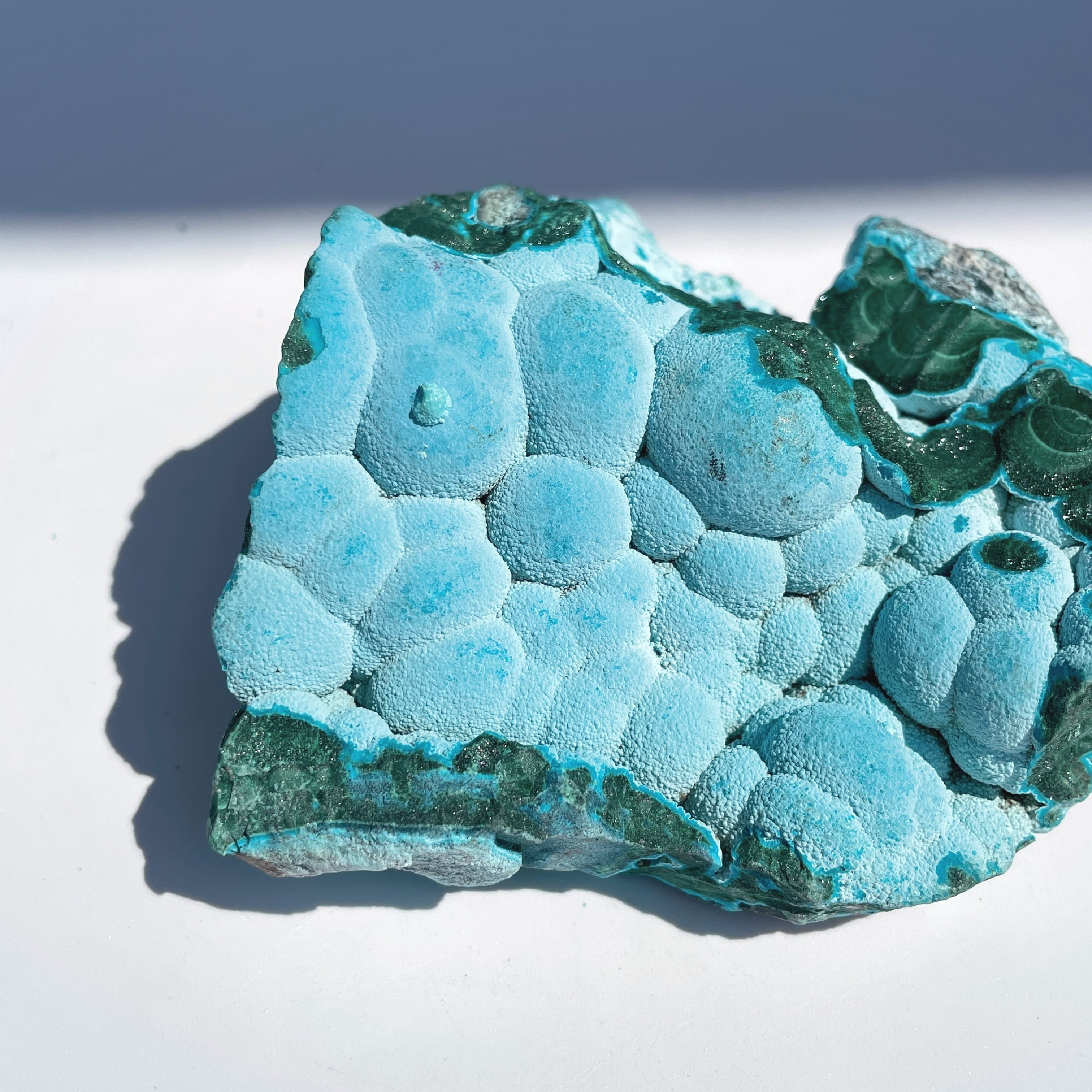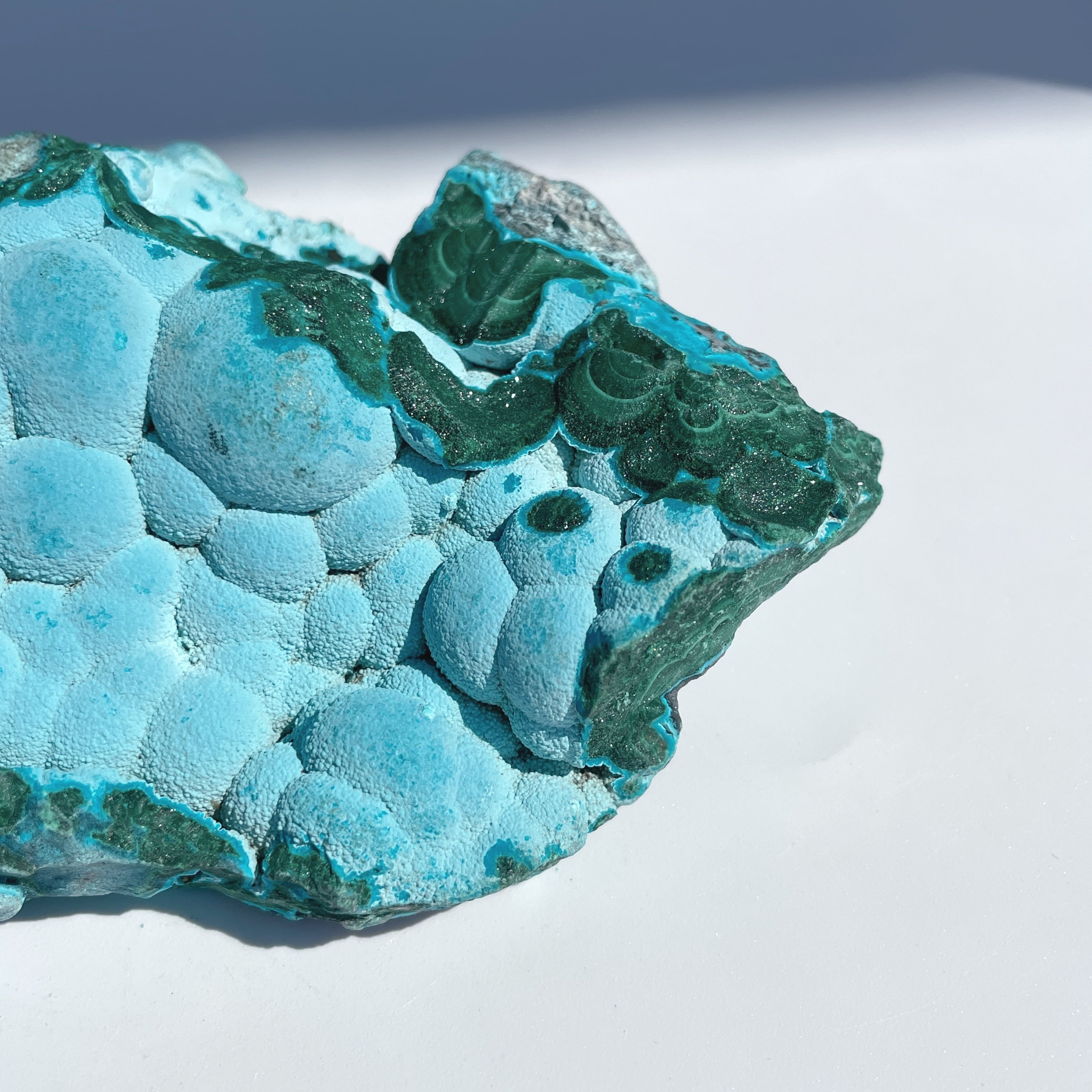深緑のマラカイトと、ターコイズブルーのクリソコラが共生した鉱物。