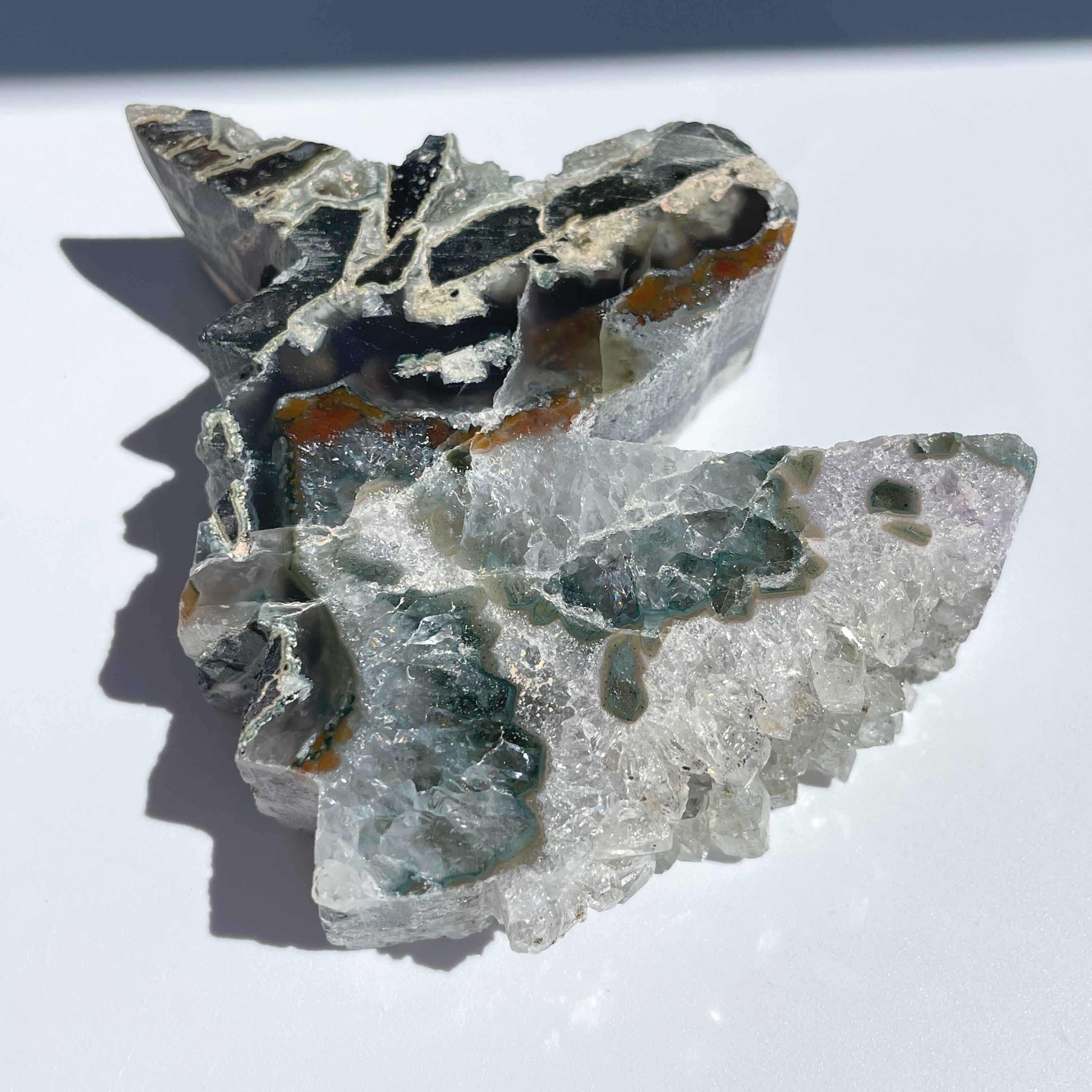 アゲート(瑪瑙)上にクリアクォーツが結晶化した原石をスライスし、ユニコーンの形に加工しました。