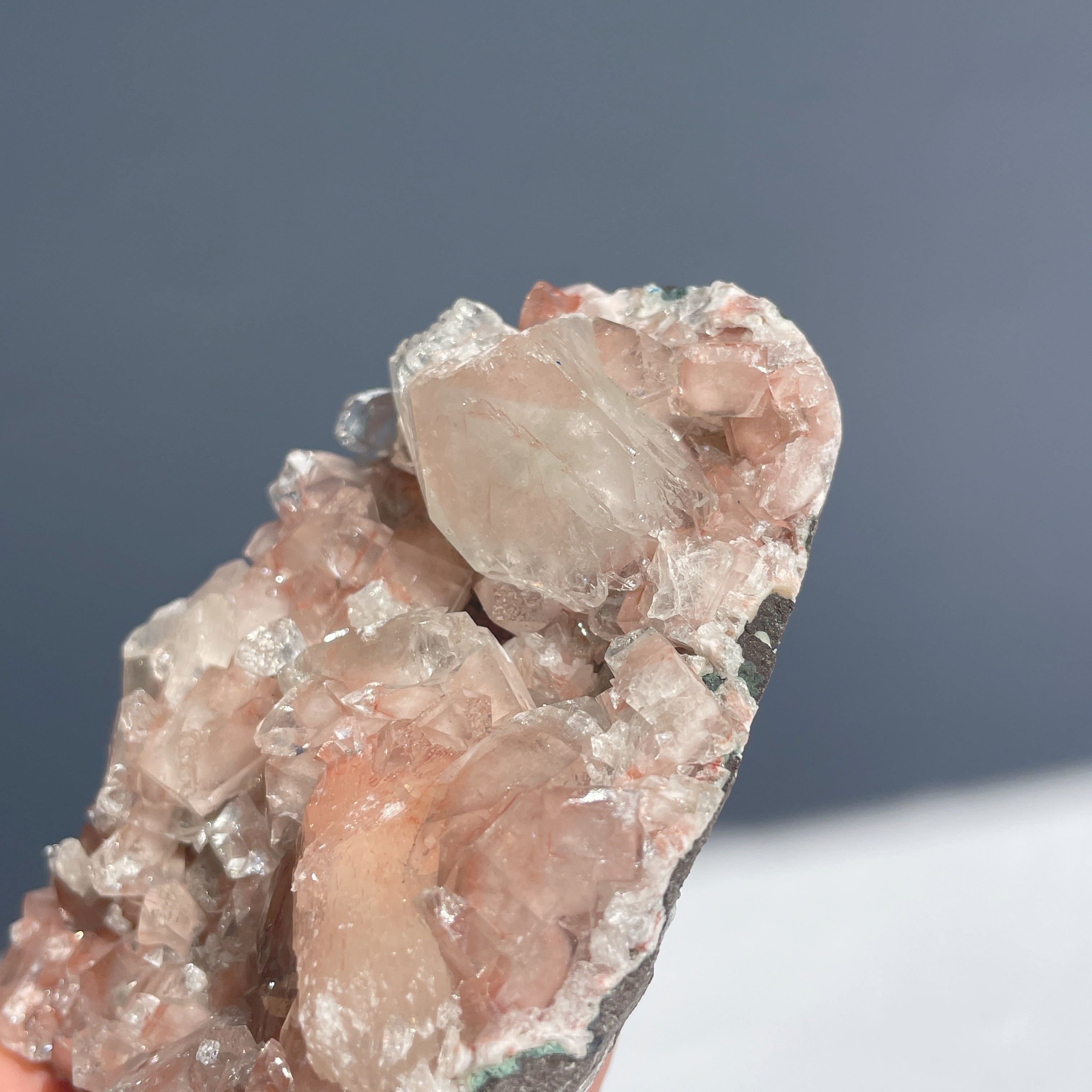 アポフィライトは結晶の強い輝きと、砂糖菓子のように繊細な結晶が魅力の鉱物。