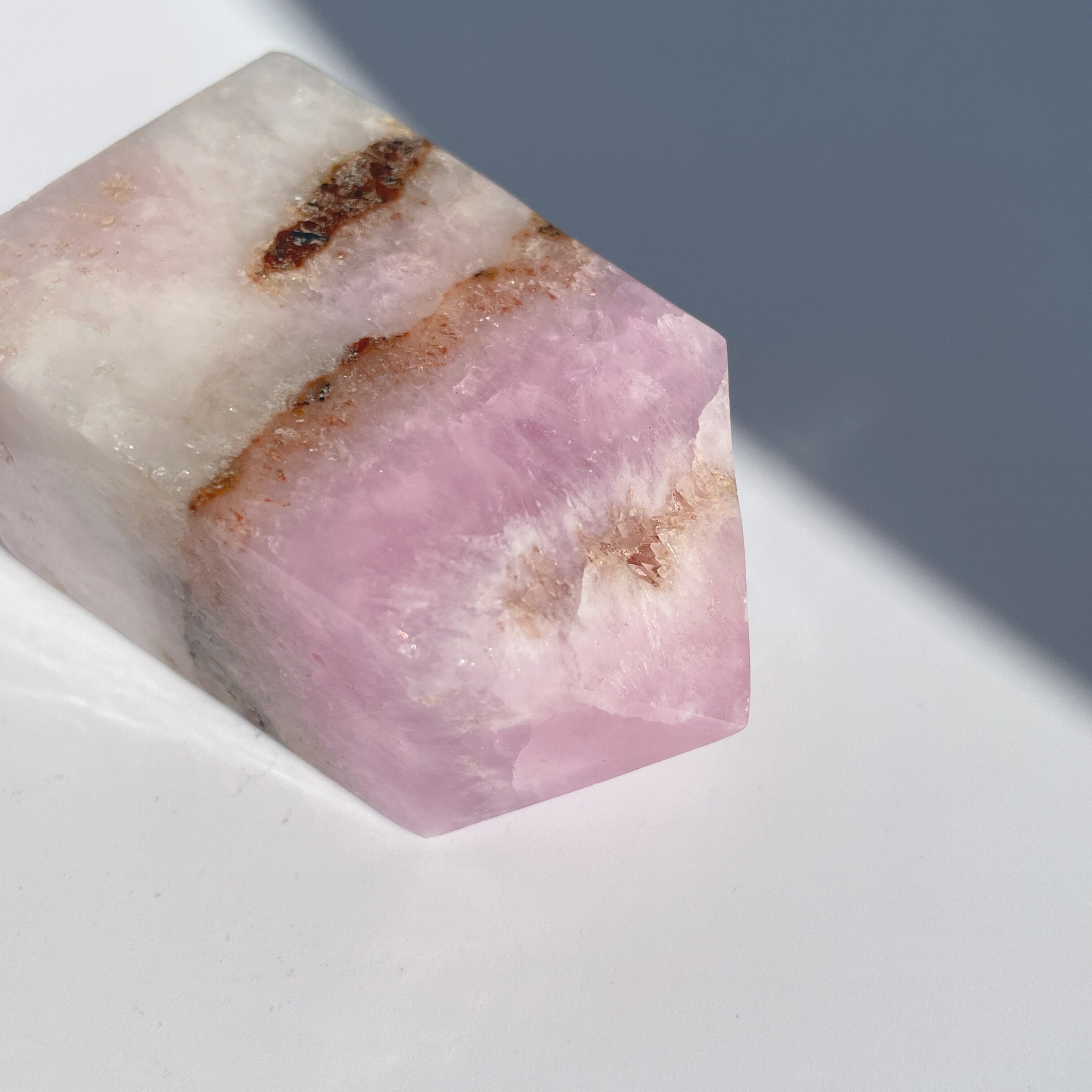 白色の部分も同じアラゴナイトです。アラゴナイト自体は世界中で産出する石ですが、このように、白とピンクが混じったものは、最近パキスタンで採掘されるようになったようで、他に類を見ない非常に珍しいものです✧
