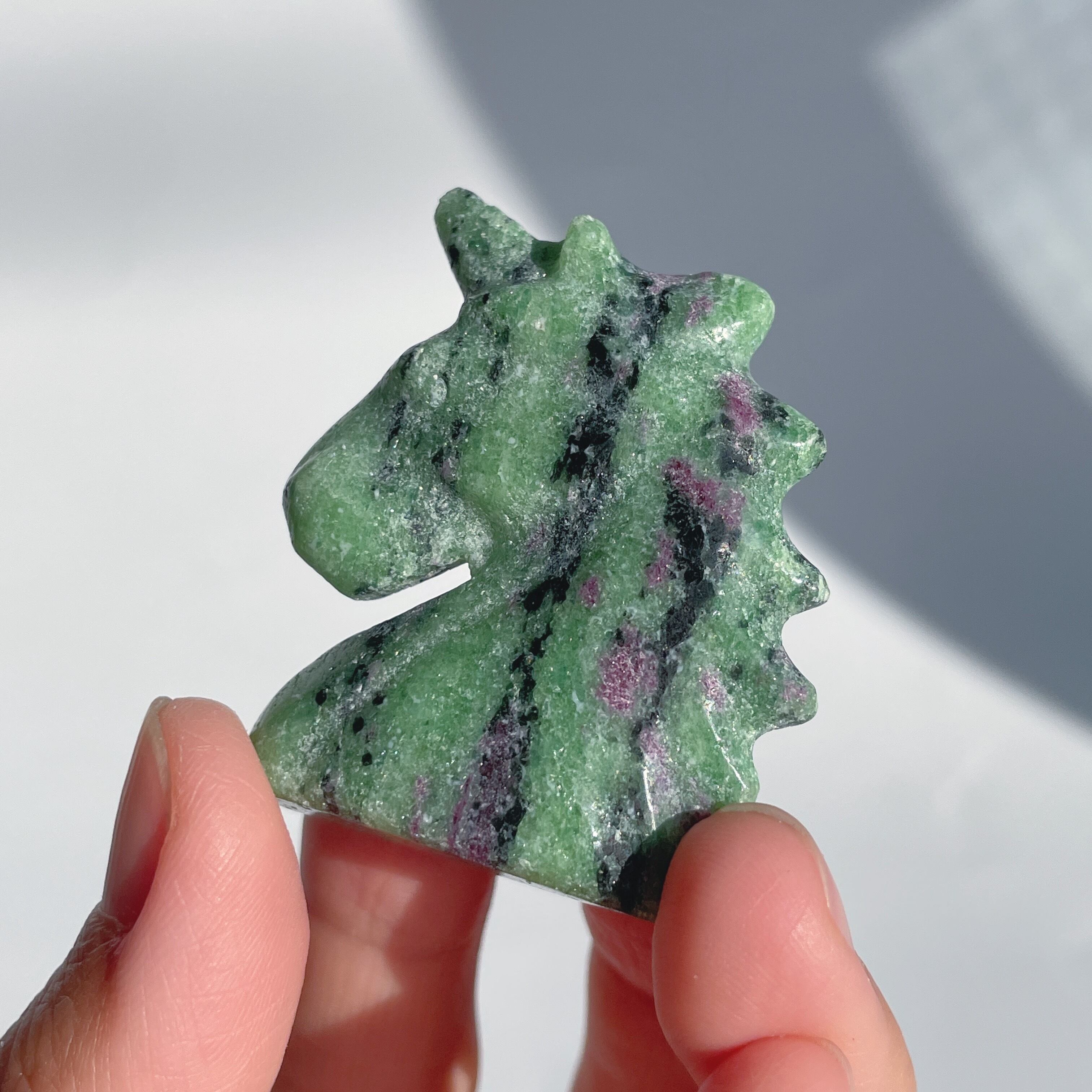 ゾイサイトにルビーが内包したルビーインゾイサイトが、手のひらサイズのユニコーンになりました。